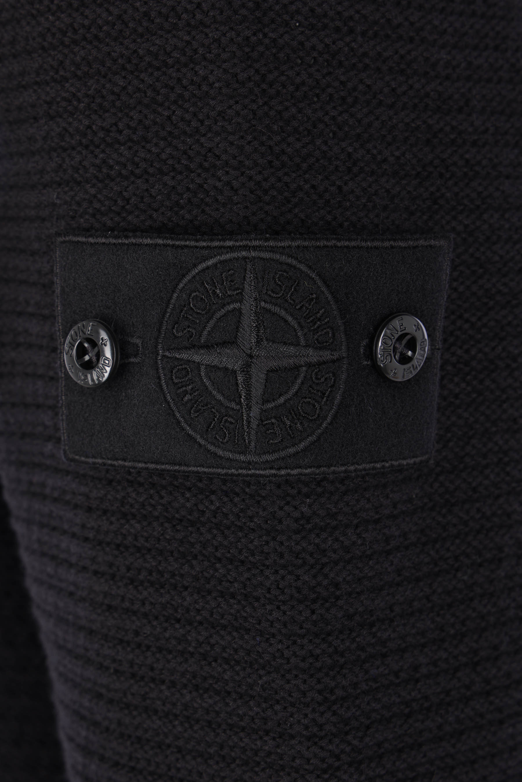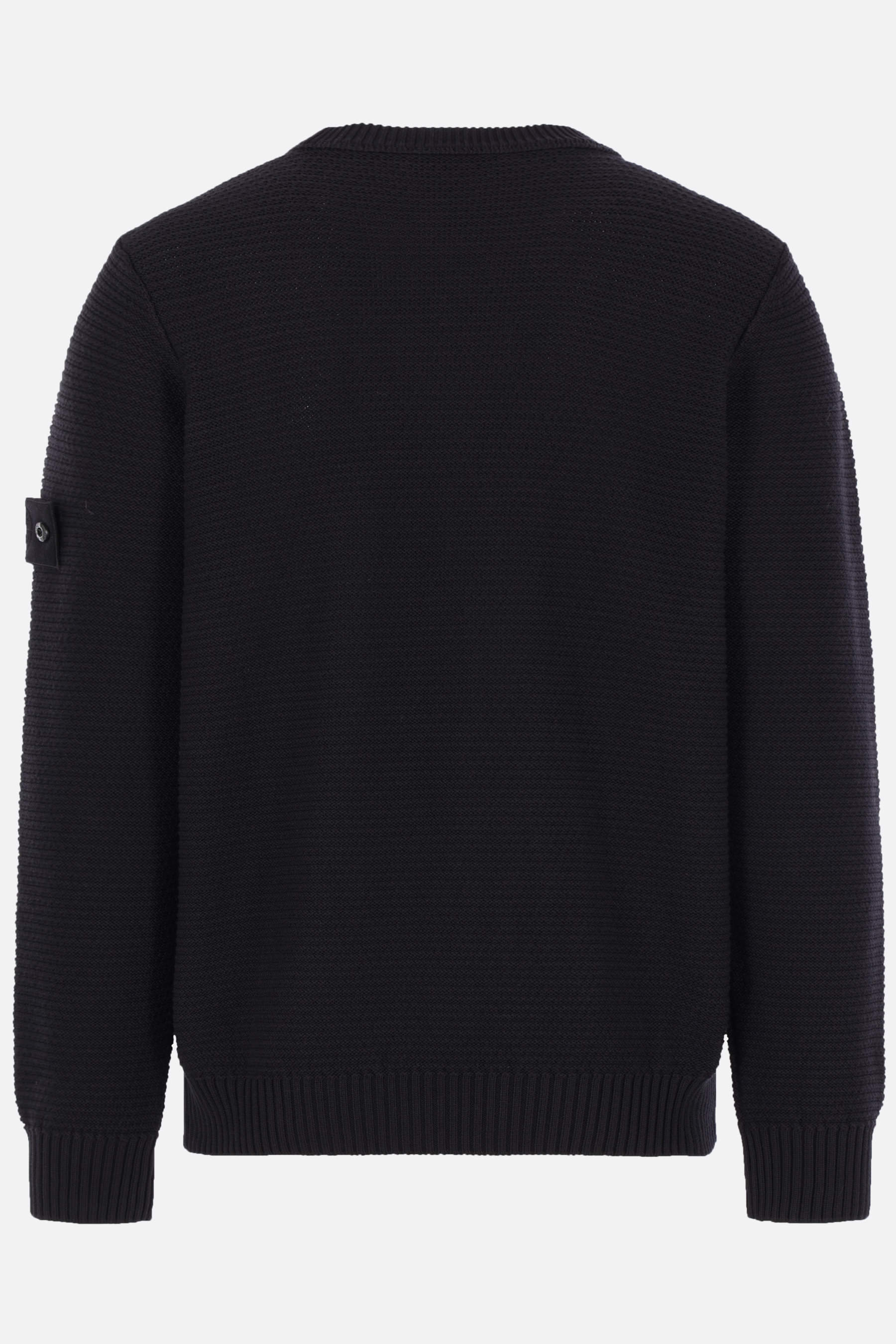 Stone Island sweater crafted from black cotton-cashmere knit with a removable logo badge. It features a crew neckline, long sleeves, and ribbed trims. Ghost Collection.