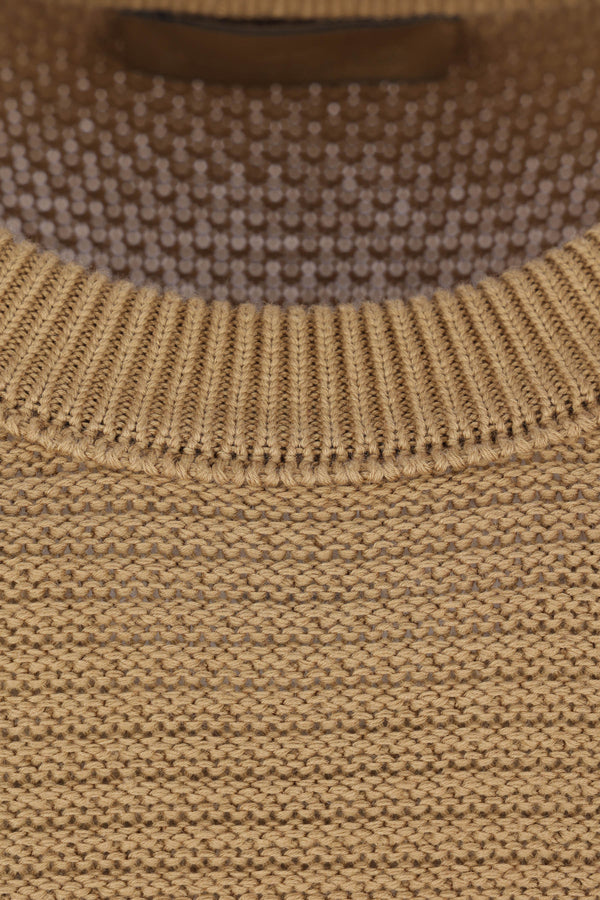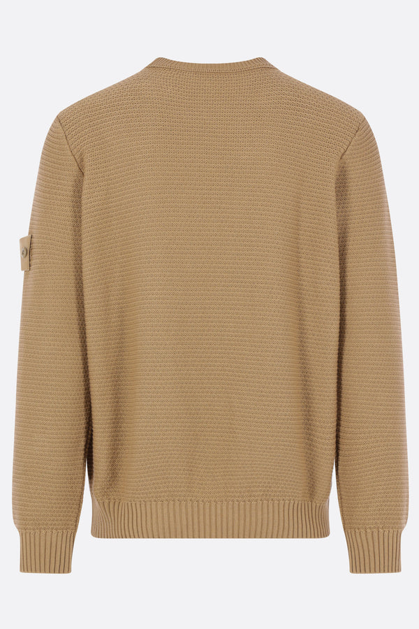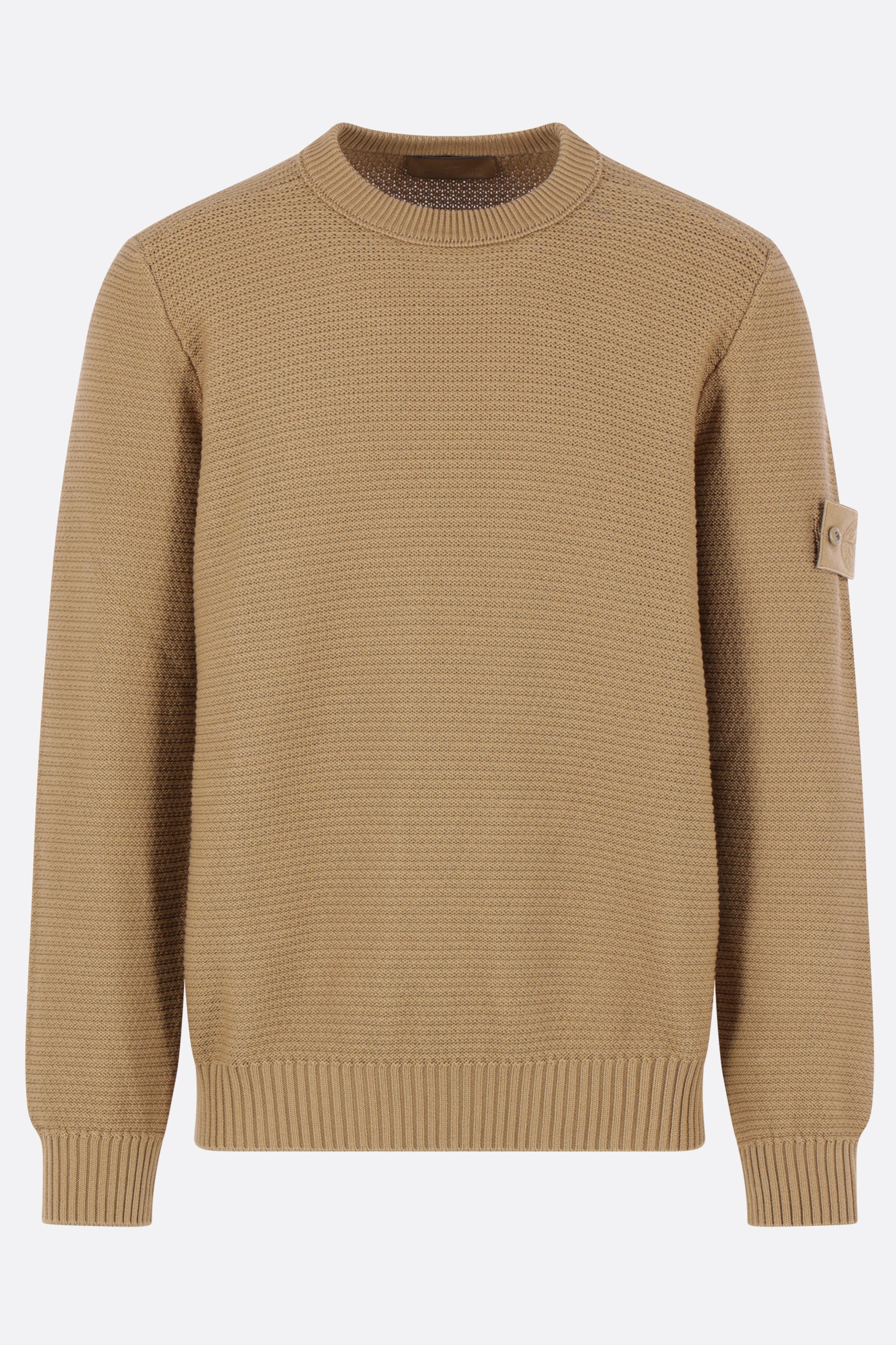 Stone Island sweater crafted from beige cotton-cashmere knit with a removable logo badge. It features a crew neckline, long sleeves, and ribbed trims. Ghost Collection.