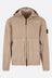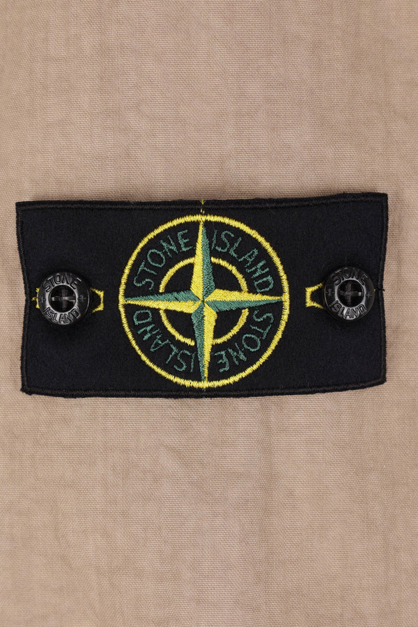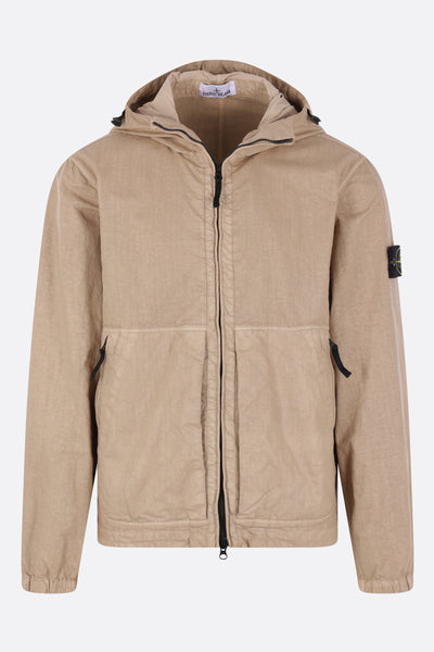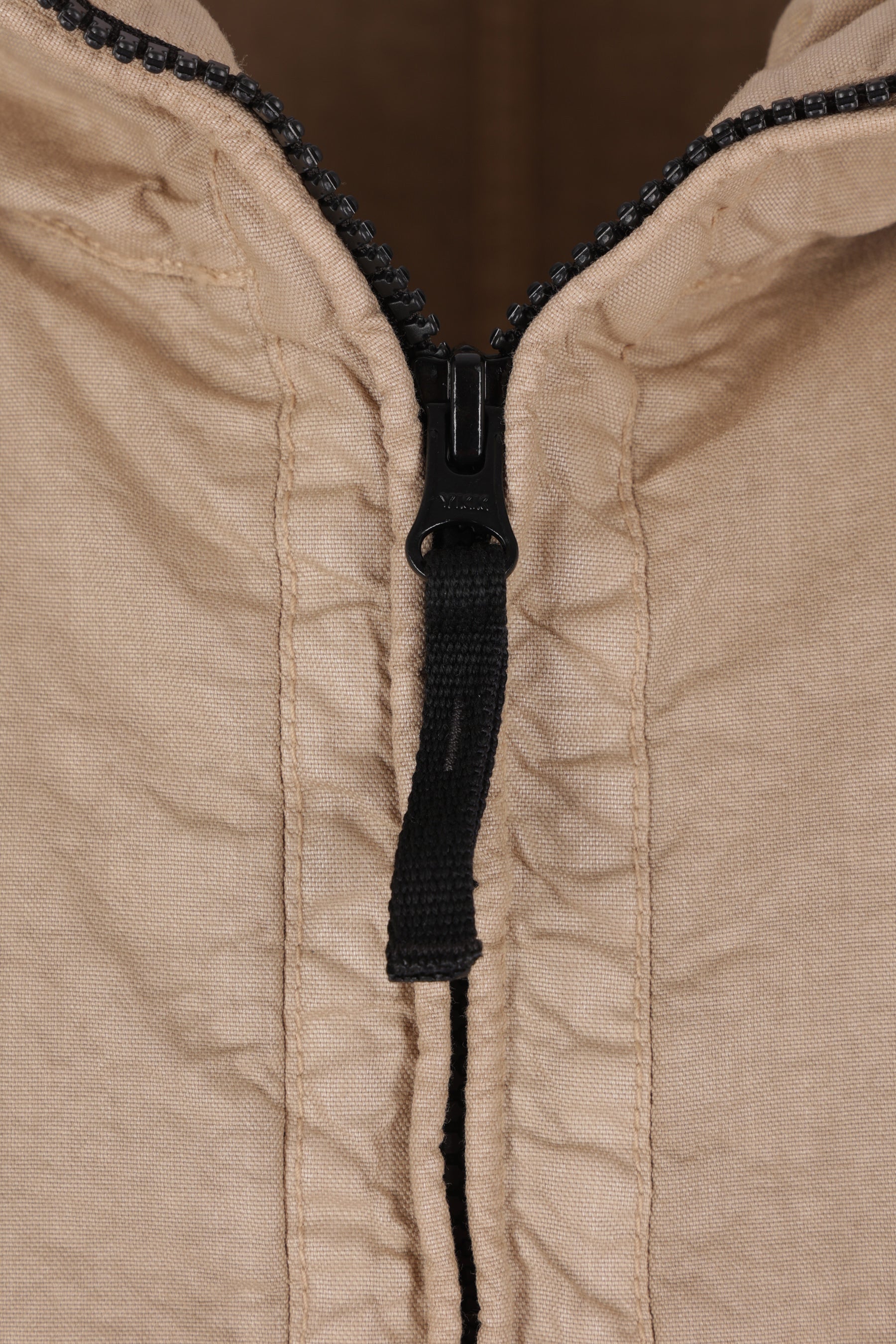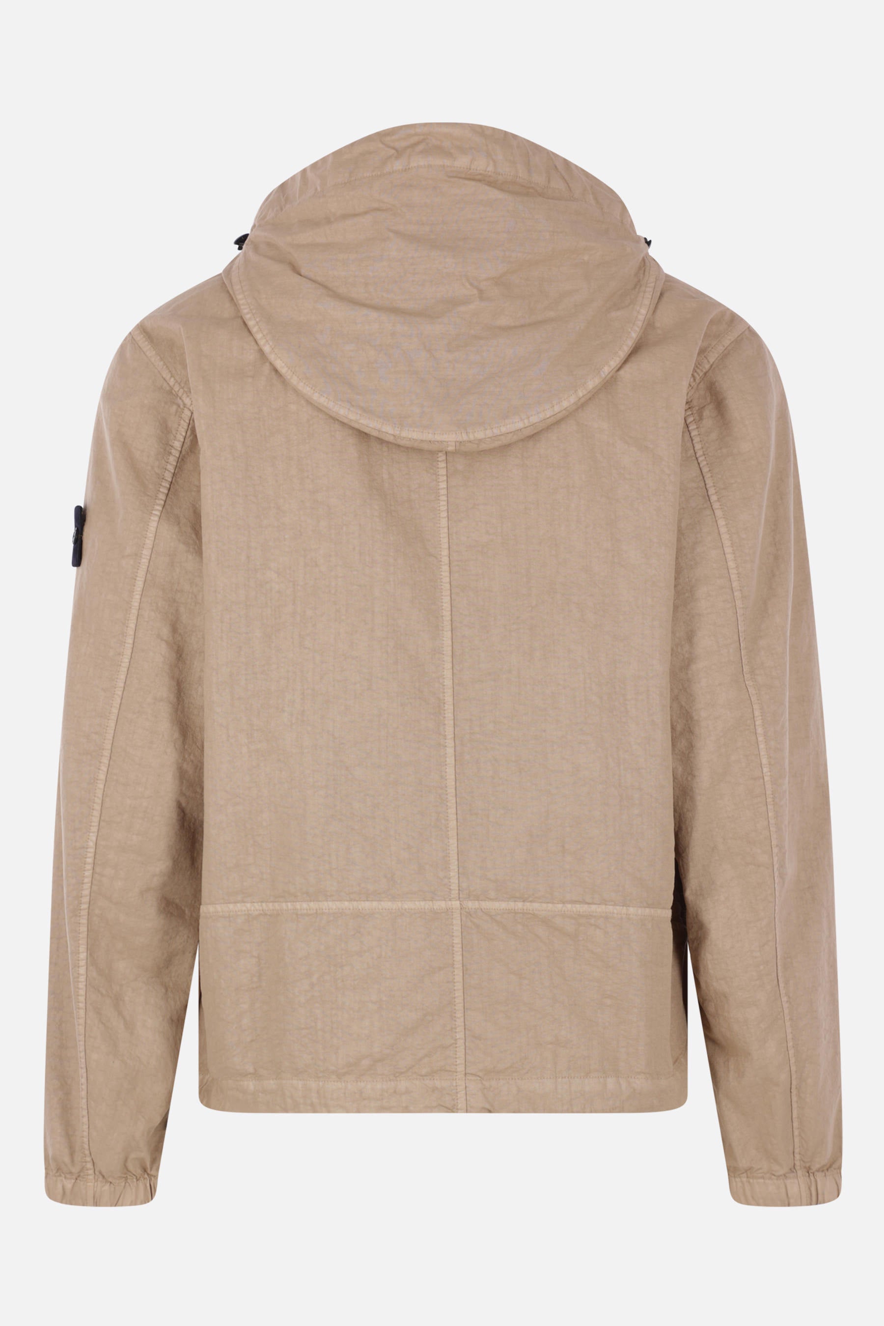 Stone Island windbreaker made of beige Panama nylon with a removable logo badge. Featuring a hood with drawstring, front double-slider zip closure, side zip pockets, long sleeves with elasticated cuffs, and a straight hem with drawstring. The interior is unlined.