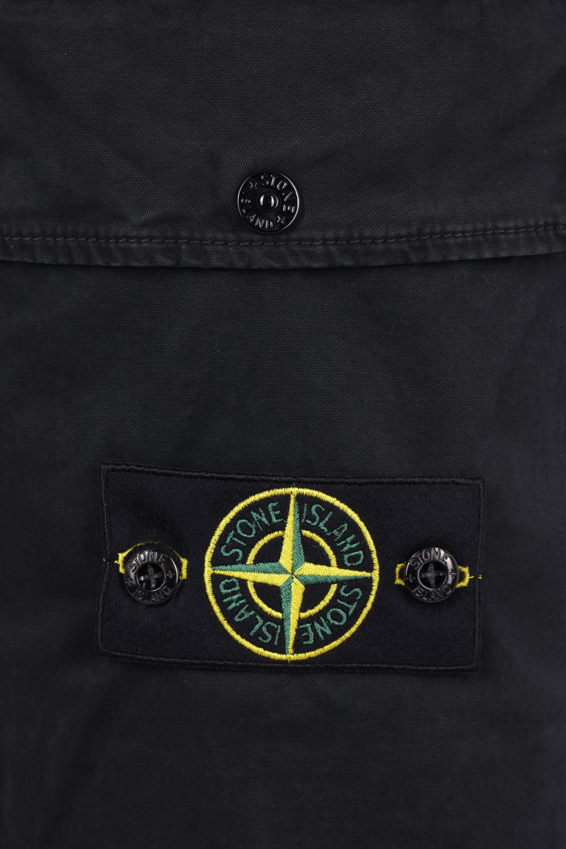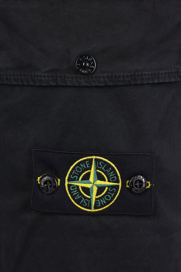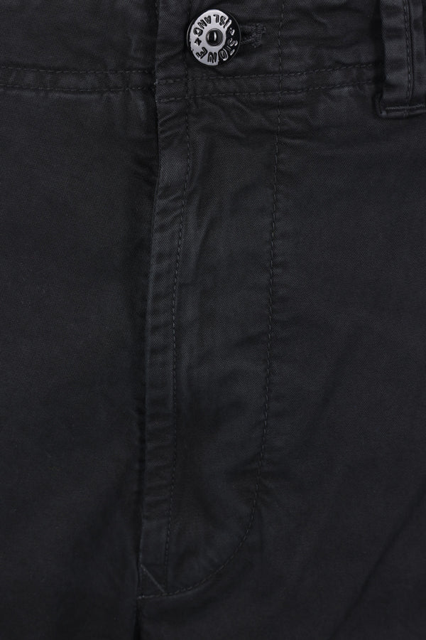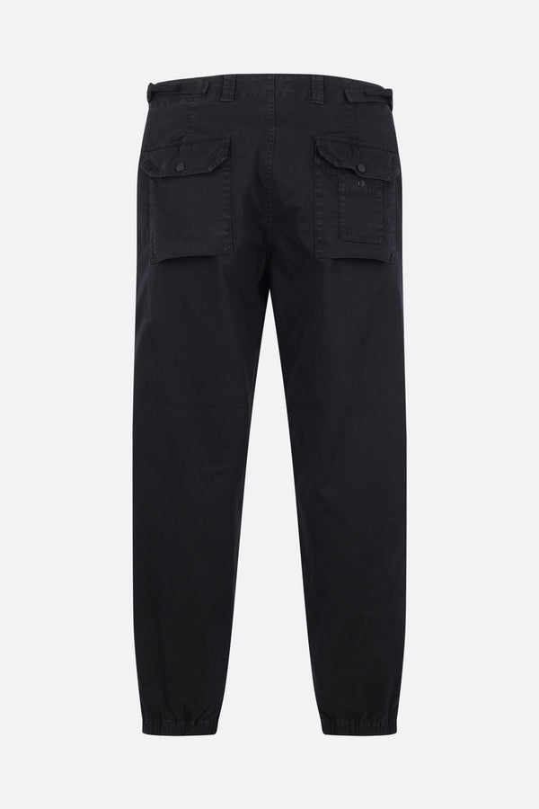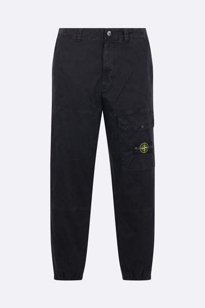 Stone Island cargo trousers made from black stretch organic cotton broken twill. Featuring a front metal button and zip closure, adjustable waist tabs, belt loops, multiple pockets, and elasticated hems. The design is completed with a removable logo badge.