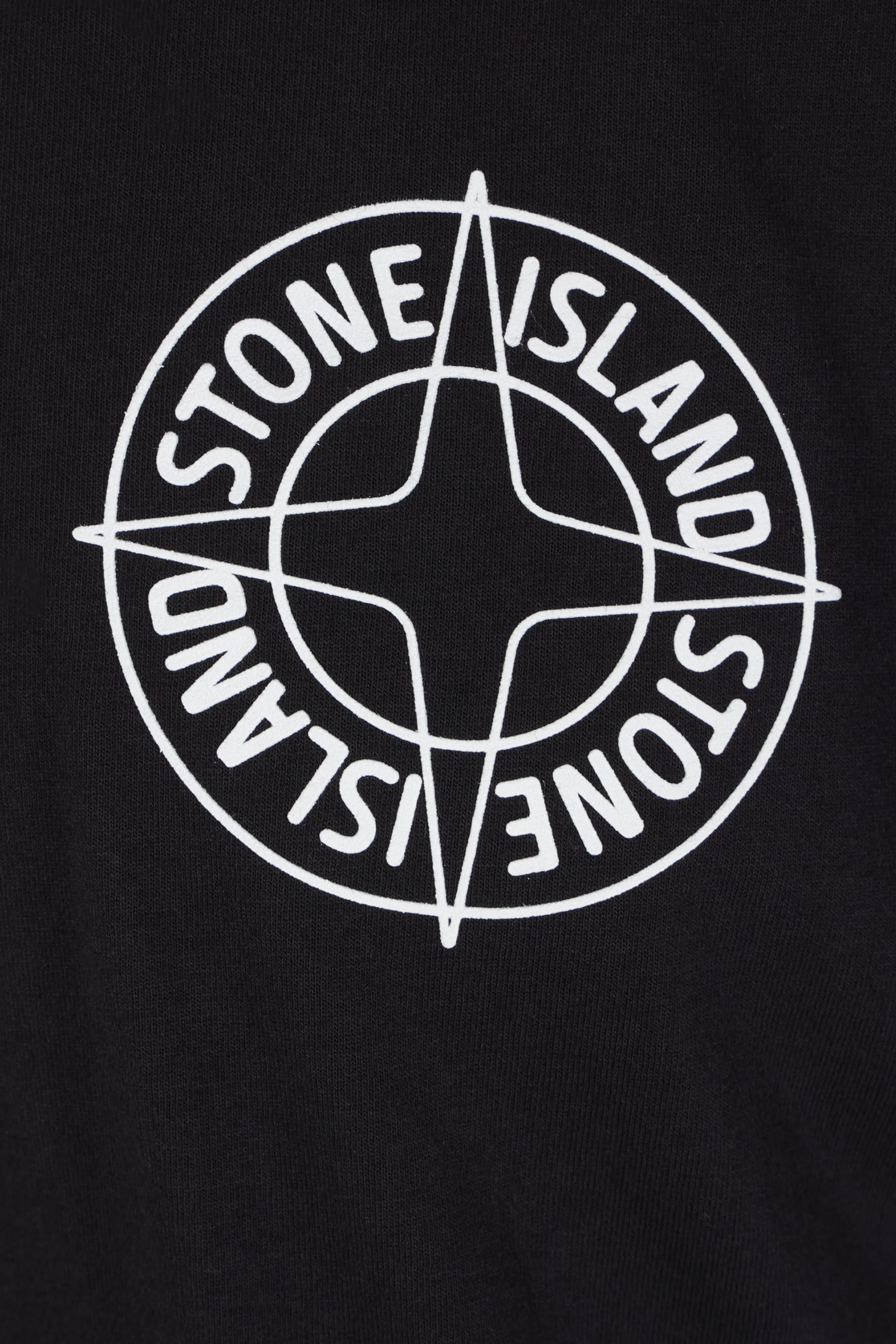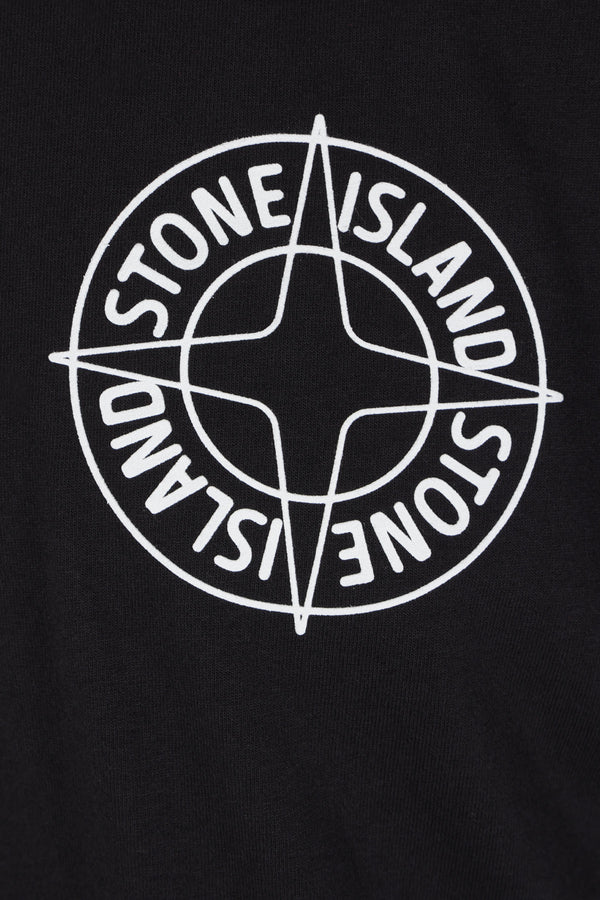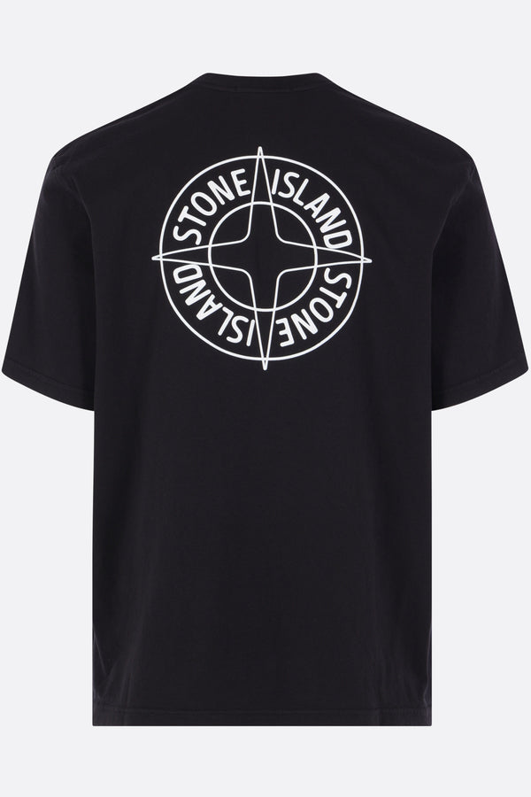 Stone Island t-shirt crafted from black cotton jersey with Outline Compass logo prints on the chest and back. It features a crew neckline, short sleeves, and a straight hem.