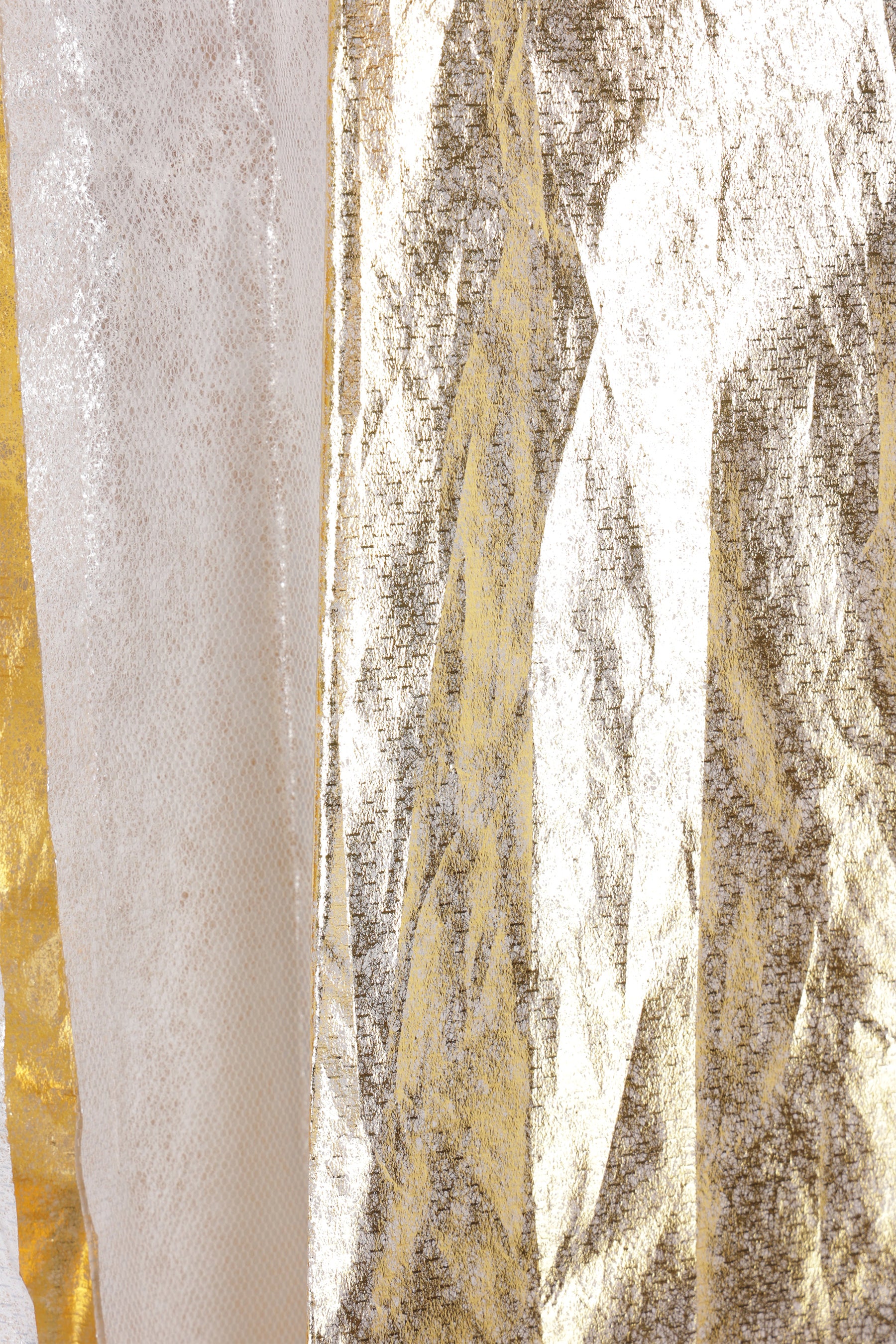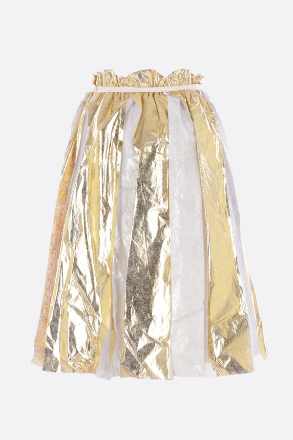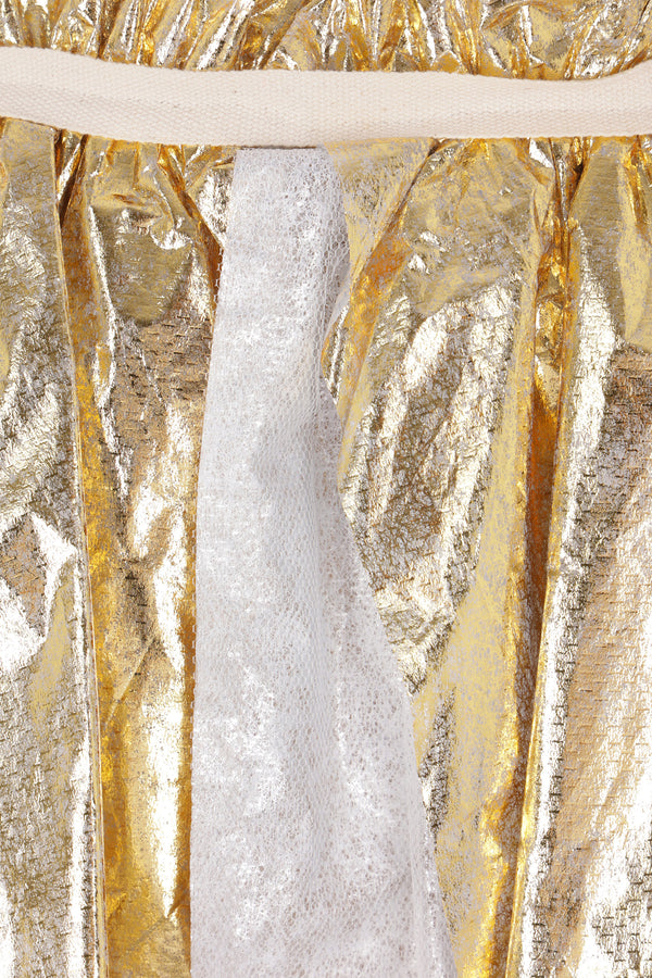 Tao Comme des Garçons circle skirt made from layered panels of white tulle and gold laminated paper-effect fabric. Features internal button closure at the waist and unlined interior.