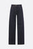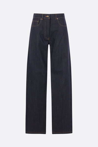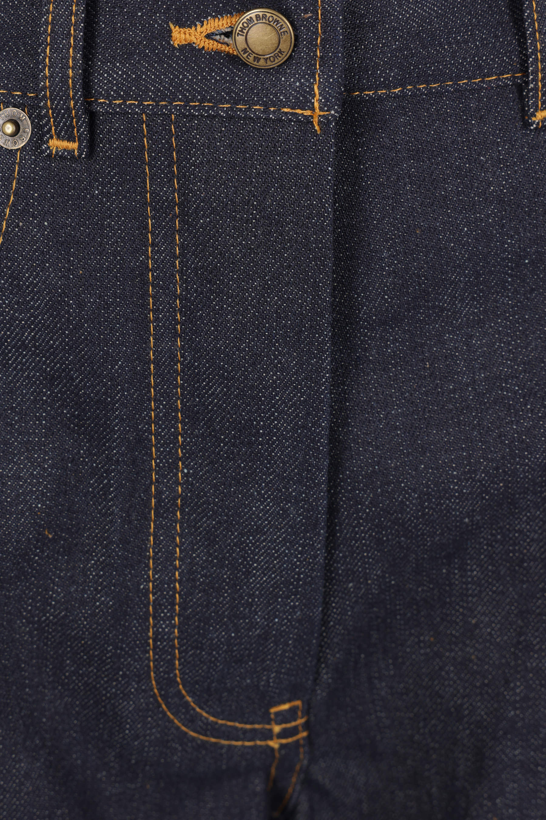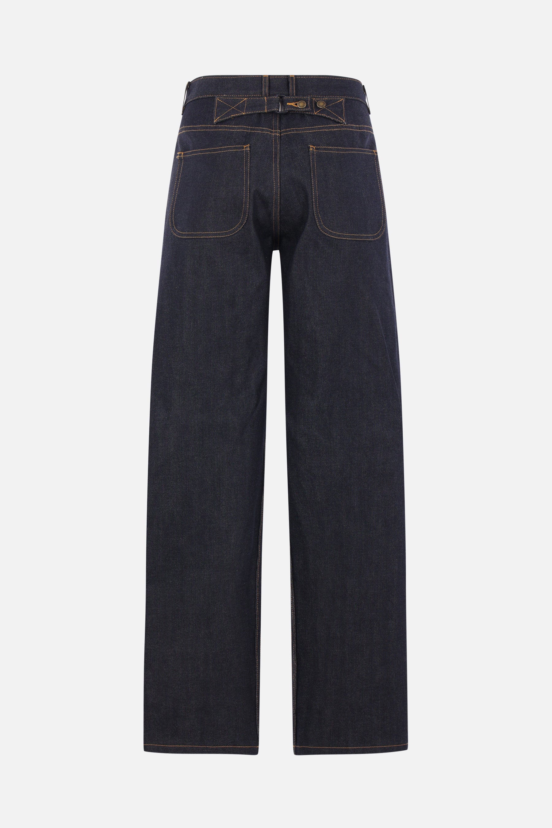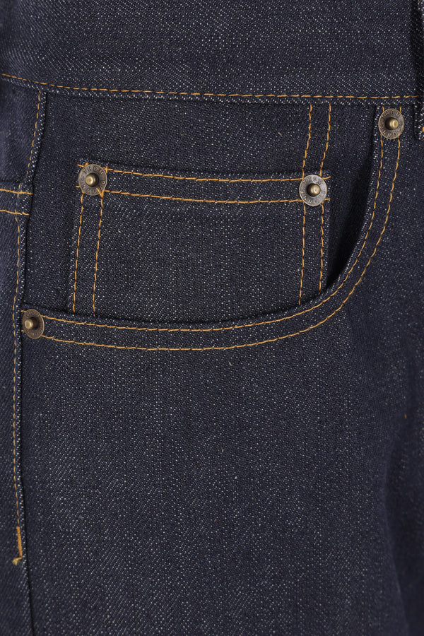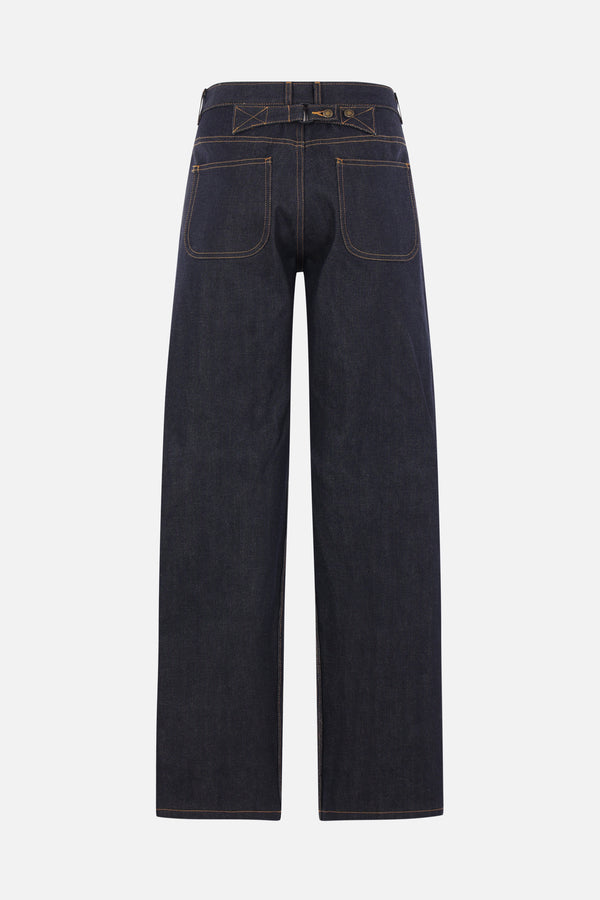 Thom Browne straight-leg jeans made from dark blue selvedge denim with contrast stitching. Featuring a front metallic button closure, belt loops, classic five-pocket design, and a back martingale. The design is completed by the iconic grosgrain striped loop on the back.