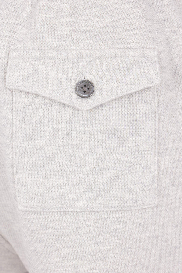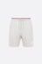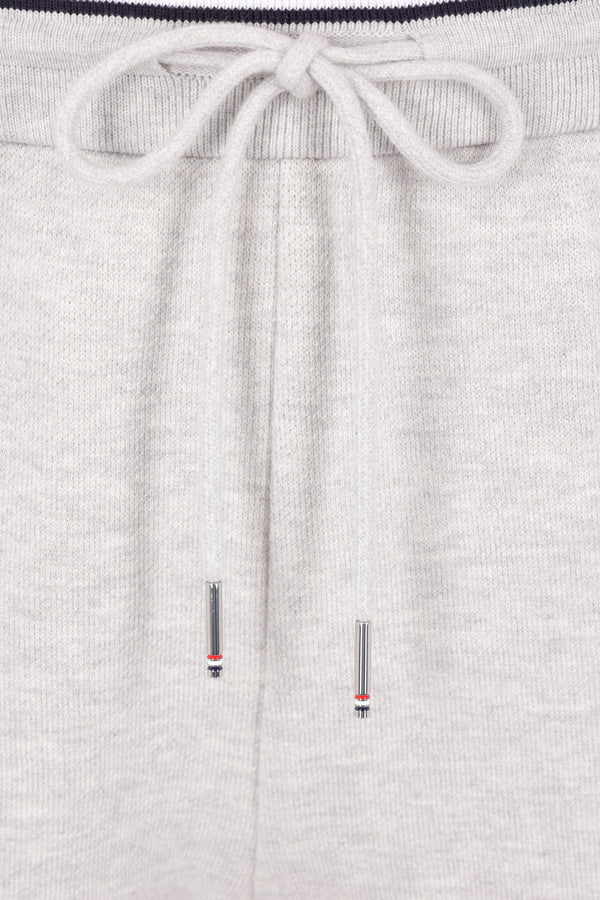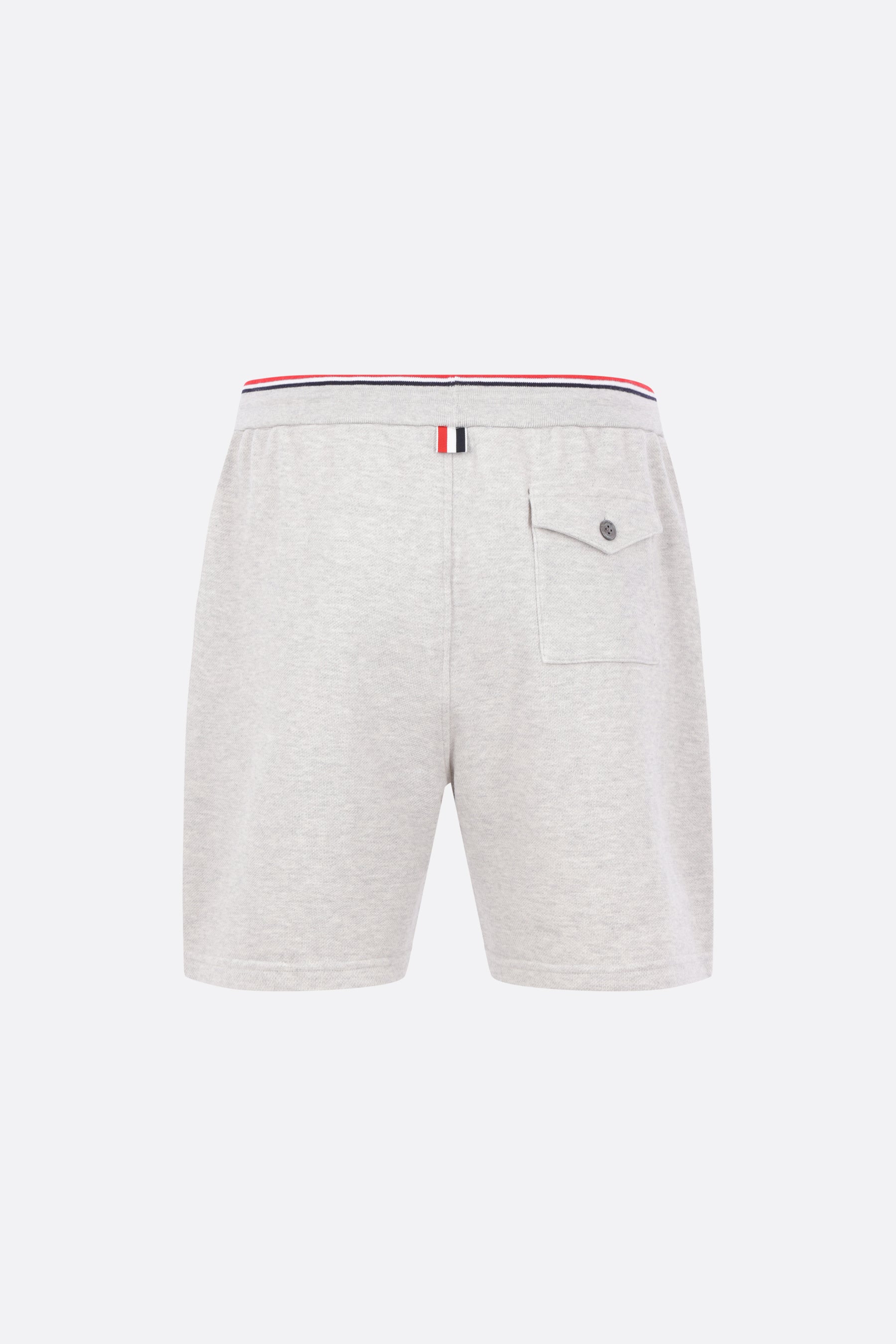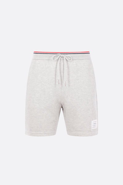 Thom Browne shorts crafted from light grey cotton piquet. Featuring an elasticated waistband with drawstring, tricolor trim, and multiple pockets. The design is completed by the iconic striped grosgrain loop on the back.