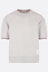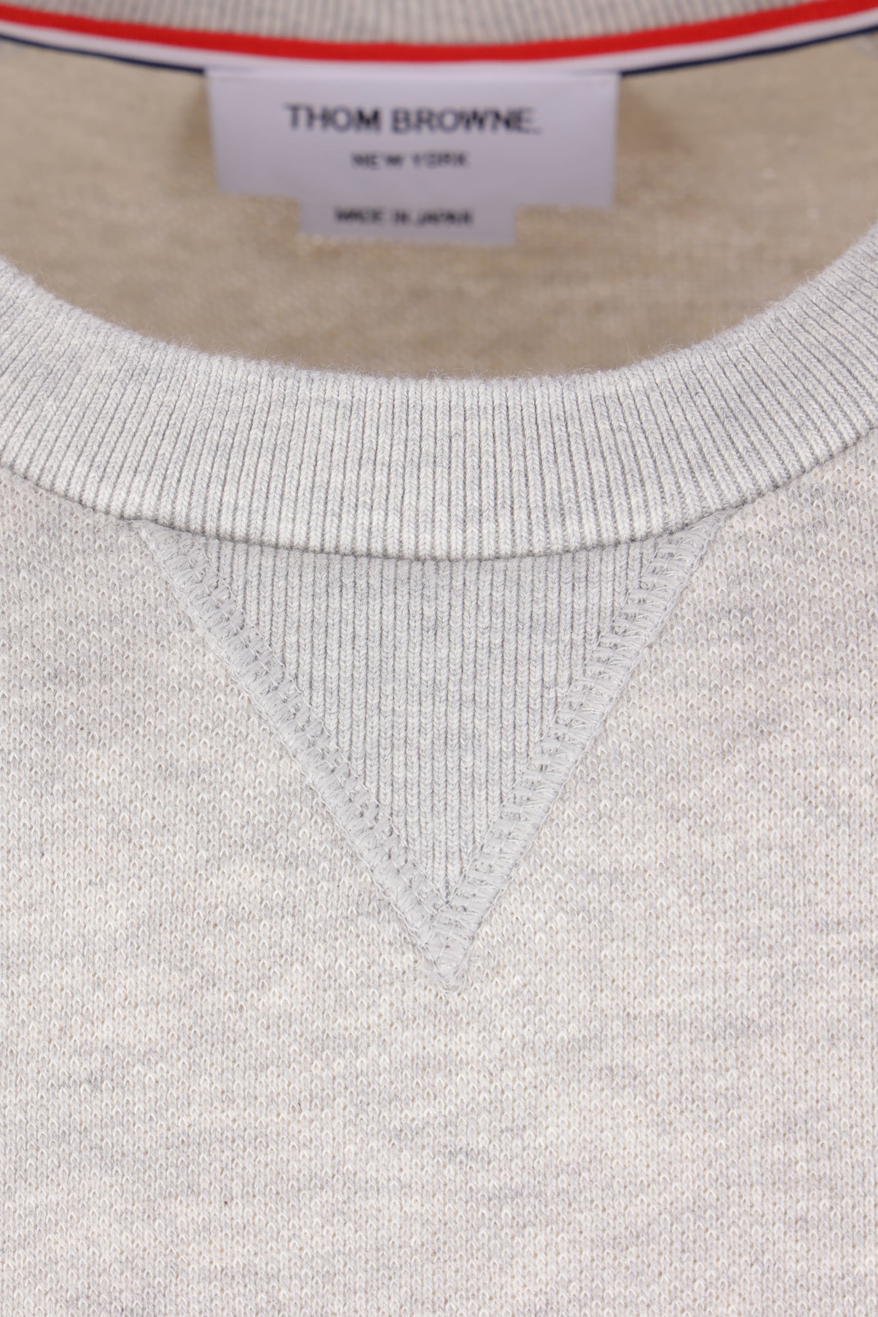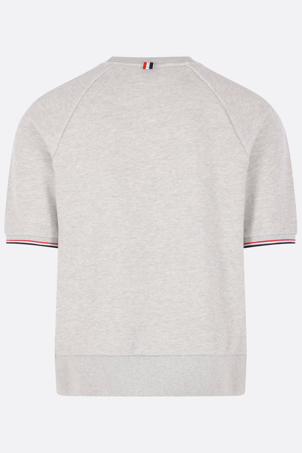 Thom Browne sweatshirt crafted from light grey cotton piquet. Featuring a crew neckline, short sleeves with tricolor trim, and ribbed edges. The design is completed by the iconic striped grosgrain loop at the back of the neck.