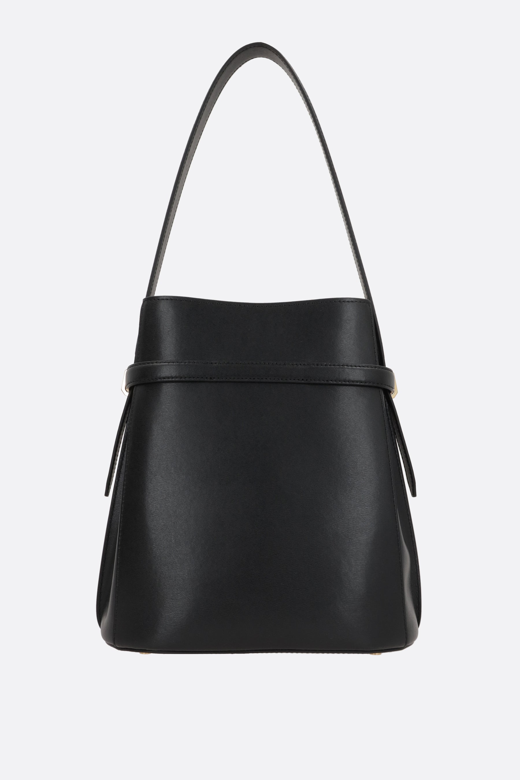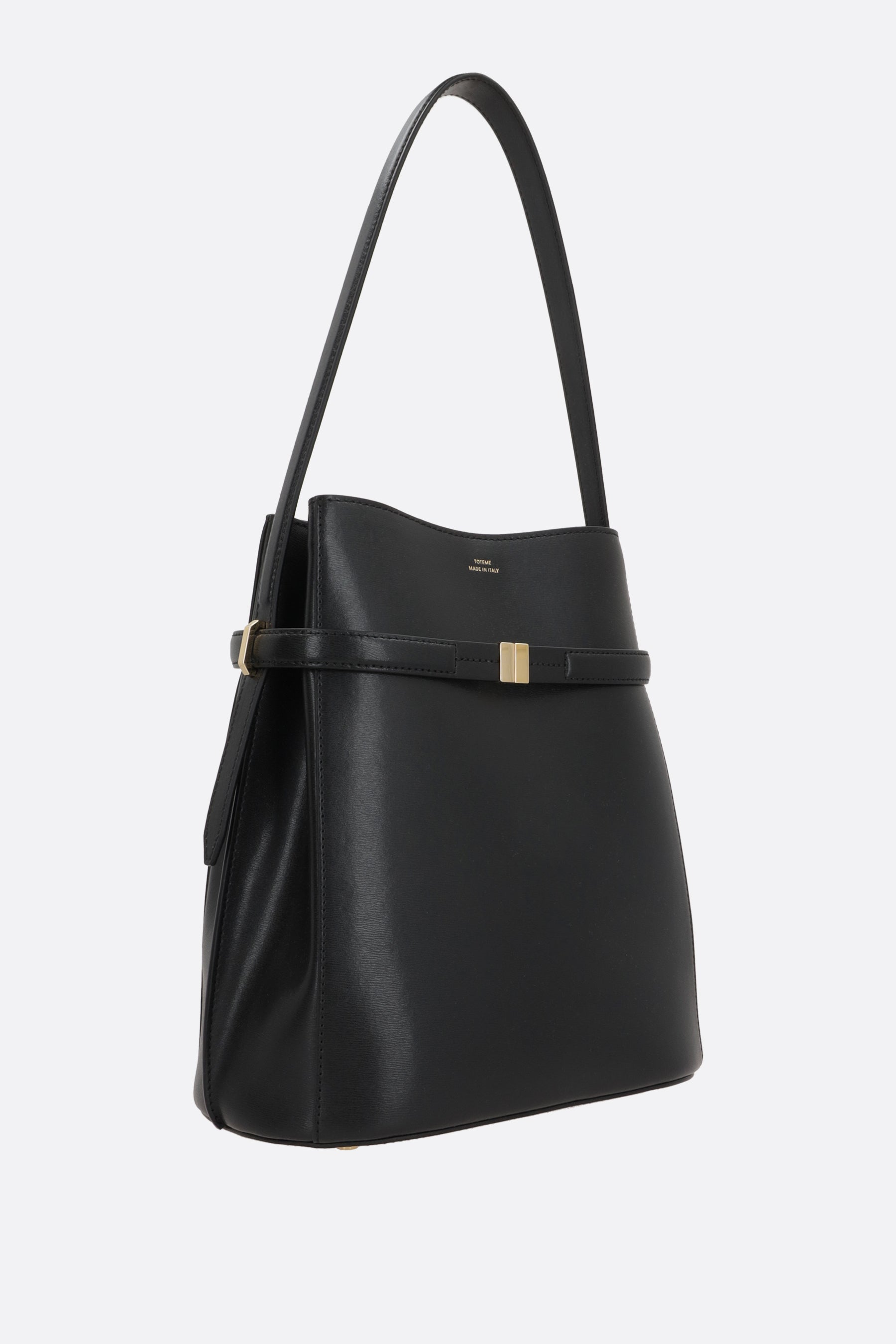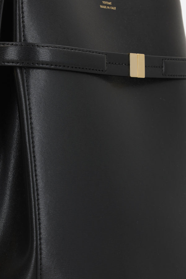Toteme bucket bag crafted from black textured leather with an embossed front logo. It features gold-tone hardware, an interior hook closure, a fixed shoulder strap, and protective metal feet. The black microfiber-lined interior includes two flat pockets.