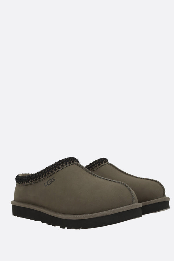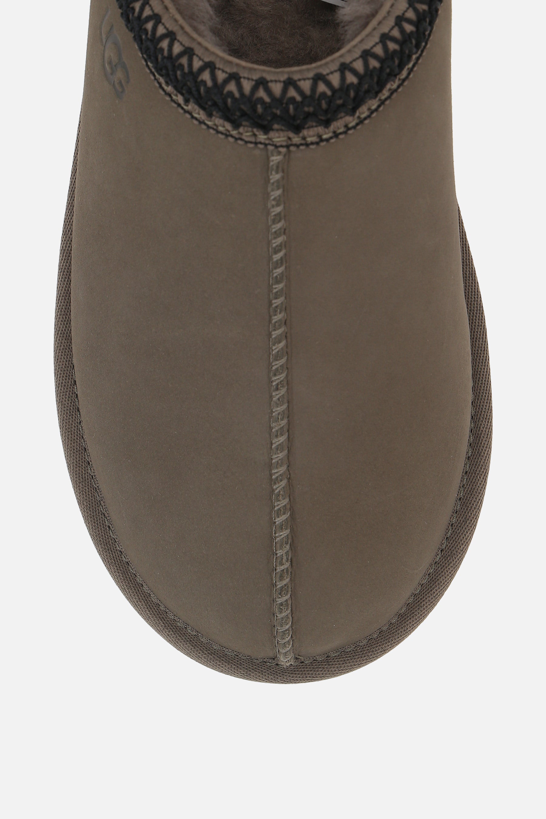 Ugg slippers crafted from dark green nubuck with embroidered trim in recycled fabric. Featuring a round toe, shearling lining, and an EVA outsole made from sugarcane. The design is completed by the iconic embossed logo on the side.