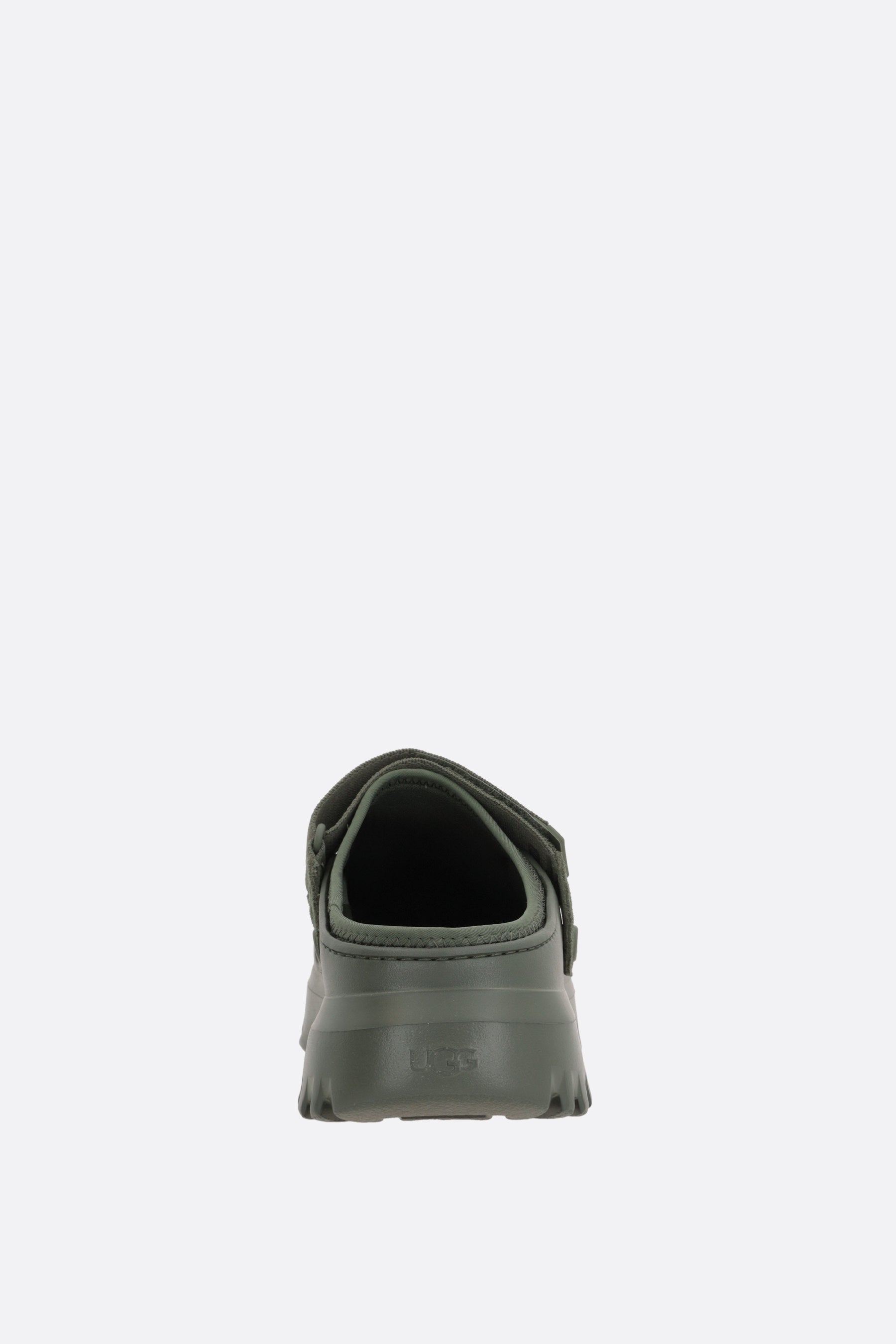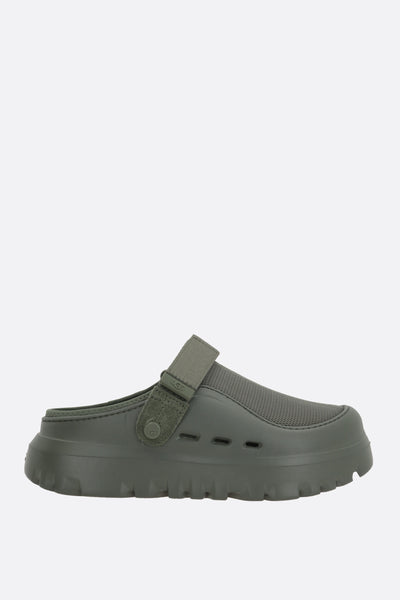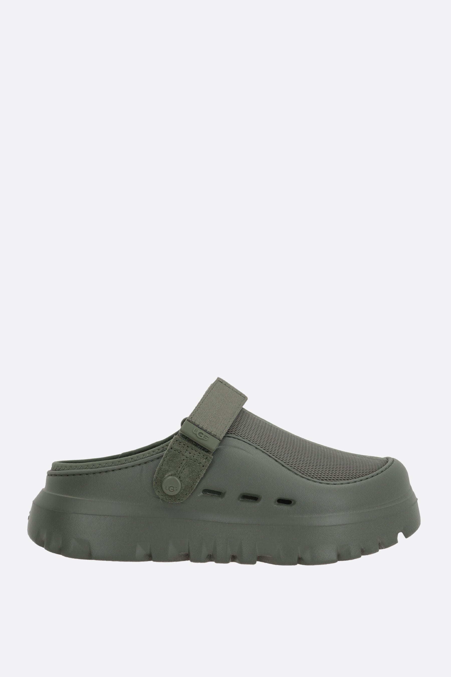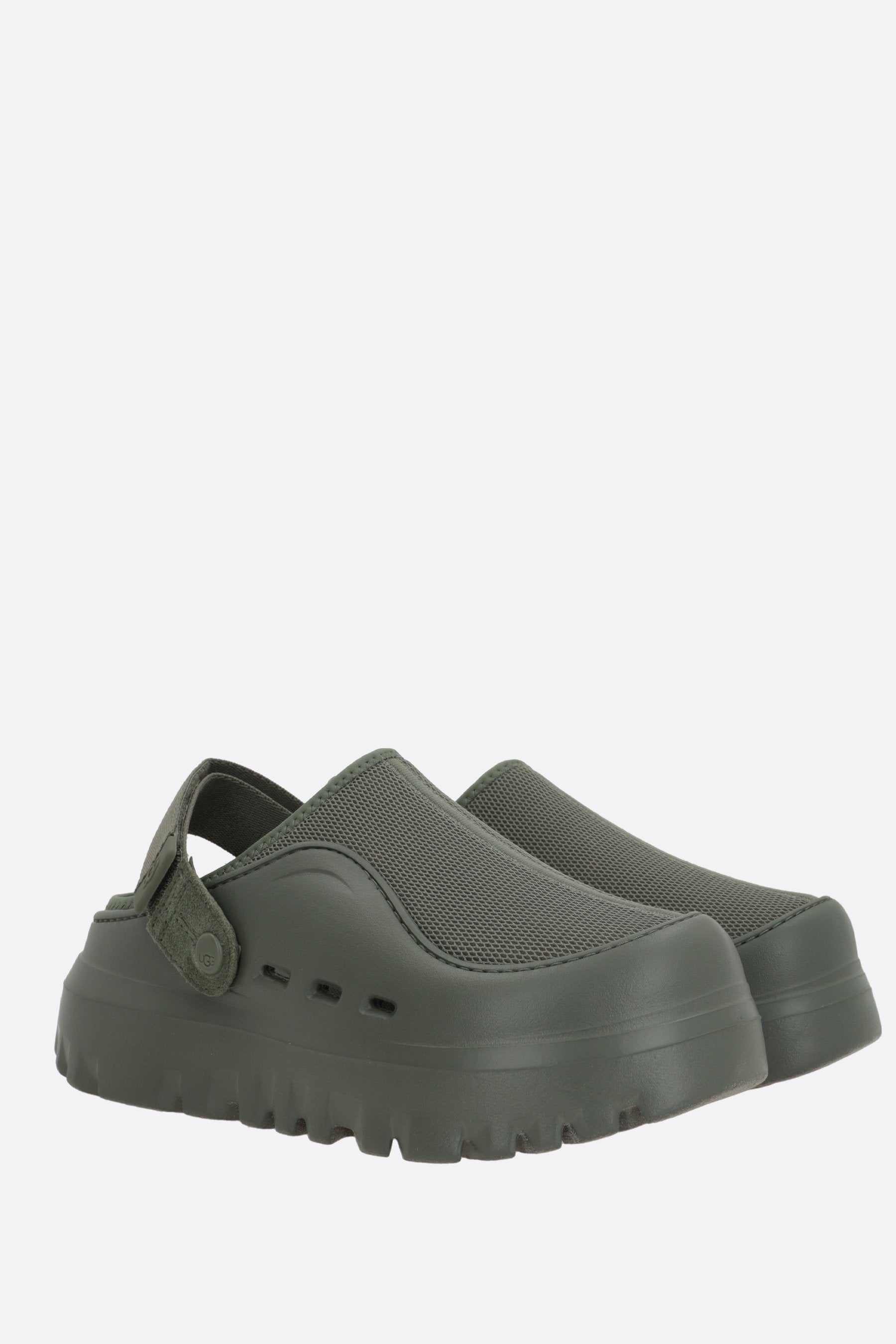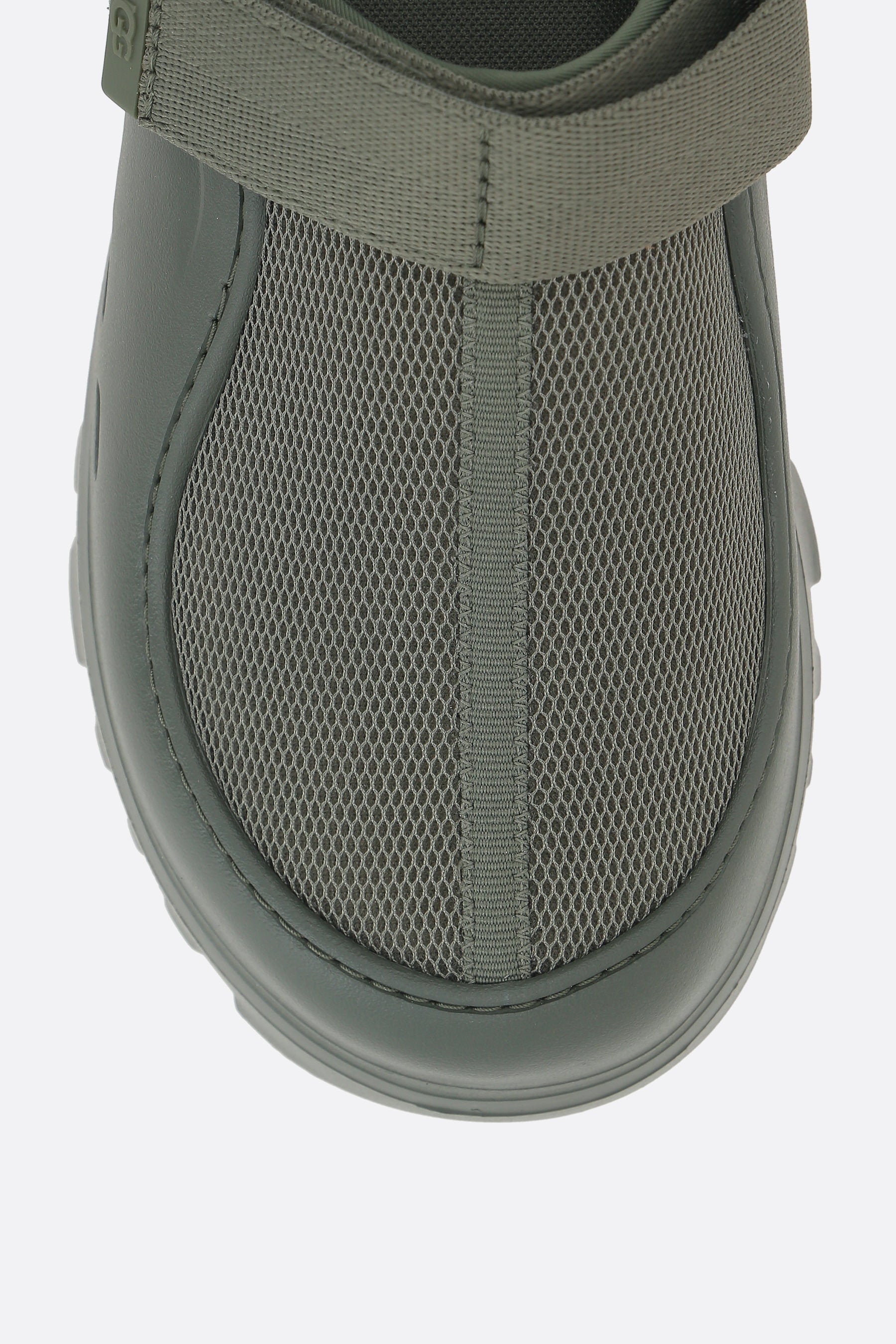 Ugg clogs crafted from dark green mesh and rubber. Featuring a round toe, adjustable ankle strap with velcro, lining made from recycled polyester fibers, and a sugarcane-derived EVA sole.