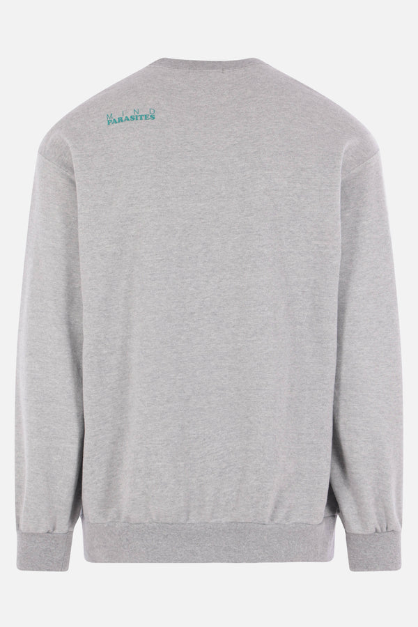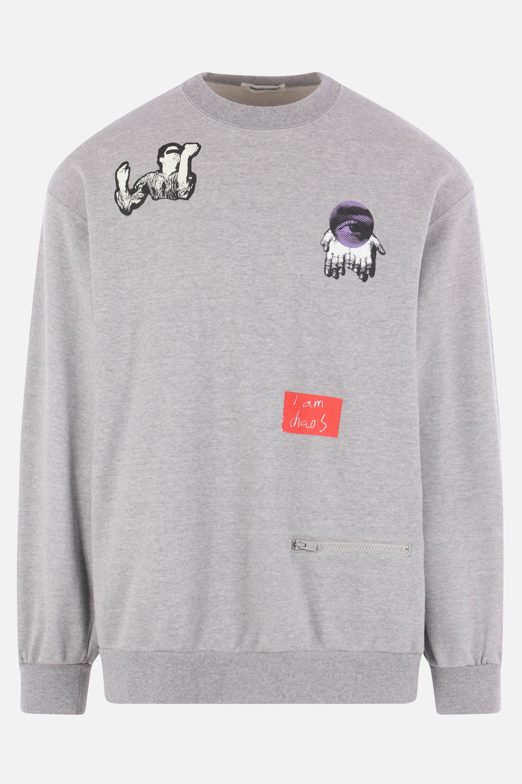 Undercover sweatshirt made of grey cotton jersey with all-over prints. Featuring a crew neckline, a zip pocket, long sleeves, and ribbed trims.