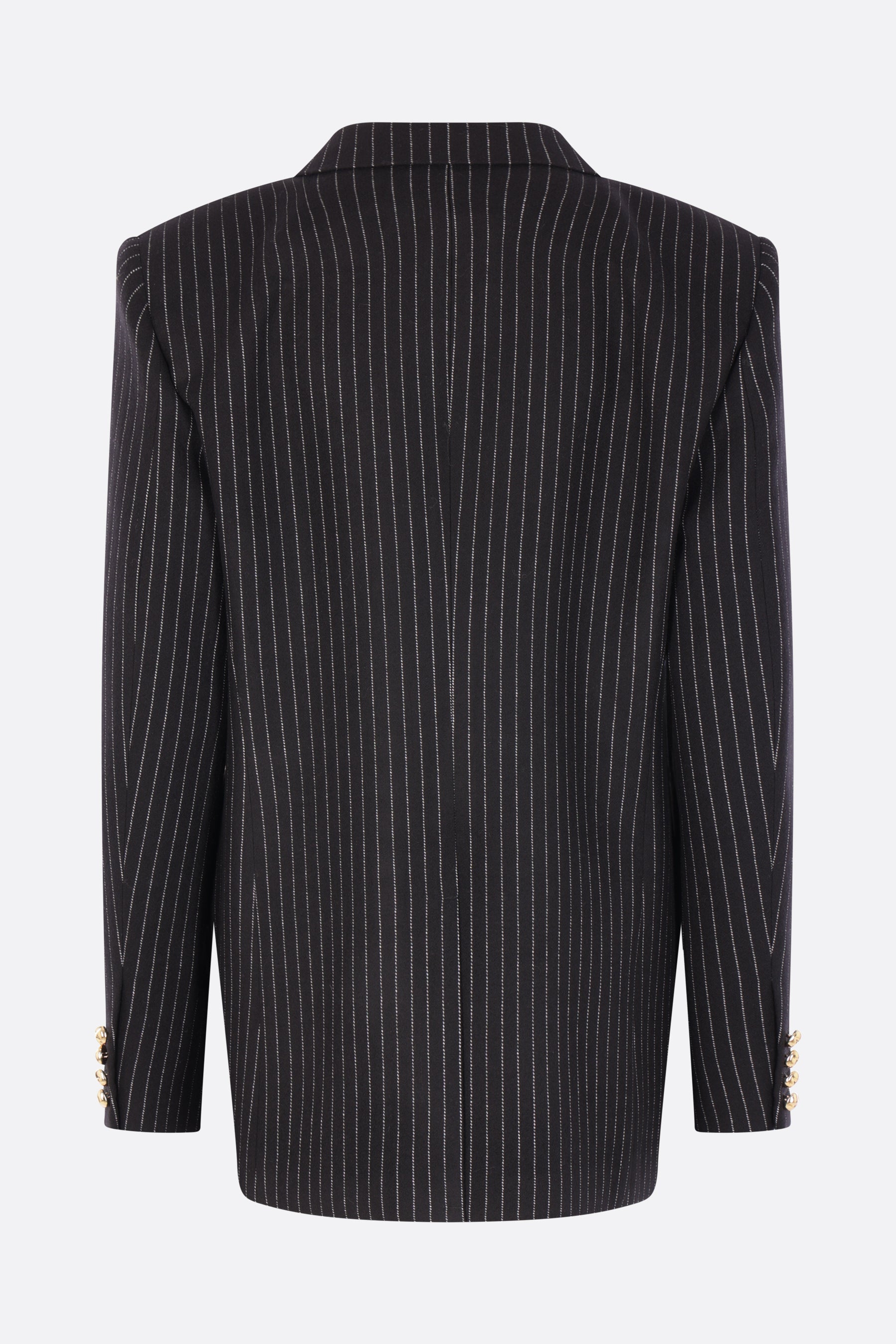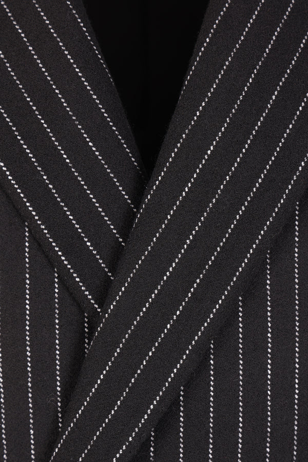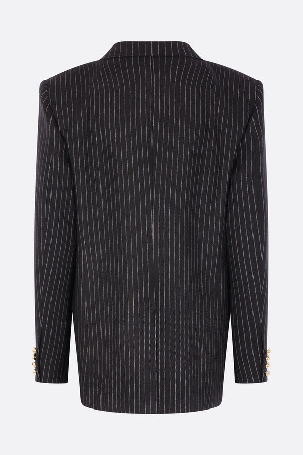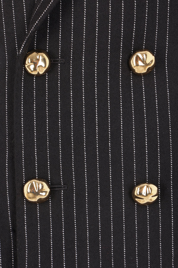 Valentino Garavani double-breasted jacket crafted from black wool and silk with a pinstripe pattern. It features a classic lapel, front button closure, multiple pockets, padded shoulders, long sleeves with buttoned cuffs, and a central back vent. Fully lined interior.