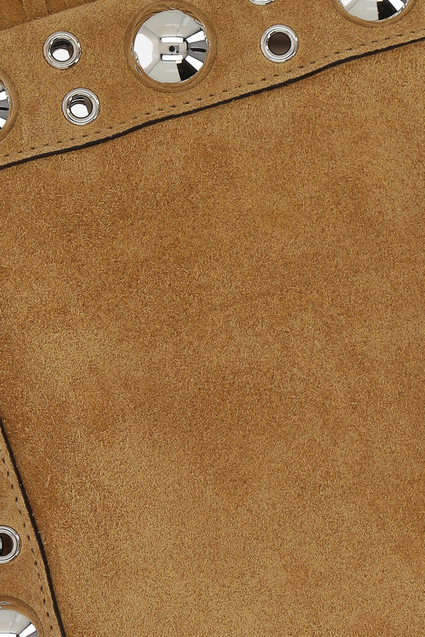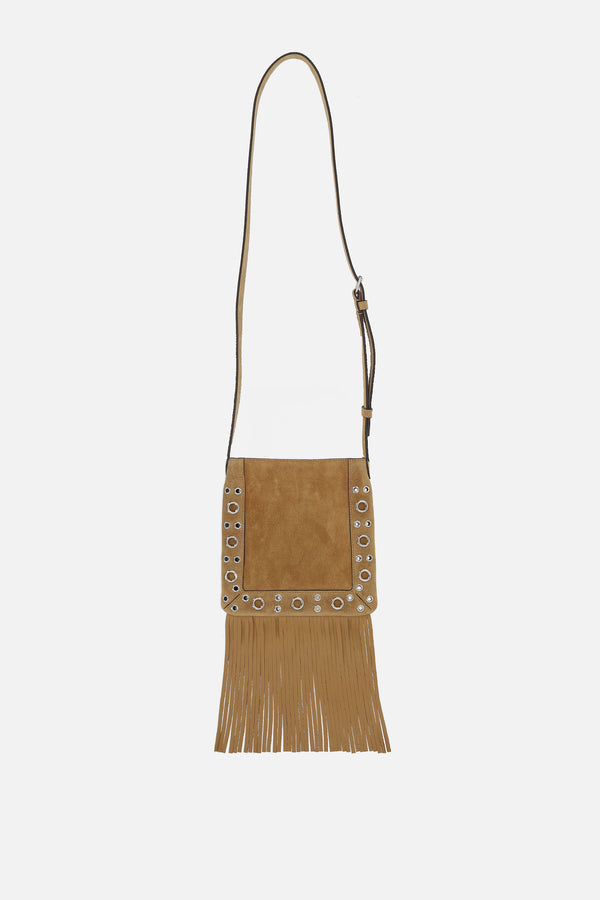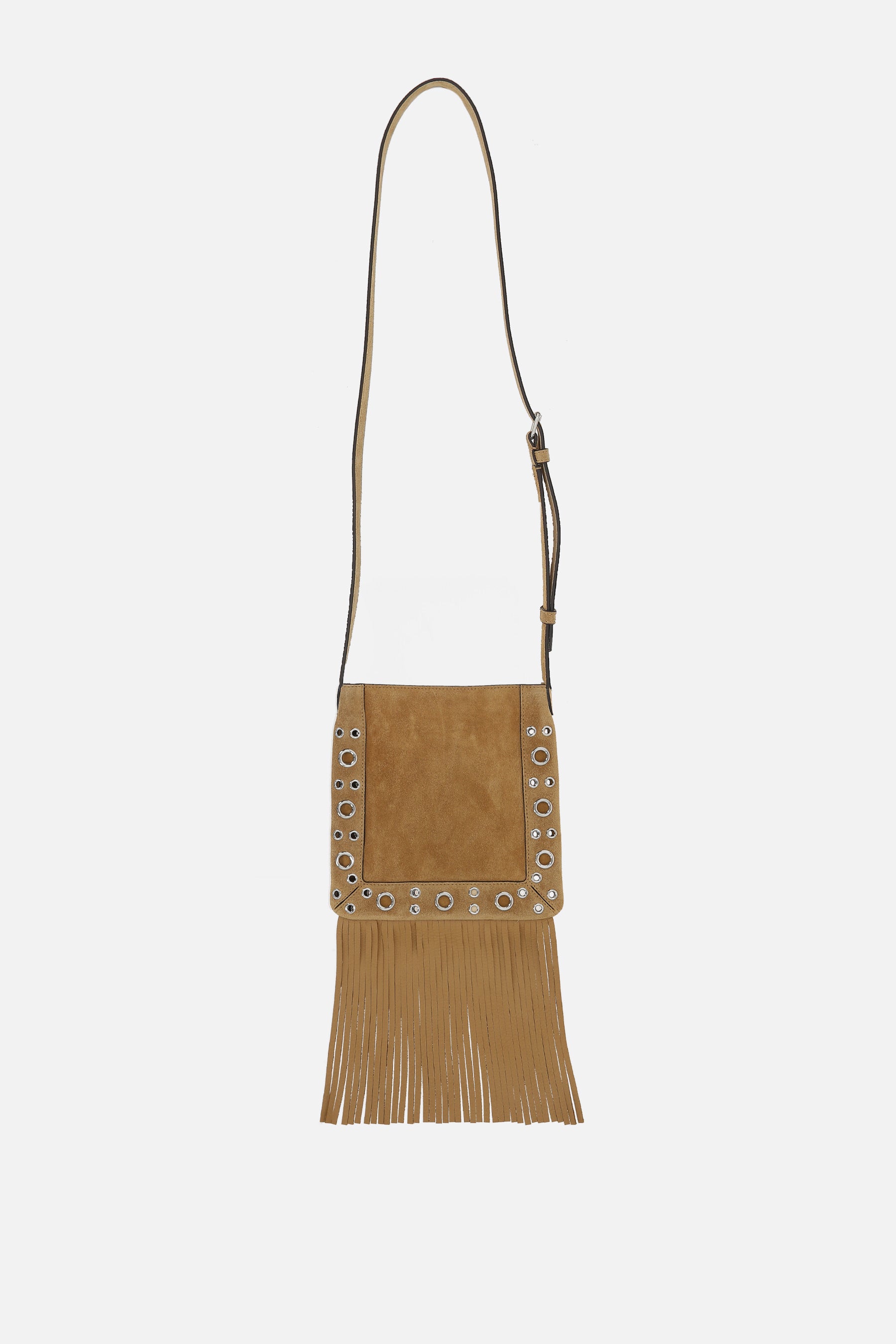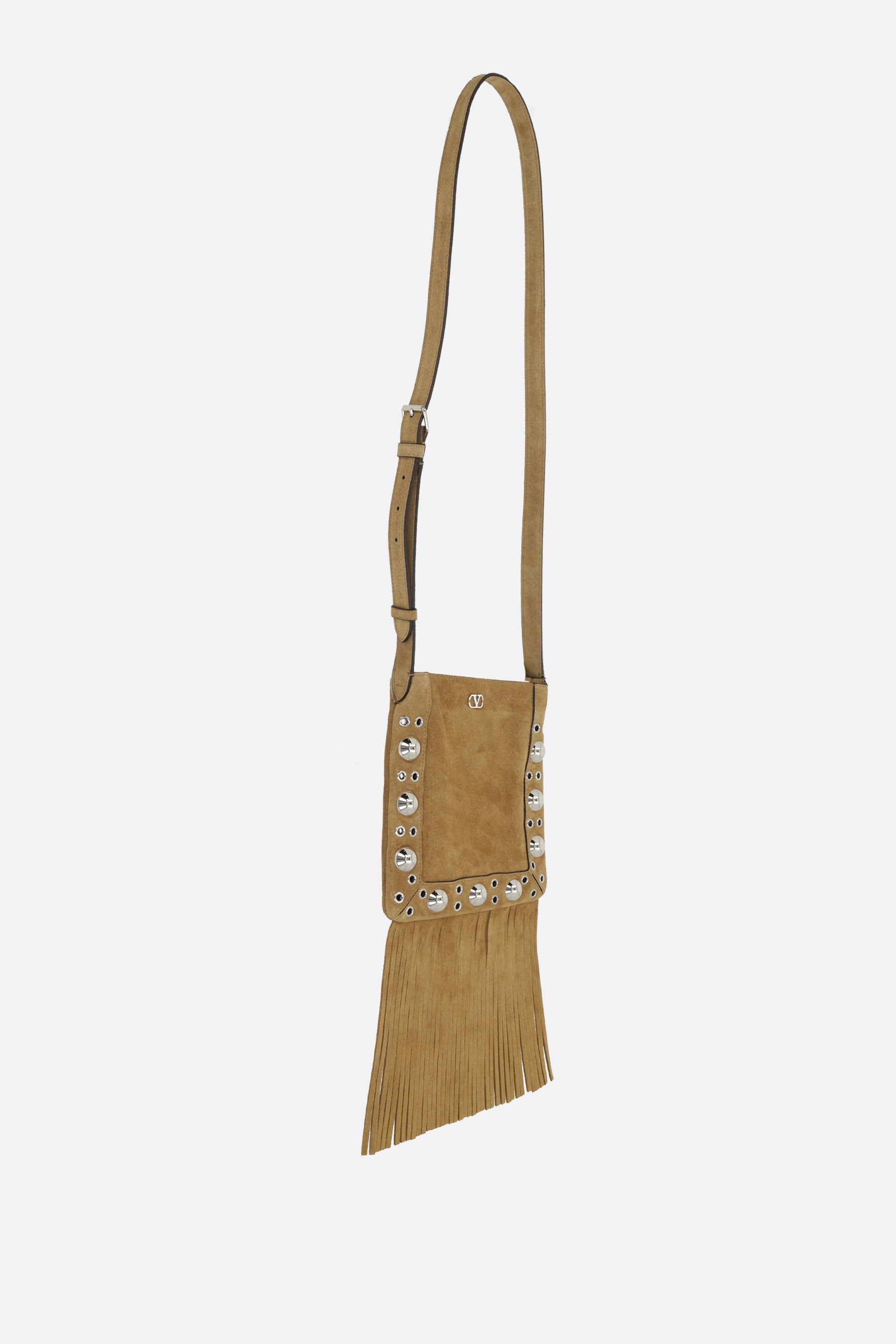 Valentino Garavani crossbody bag made from beige suede with sphere studs and rivets along the edges. Featuring silver-tone hardware, adjustable strap, and tone-on-tone suede-lined interior. The design is completed with fringe detailing at the bottom and the iconic metal VLogo Signature applied on the front.