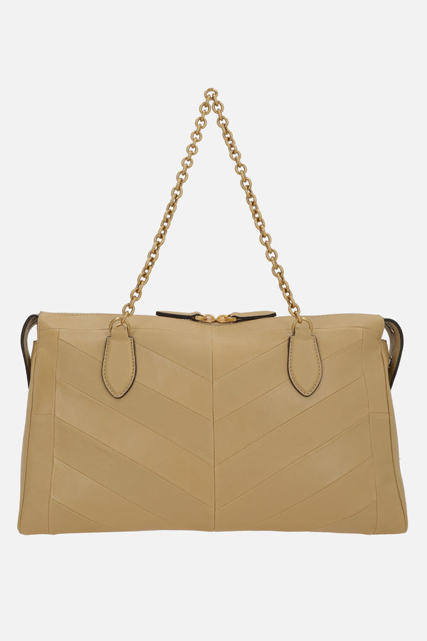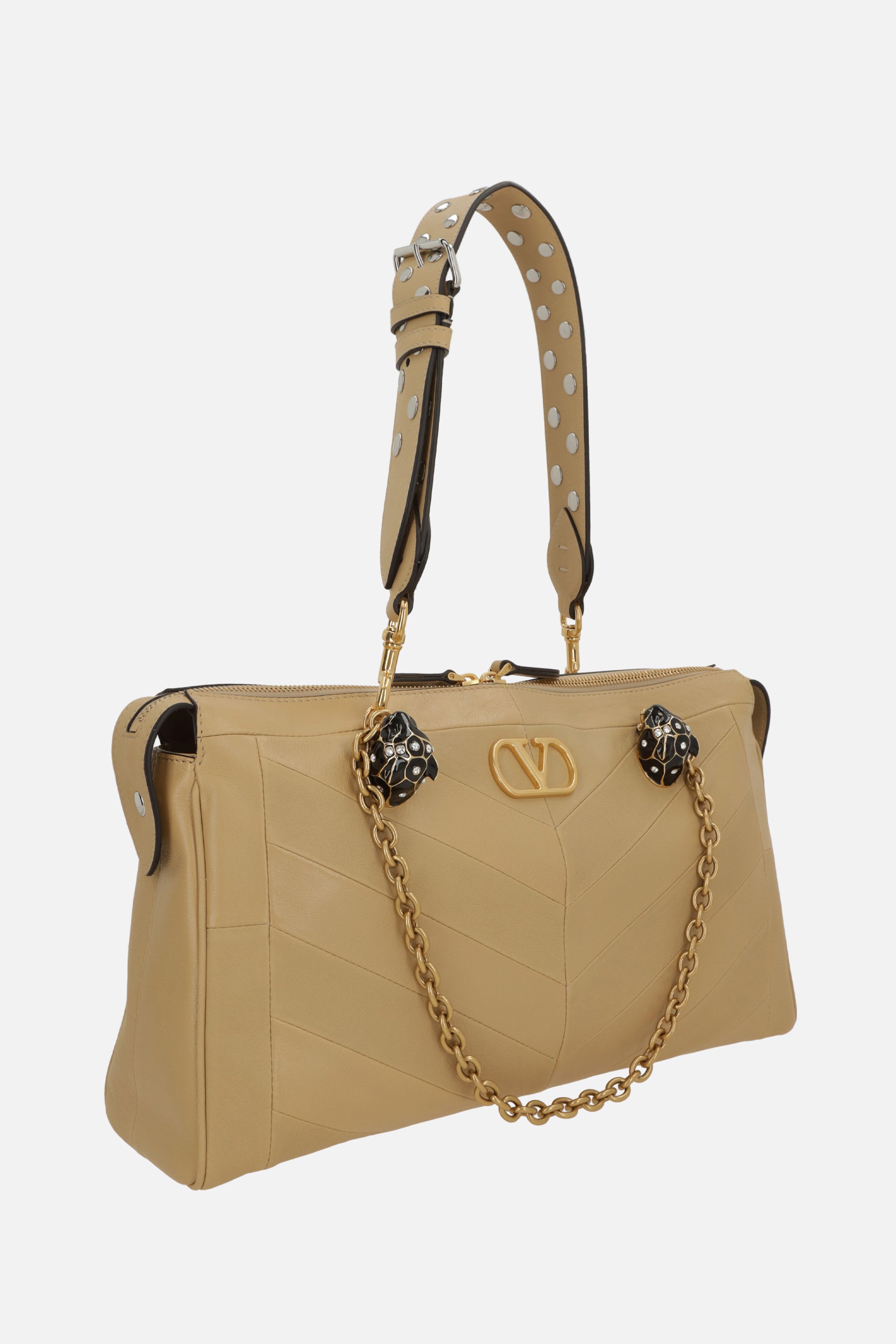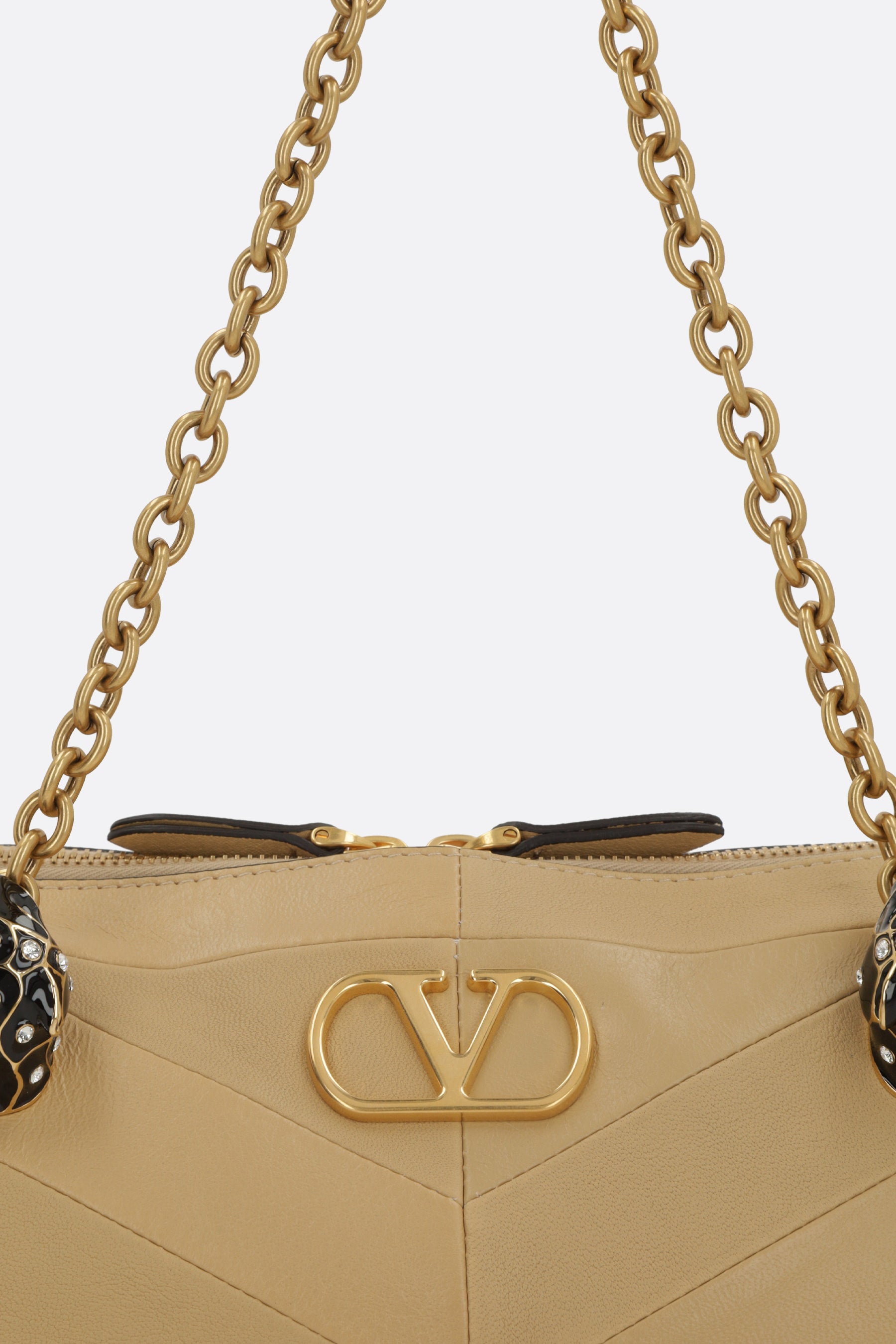 Valentino Garavani shoulder bag crafted from a chevron-patterned patchwork of glossy and matte nappa leather. Features gold-toned hardware, zip closure, chain handles, and an adjustable/removable shoulder strap. The tone-on-tone nappa-lined interior includes a zip pocket and card slot. The design is completed with enameled feline heads decorated with Swarovski® crystals and an antique gold-tone VLogo Signature detail.