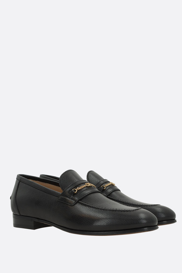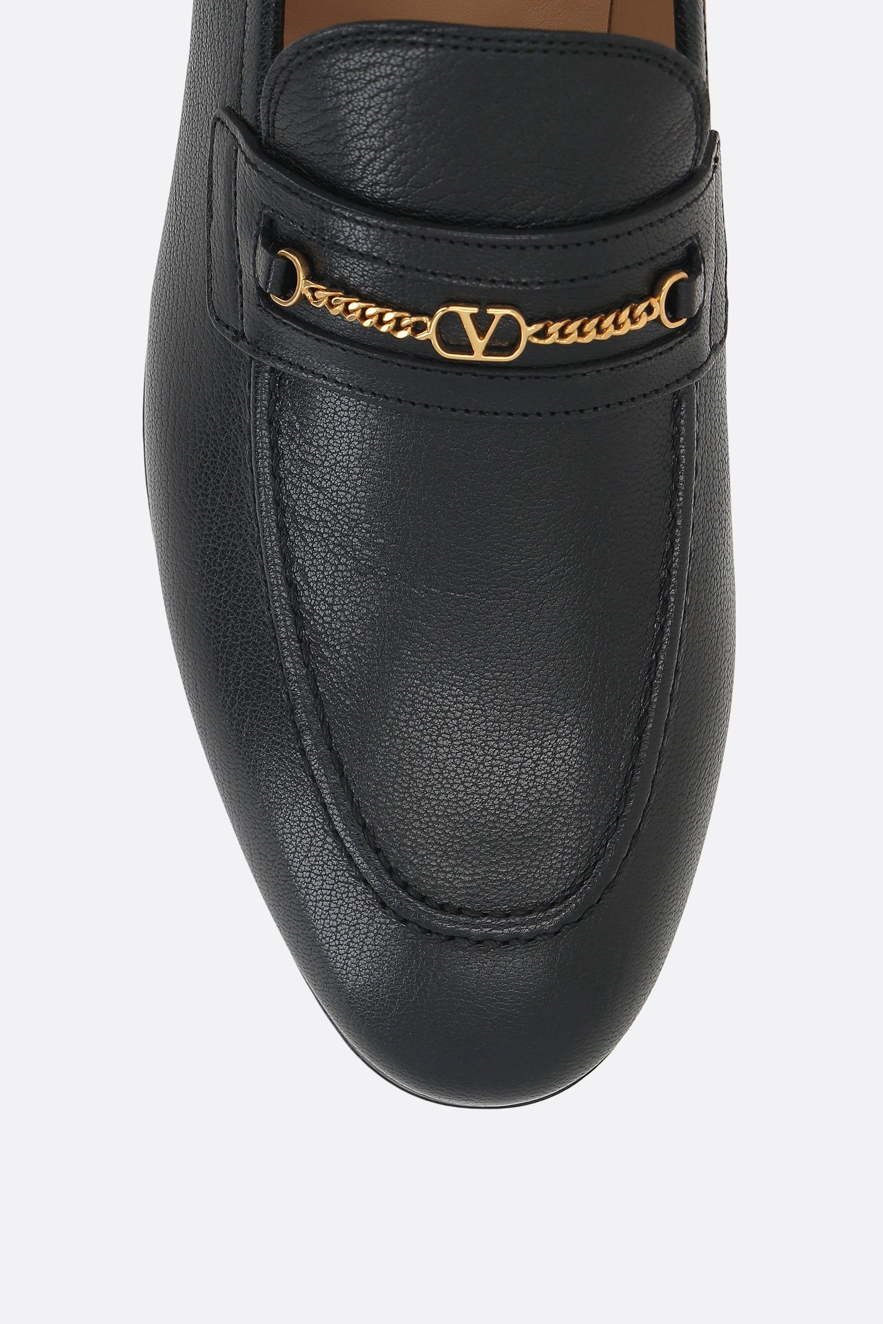 Valentino Garavani loafers made from black hammered leather. Featuring an almond-shaped toe, leather linings, and leather sole. The design is completed with a chain featuring antique gold-tone VLogo Signature detail.