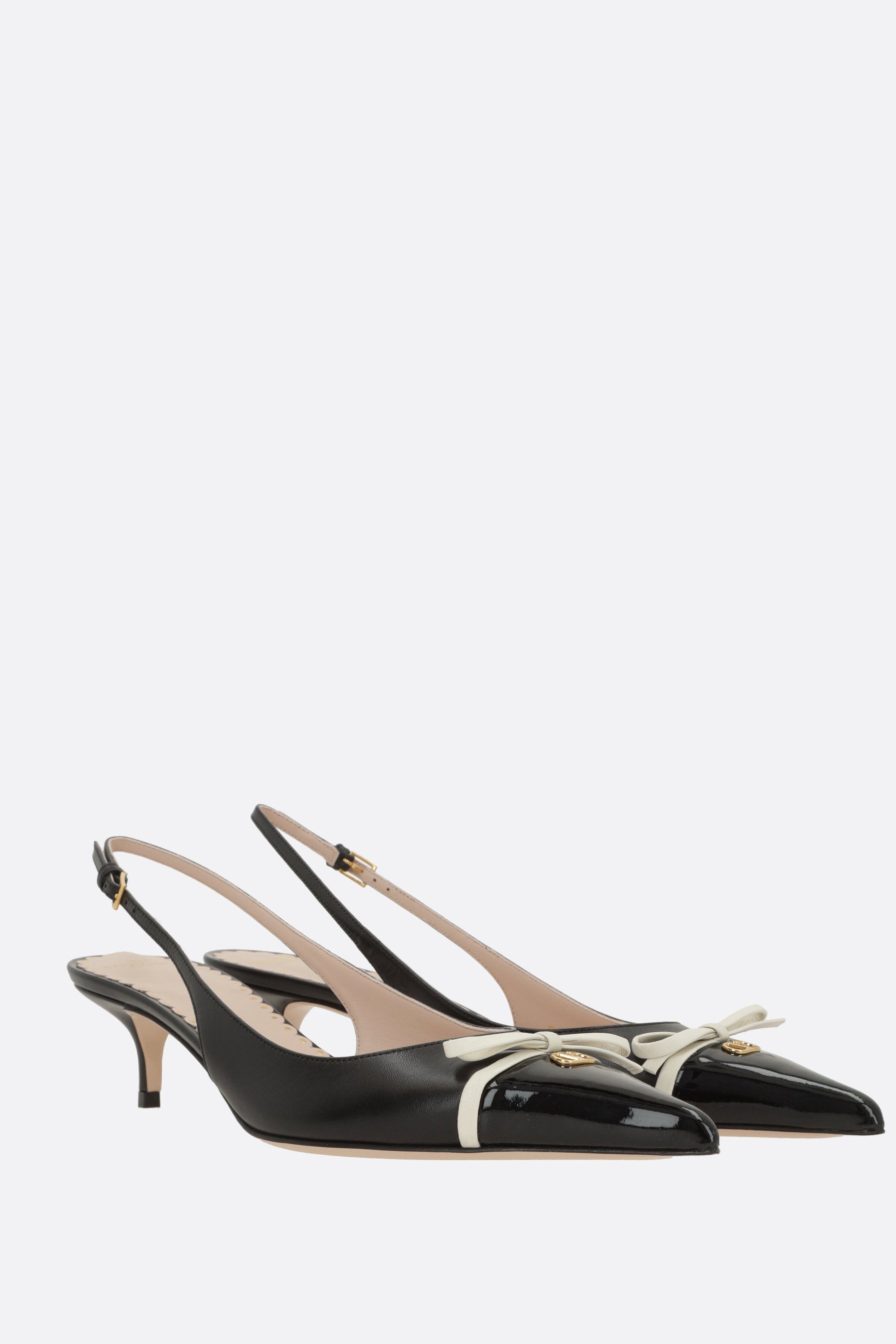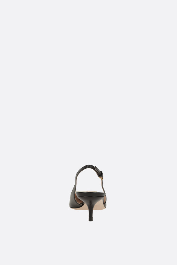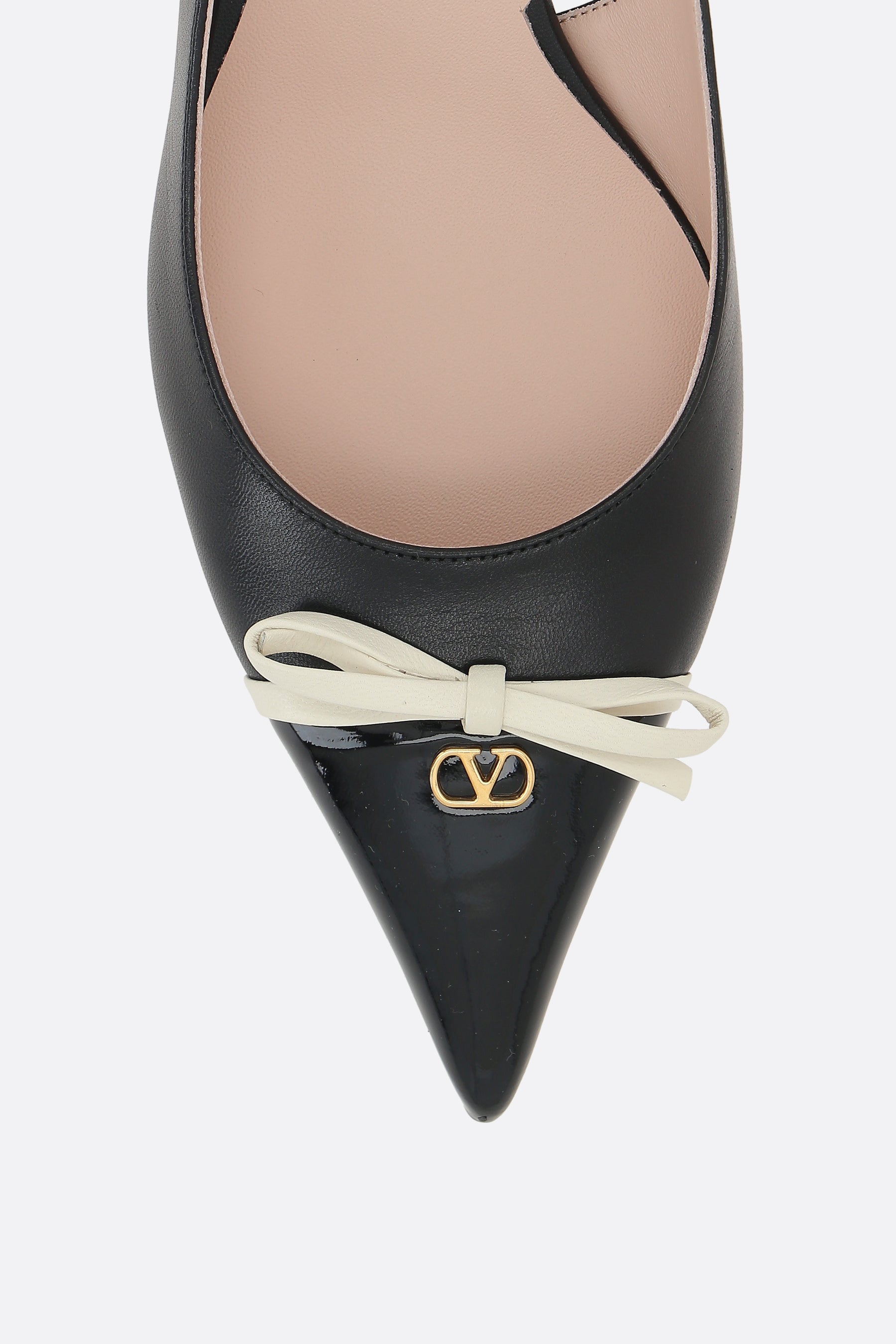 Valentino Garavani slingbacks crafted from black leather with a tone-on-tone patent toe, accented with a contrasting bow and antique gold-tone metal VLogo Signature detail. Featuring a pointed toe, adjustable ankle strap with metal buckle, leather lining, and leather sole. The design is completed with a covered kitten heel.