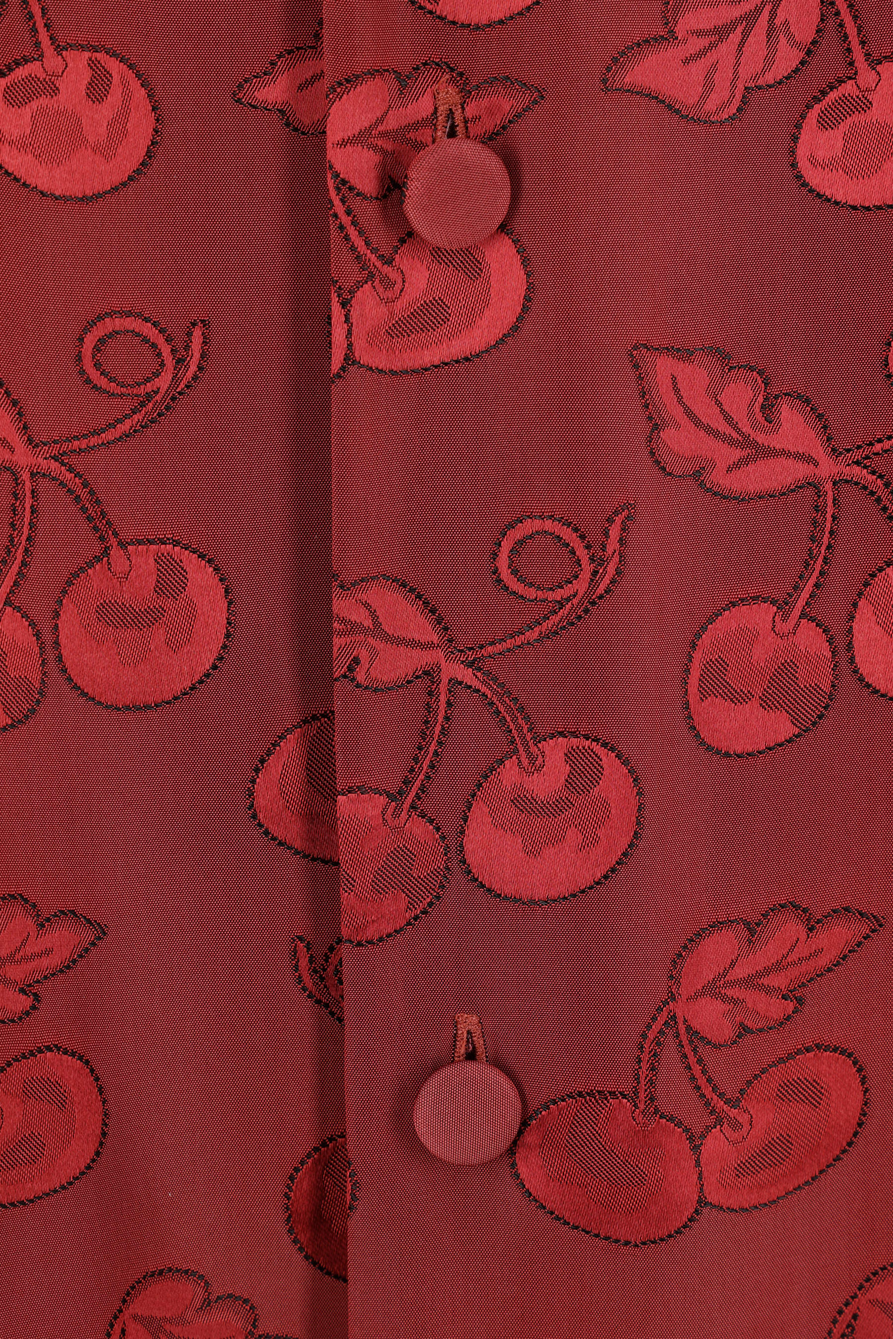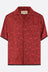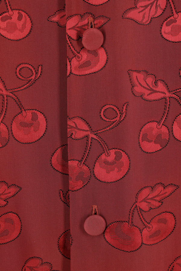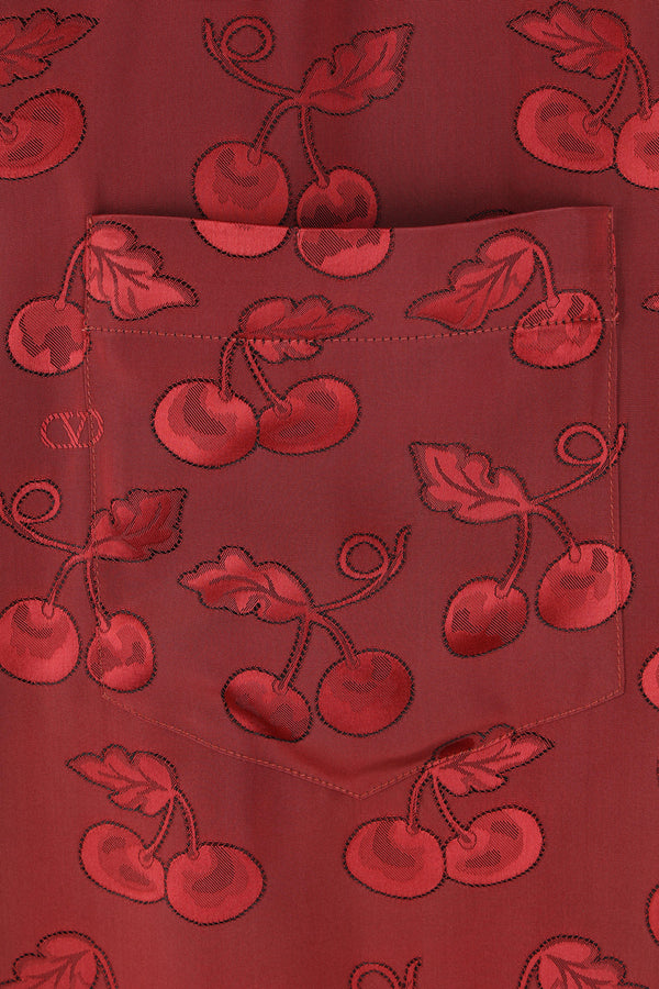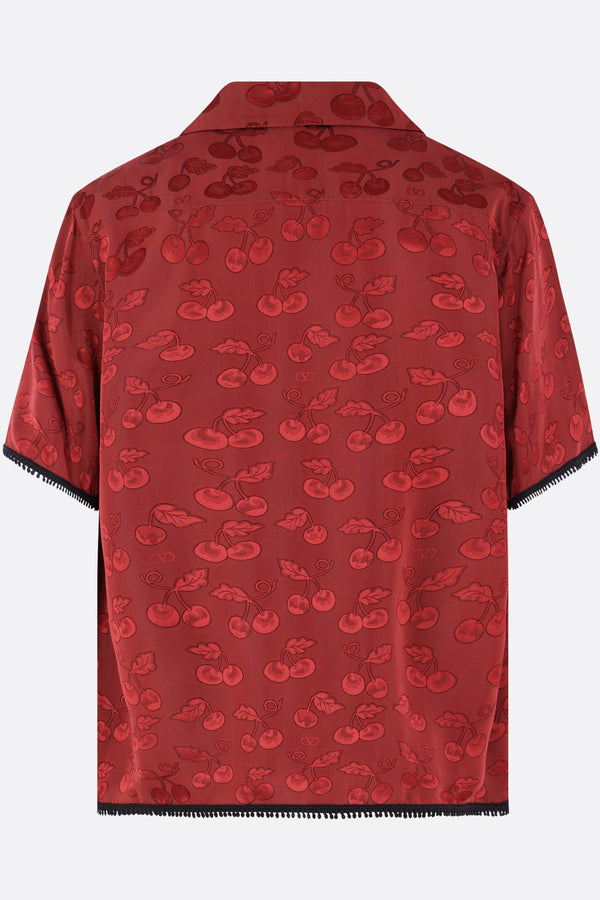 Valentino Garavani bowling shirt crafted from dark red viscose with a Cherryfic jacquard pattern and contrasting trim details. It features a notched collar, front covered button closure, chest pocket, short sleeves, and a straight hem.
