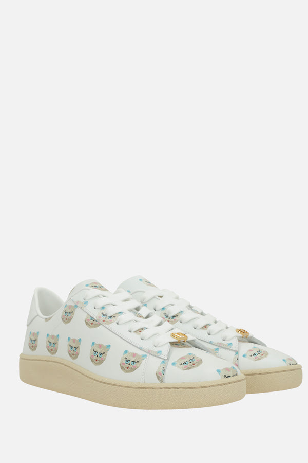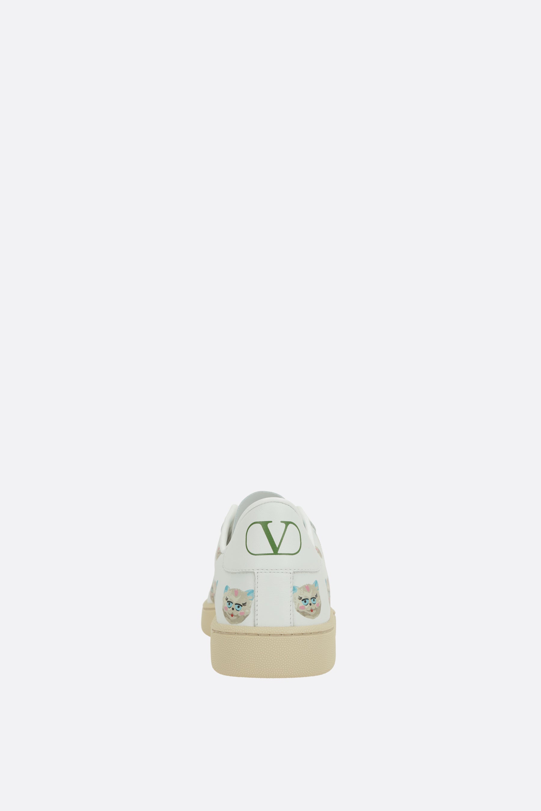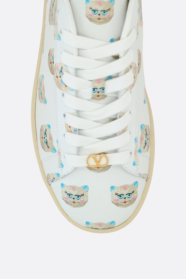 Valentino Garavani low-top sneakers made from white nappa leather with Le Chat De La Maison motif. Featuring lace-up closure, rounded toe, leather linings, and rubber sole. The design is completed with a removable metal VLogo Signature detail and a screen-printed VLogo Signature on the heel.