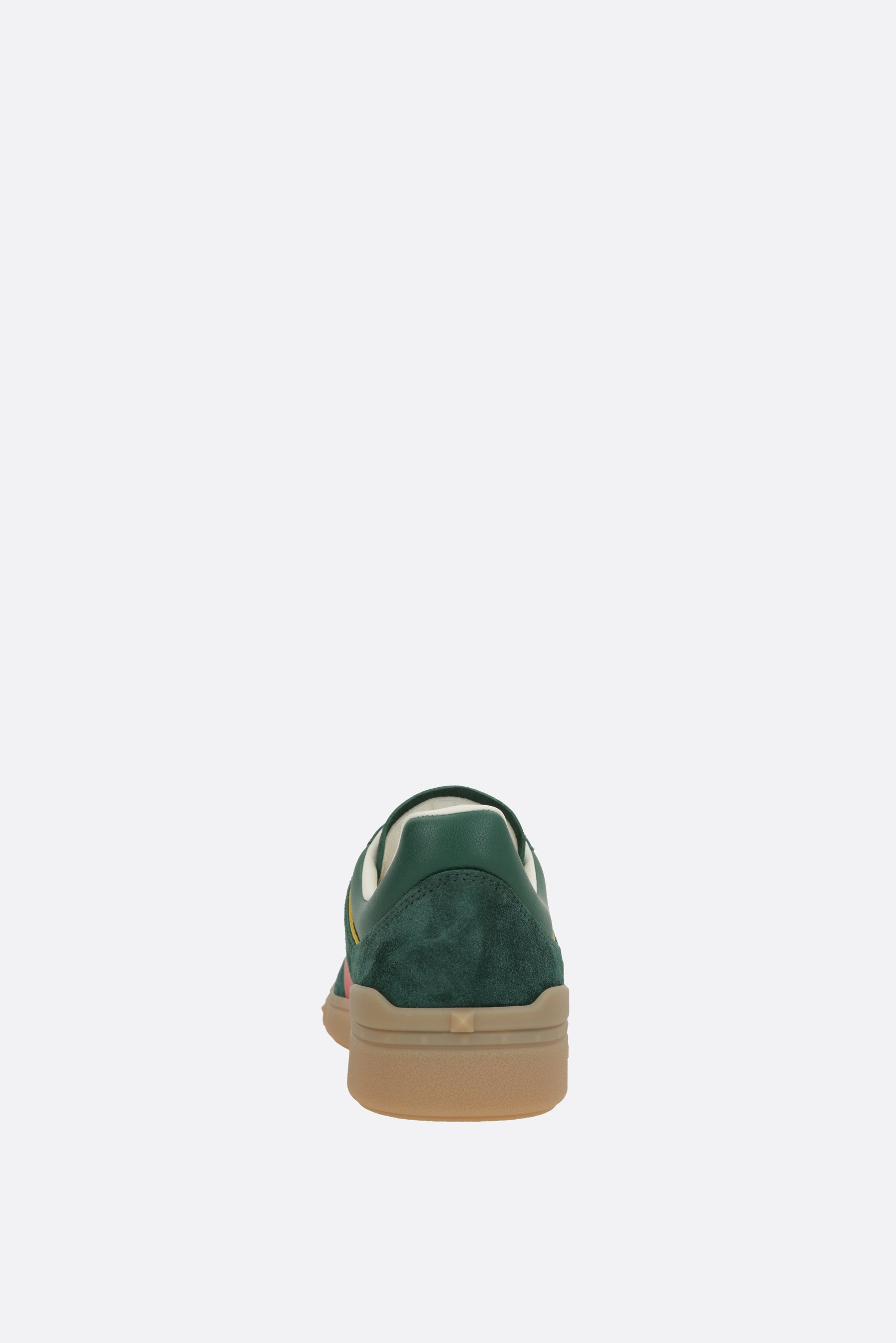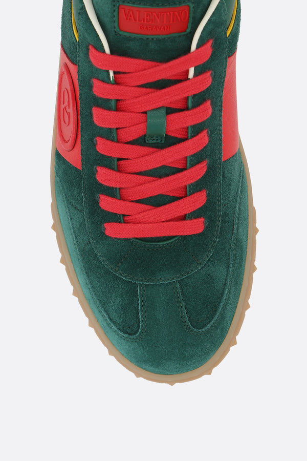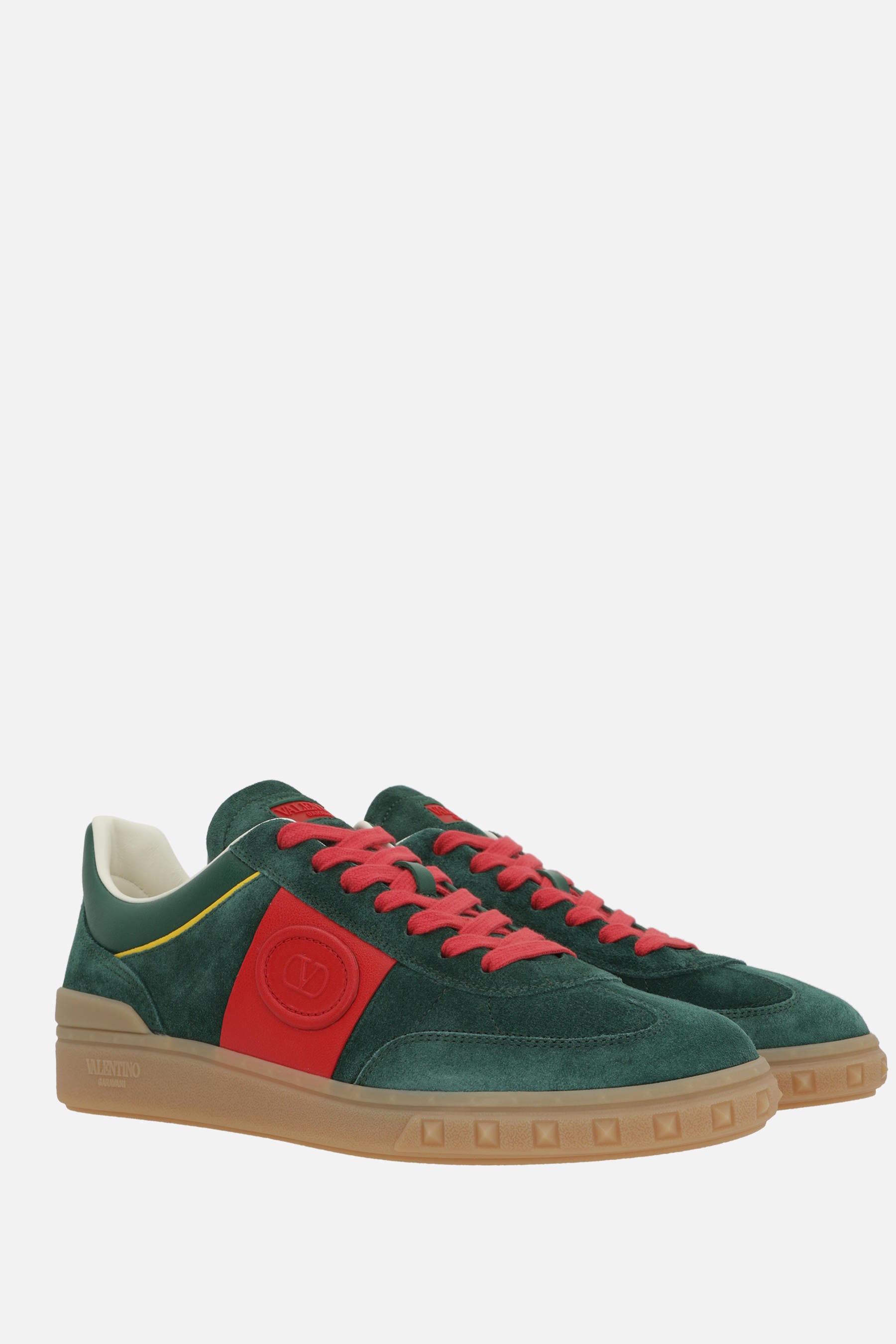 Valentino Garavani low-top sneakers made from green suede with nappa leather stripes and a leather patch featuring VLogo Signature detail. Featuring lace-up closure, rounded toe, leather and fabric linings, and rubber sole with studded detail. The design is completed with a rubber logo patch on the tongue.