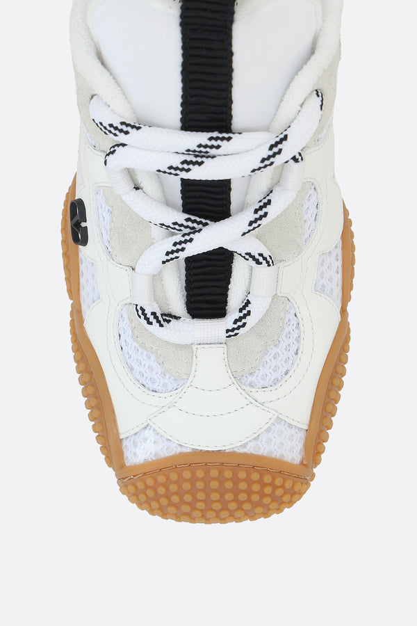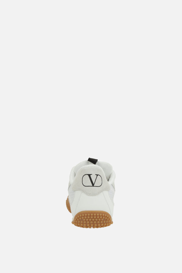 Valentino Garavani low-top sneakers made from white mesh and rubberized leather with ice-colored suede details. Featuring lace-up closure, slightly squared toe, terry cloth linings, and rubber sole. The design is completed with a lateral rubber-applied VLogo Signature, screen-printed VLogo Signature on the heel, and a striped fabric pull-tab on the tongue.