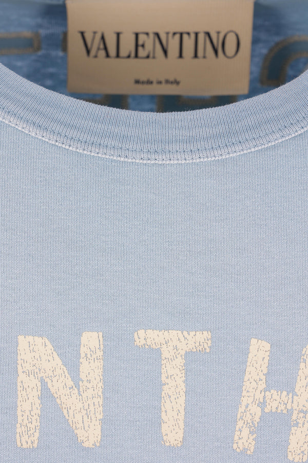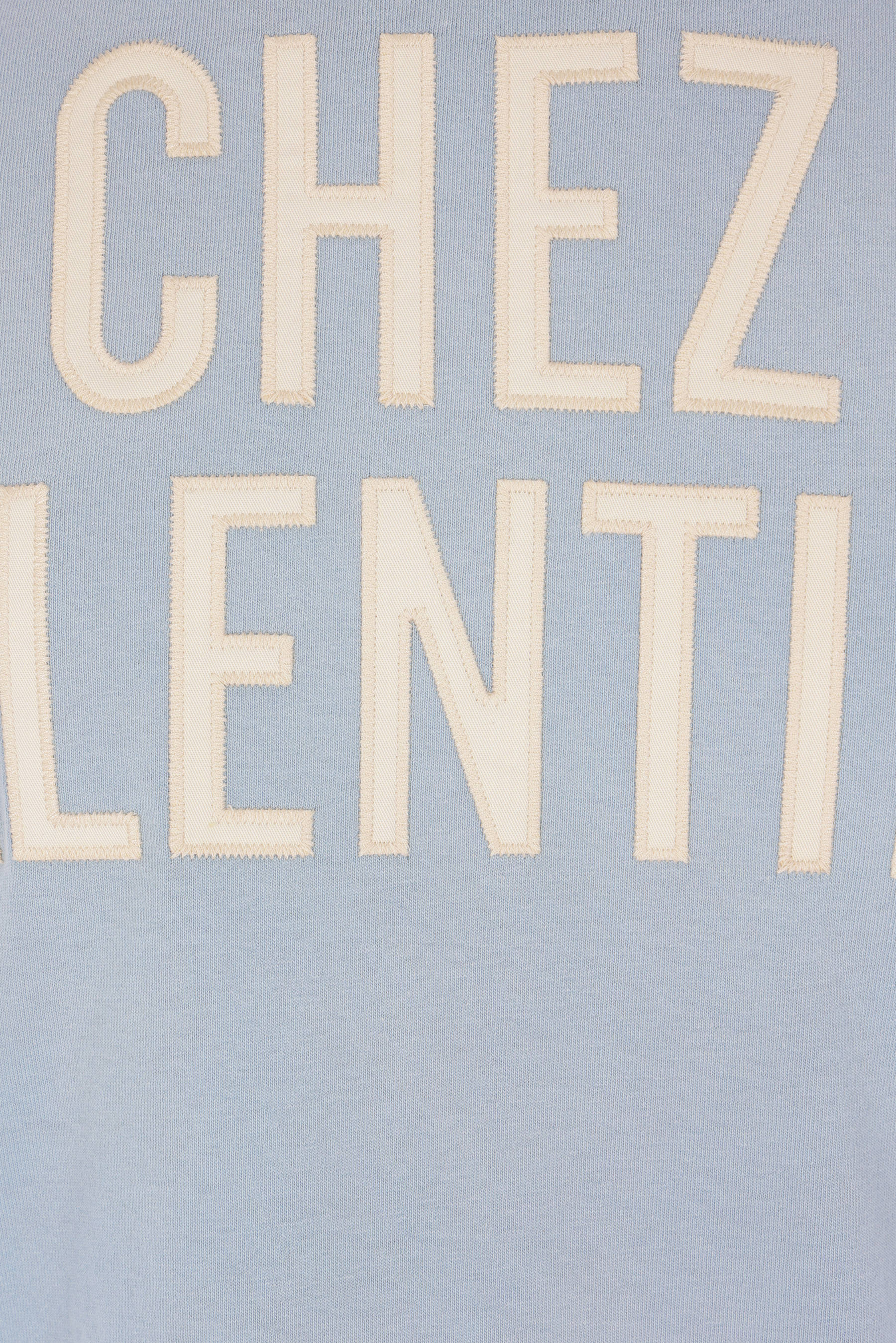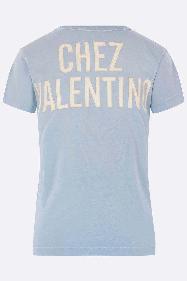 Valentino Garavani t-shirt crafted in light blue cotton jersey, featuring a Panther Lady print on the front and an embroidered “Chez Valentino” lettering patch on the back. Designed with a crew neckline, short sleeves, and a straight hem.