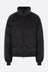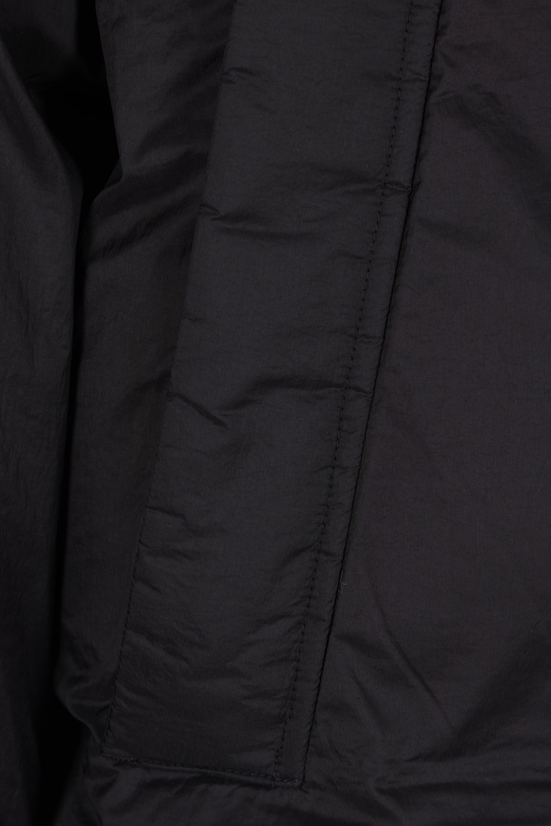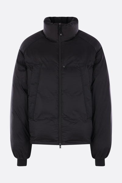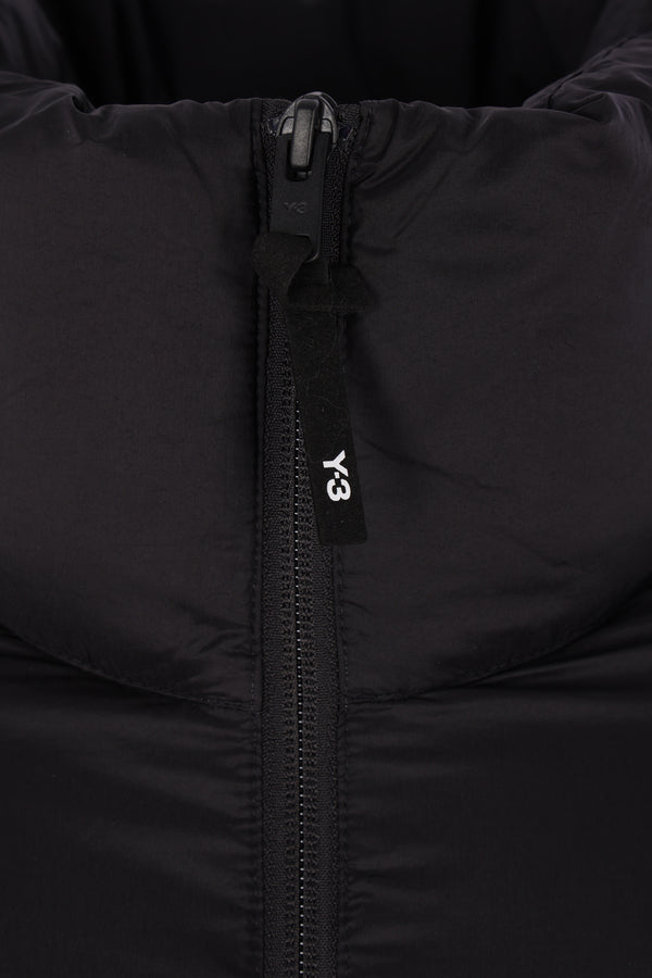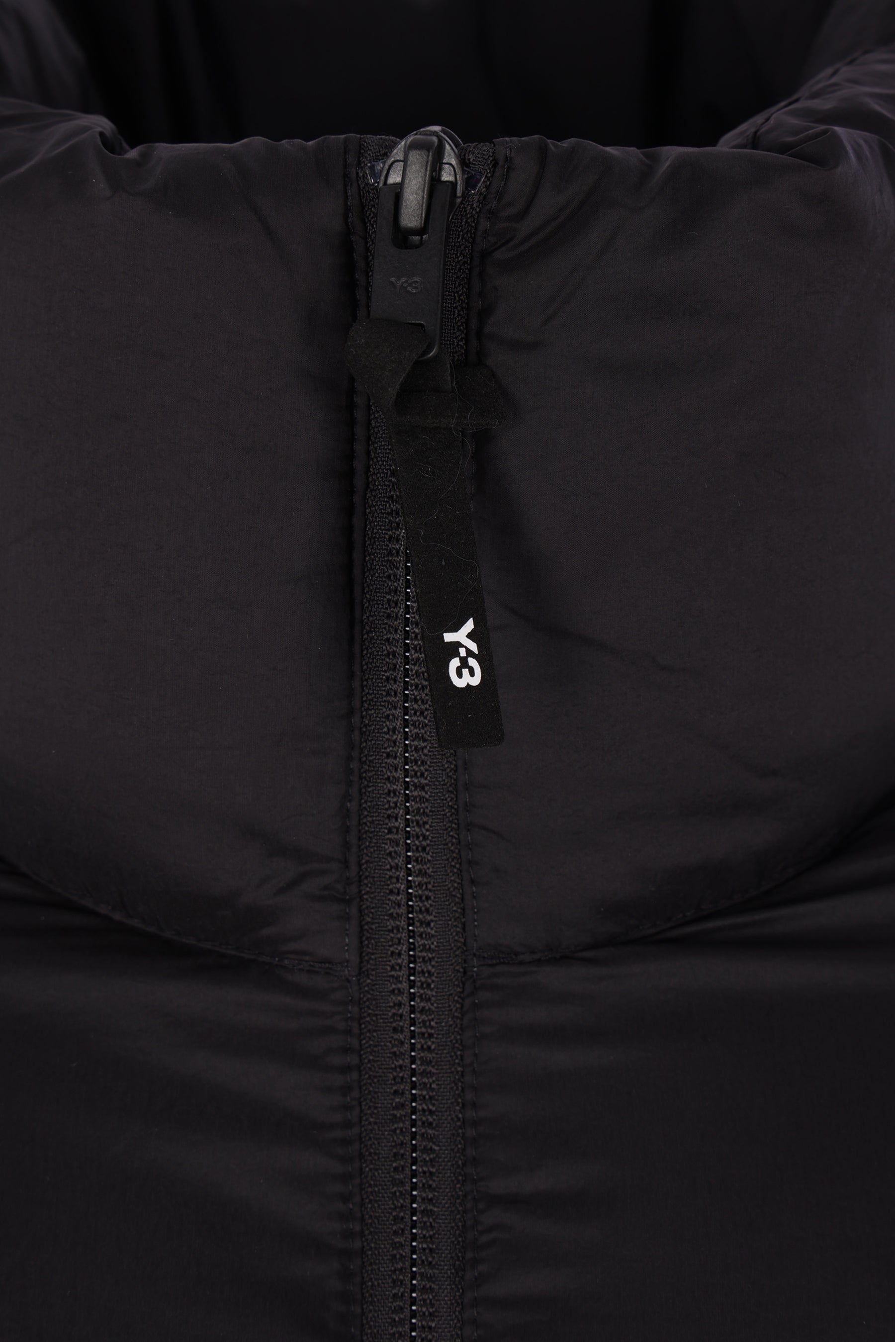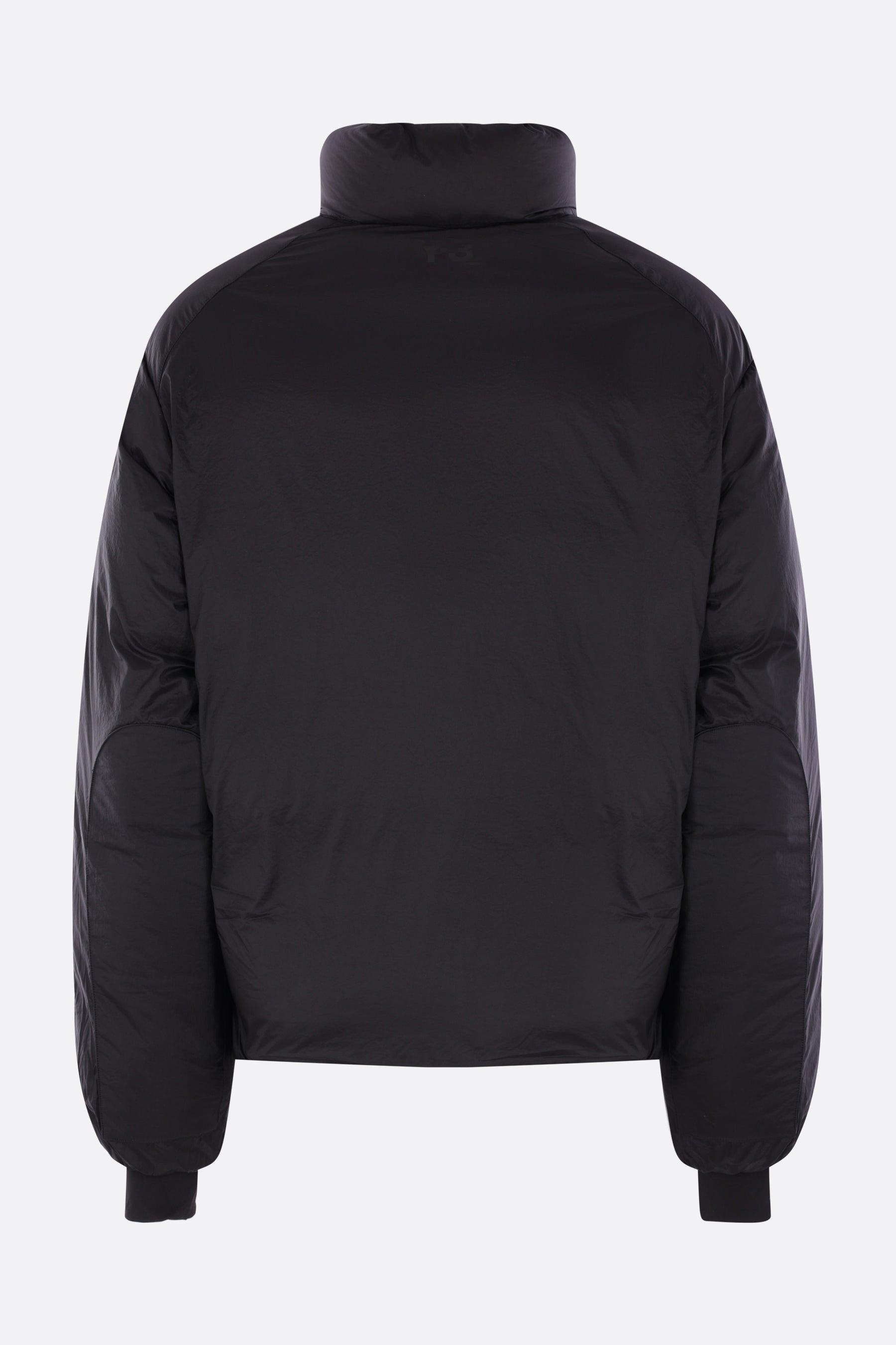 Y-3 down jacket made from black nylon with a tone-on-tone logo print on the back. Features a high collar, double-zip closure, zippered side pockets, long sleeves with elasticated cuffs, and a straight hem with drawstring.
