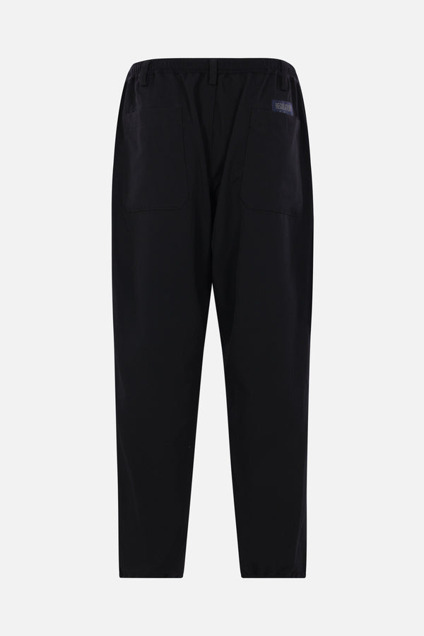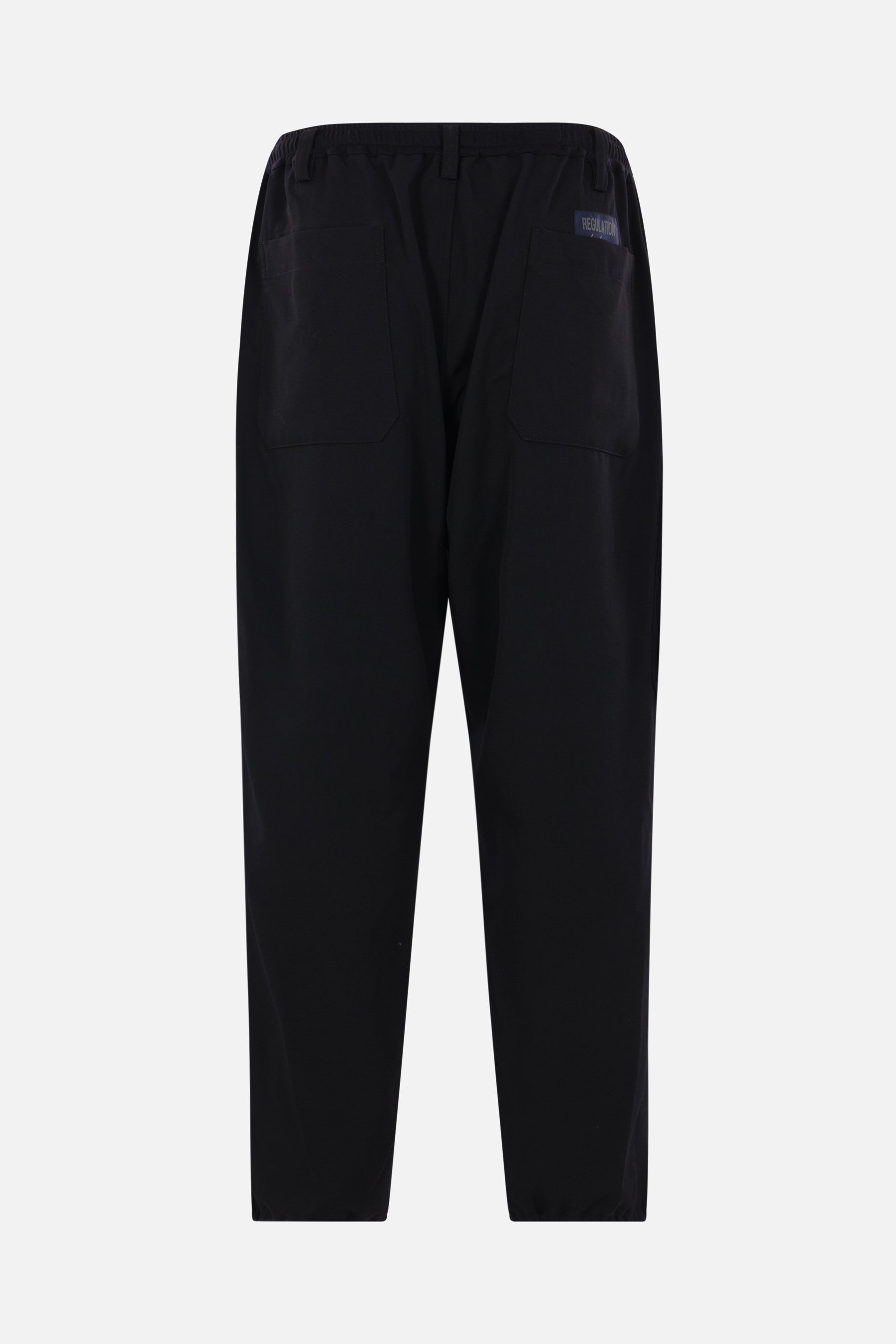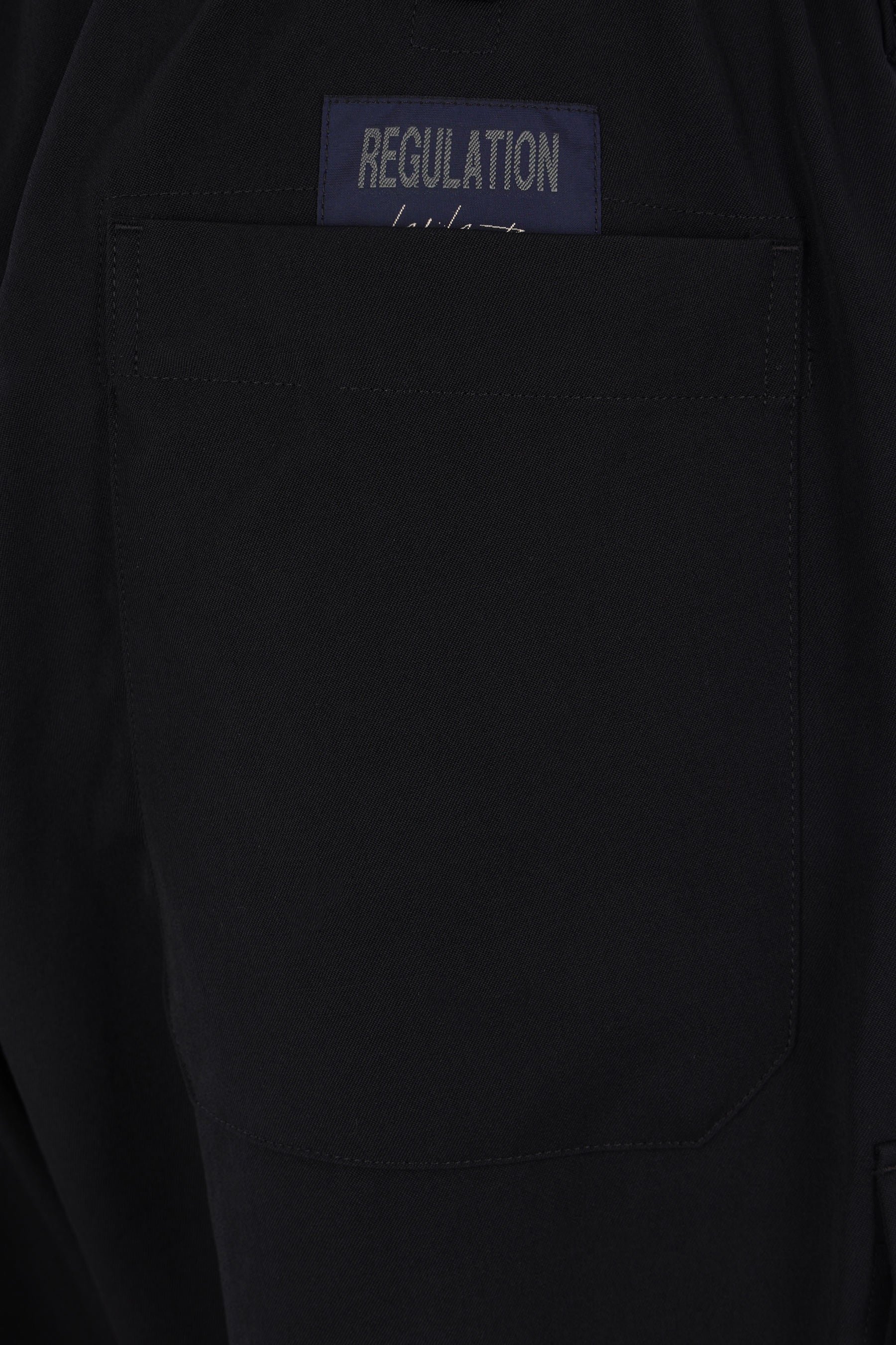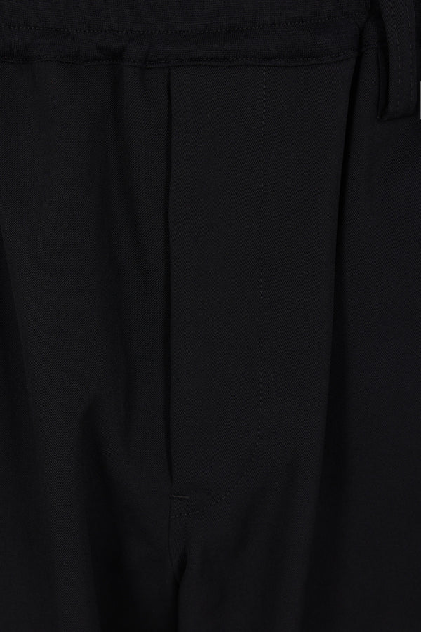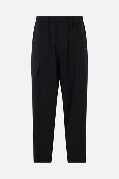 Yohji Yamamoto cargo trousers made from black wool gabardine. Features an elasticated waistband with drawstring, front zip closure, belt loops, multiple pockets, and elasticated hems.