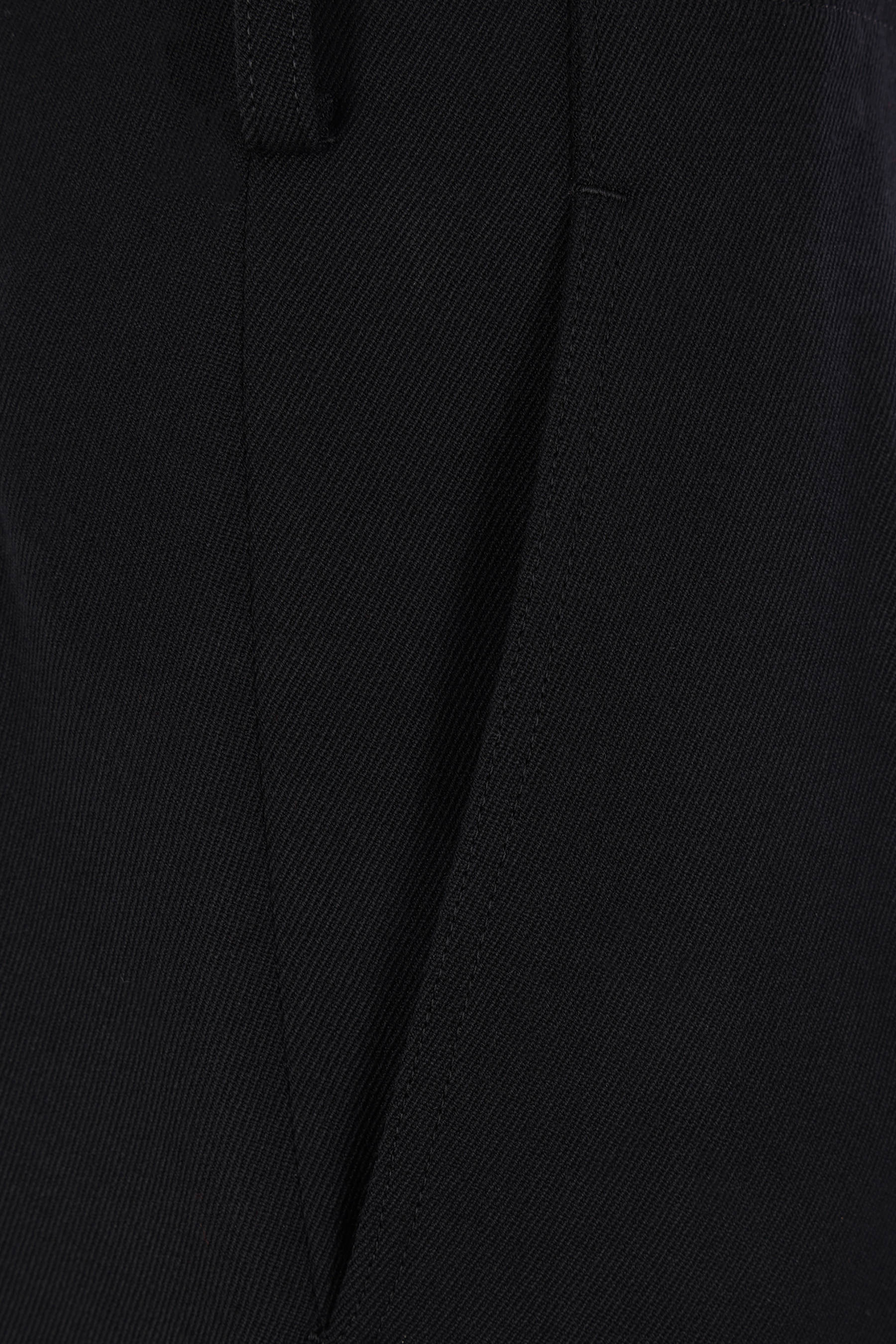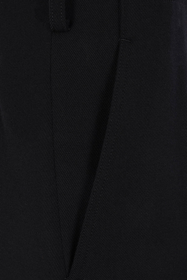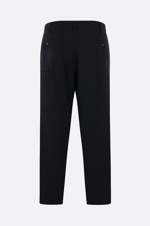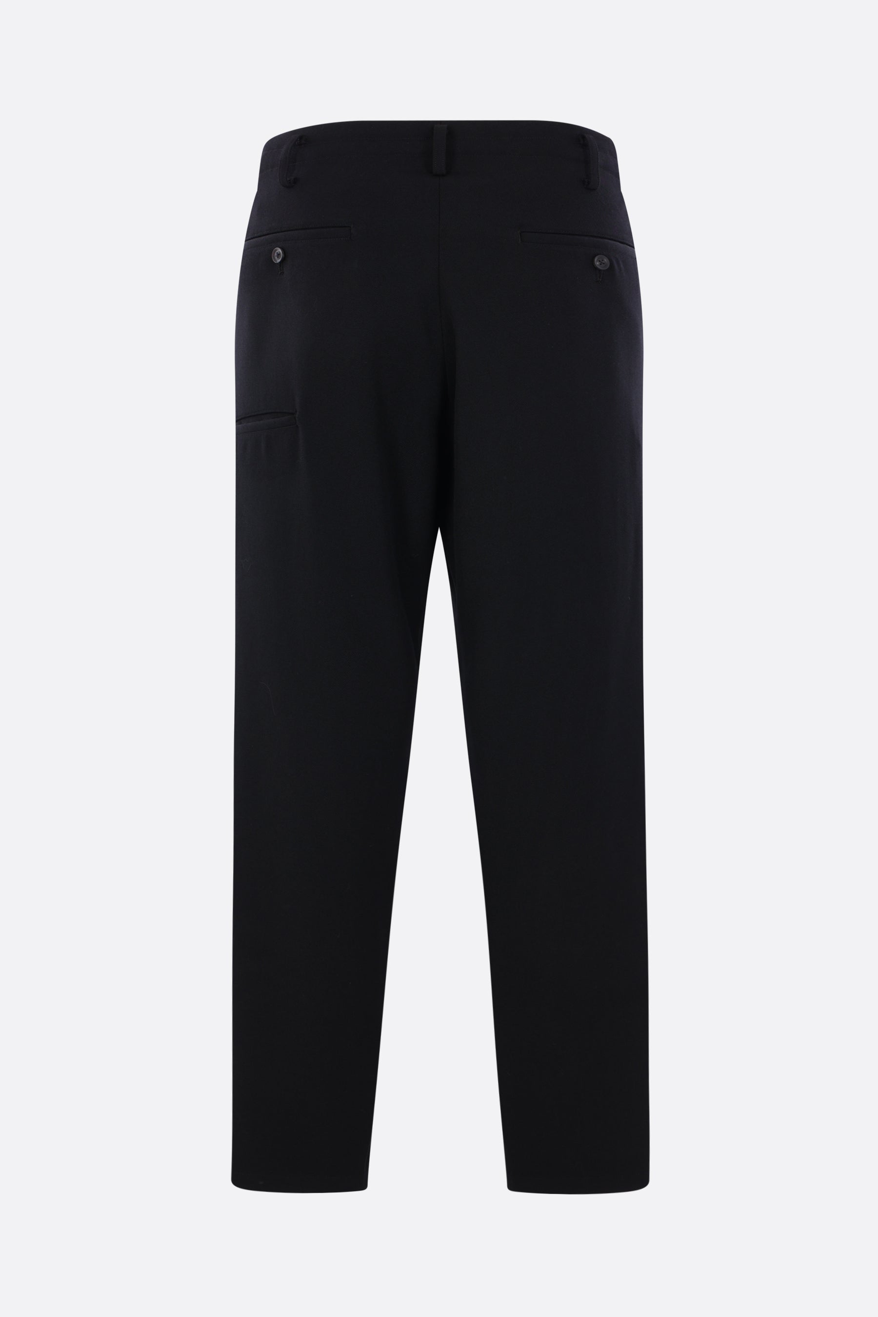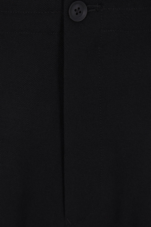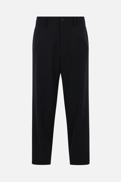 Yohji Yamamoto trousers made from black wool gabardine. Features a drawstring waist, front button and zip closure, belt loops, multiple pockets, and partially lined interior.