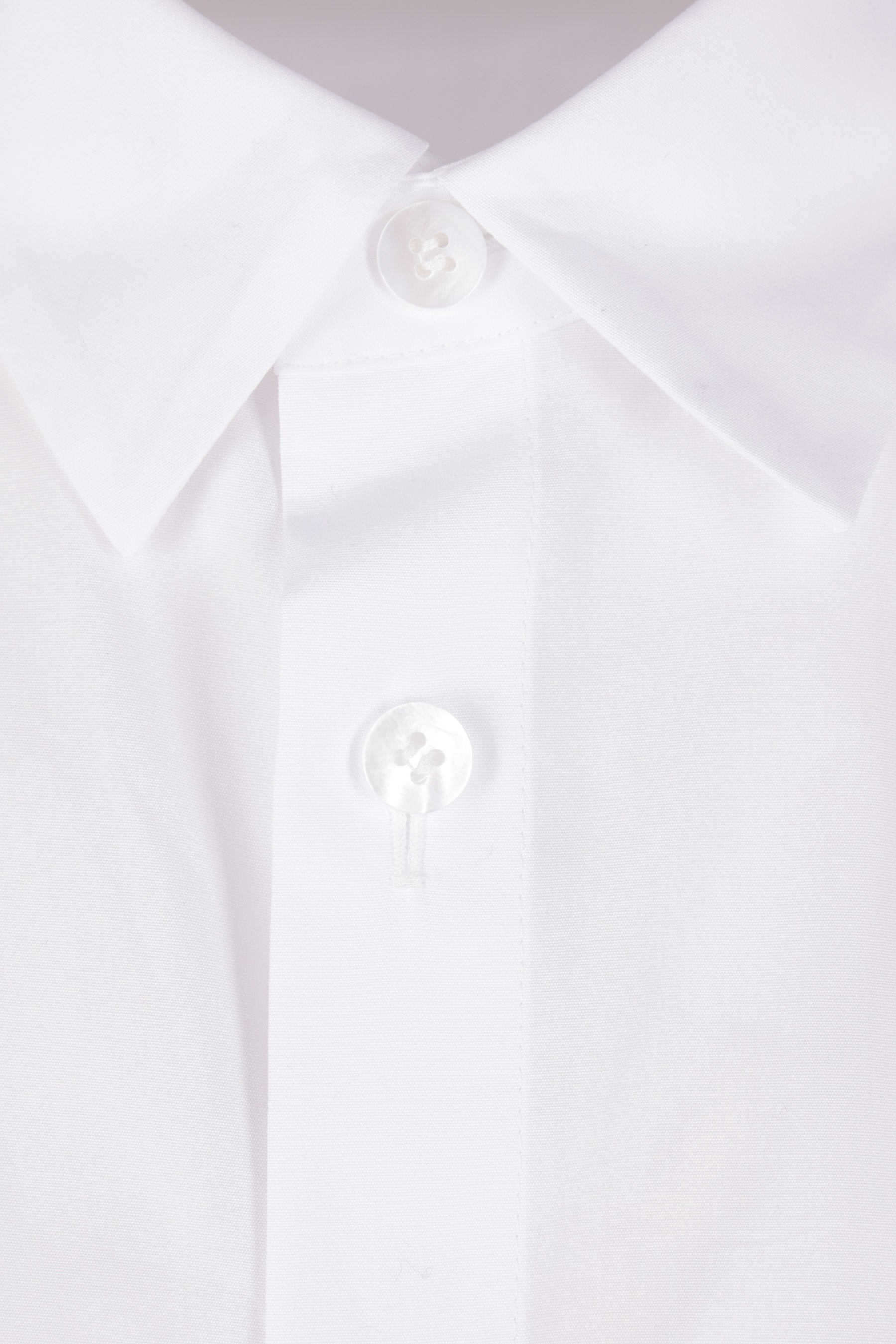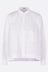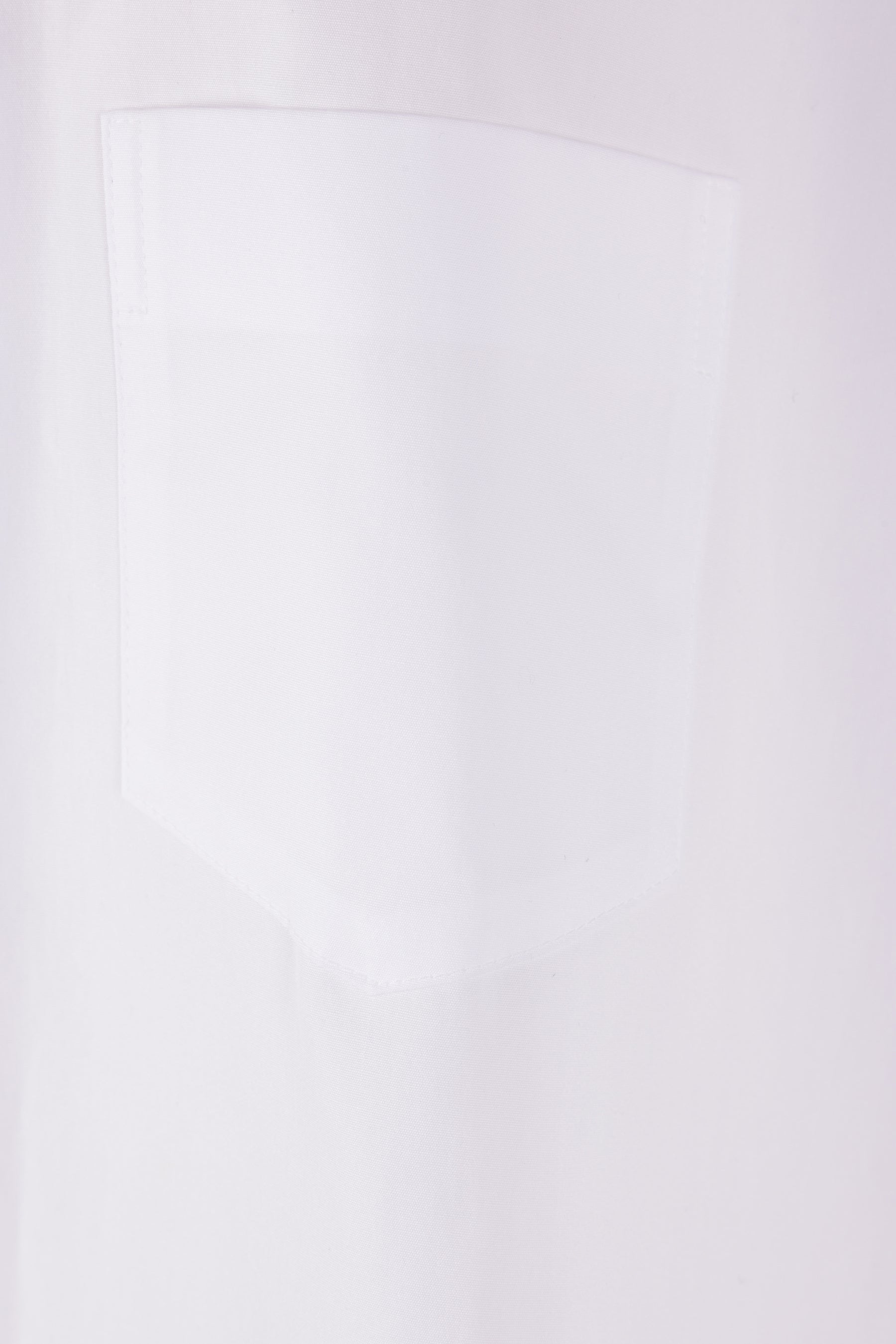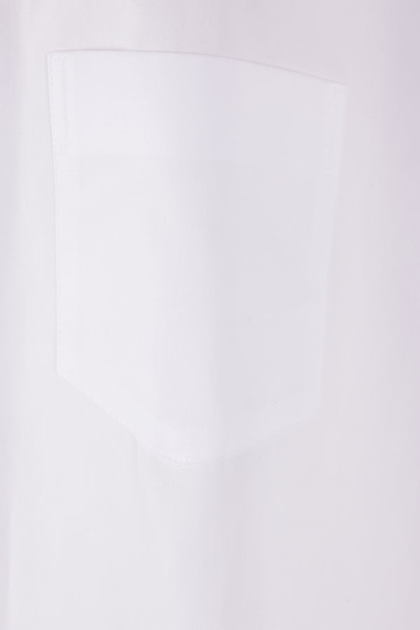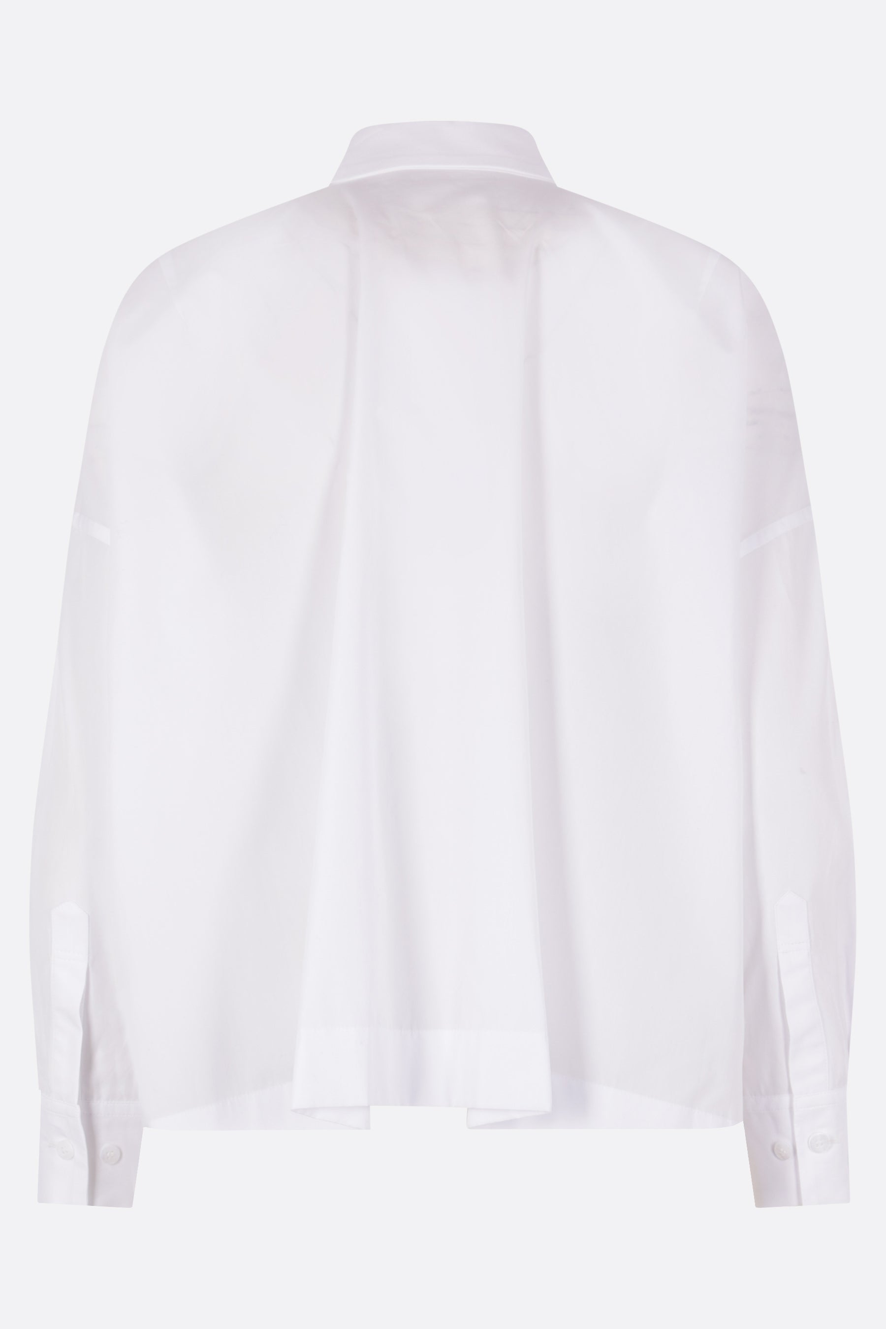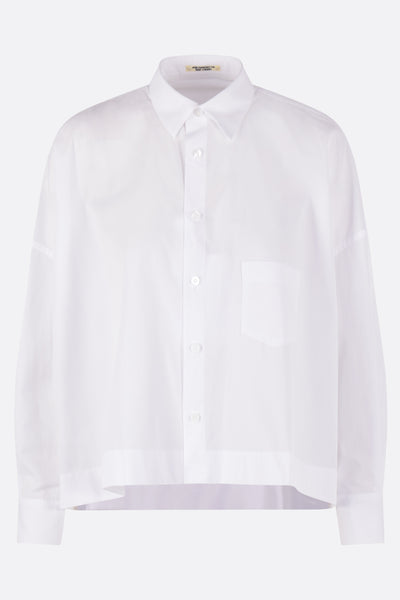 Yohji Yamamoto oversized, slightly cropped shirt crafted in white cotton poplin. Features a classic collar, front button closure, chest patch pocket, long sleeves with buttoned cuffs, and a straight hem that is longer at the back with side slits.