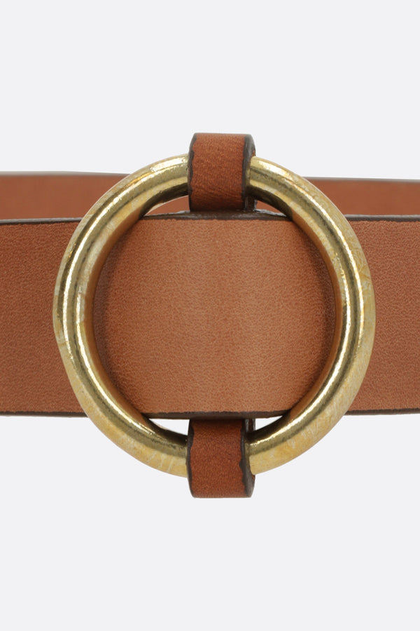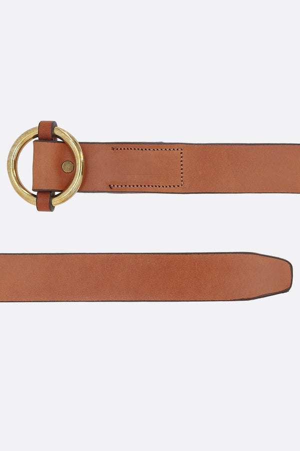 Yuketen belt crafted from light brown smooth leather. Featuring an adjustable round gold-tone metal buckle.
