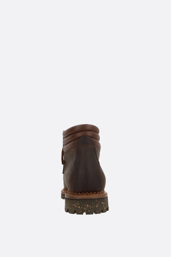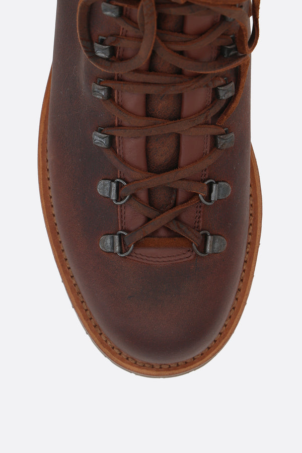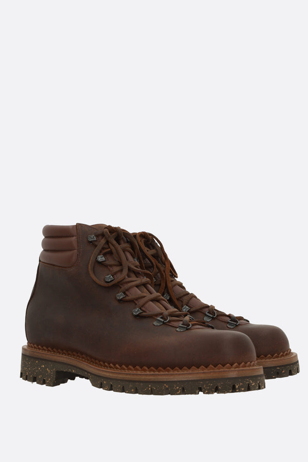 Yuketen hiking boots crafted from brown leather. Featuring lace-up closure, rounded toe, padded collar, leather linings, and a Cortina rubber sole.