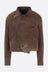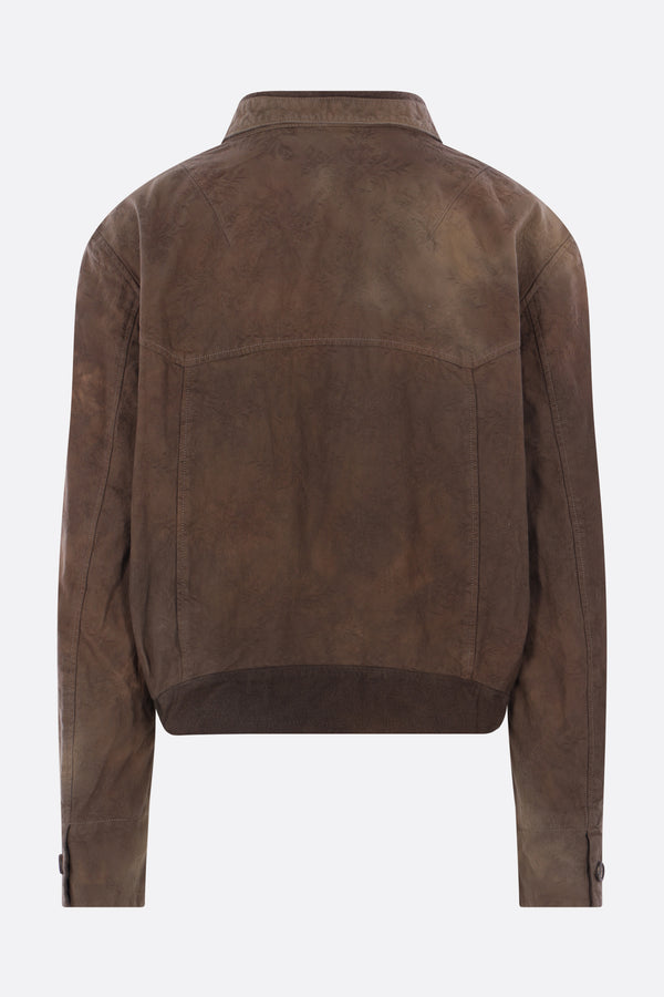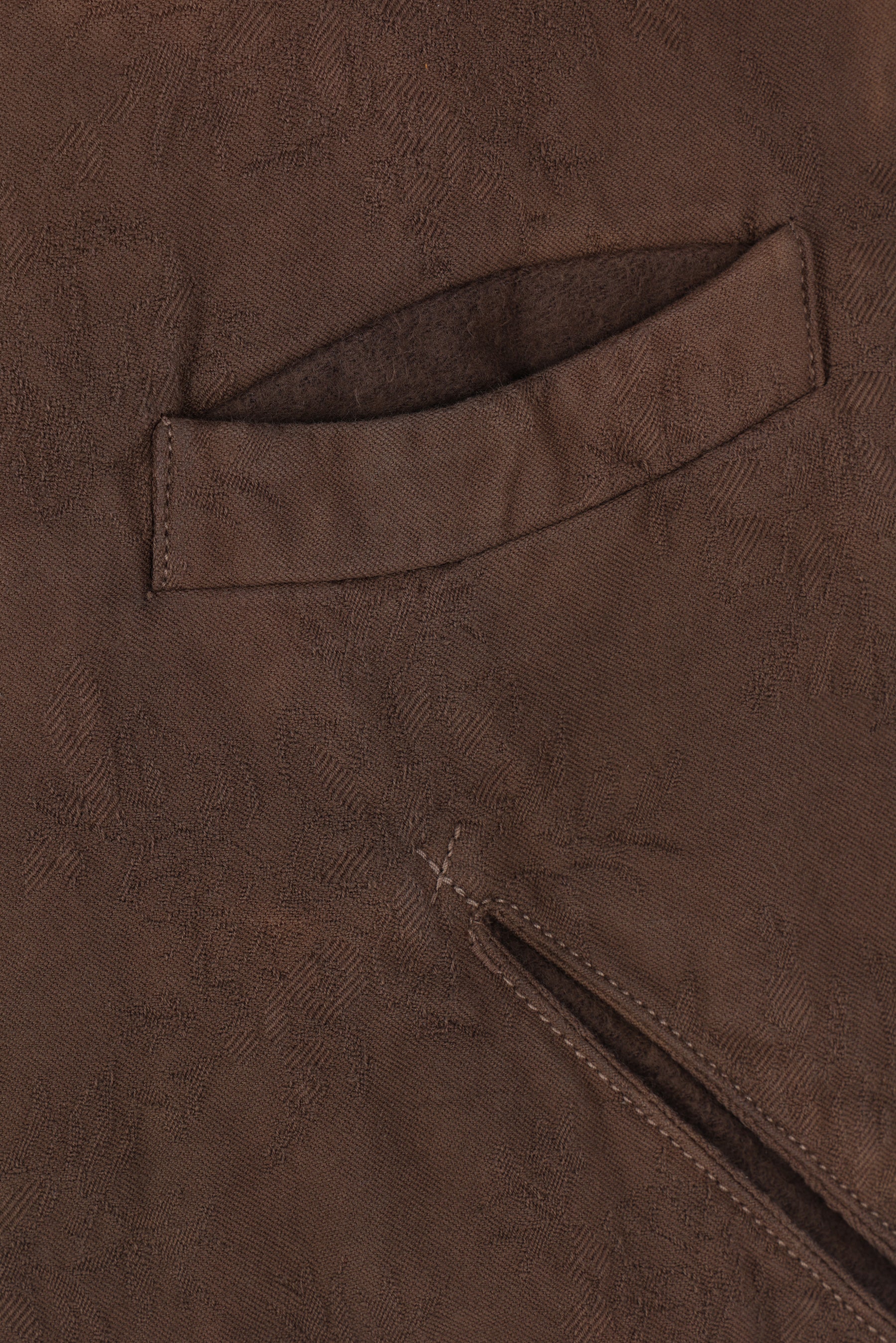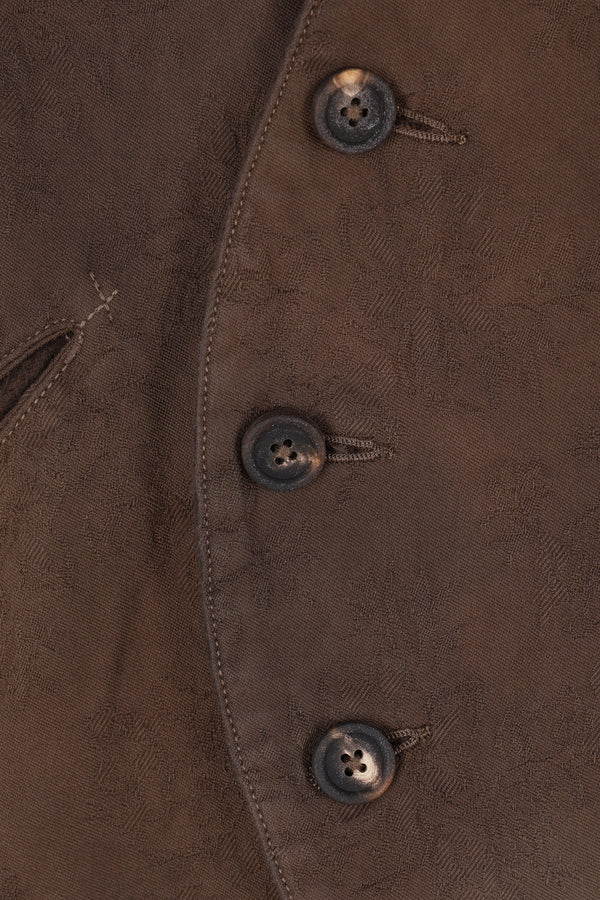 Ziggy Chen worker jacket made from dark gray floral jacquard cotton. Features a pointed collar, asymmetric button closure, multiple pockets, long sleeves with buttoned cuffs, and a rounded hem. Lined interior.
