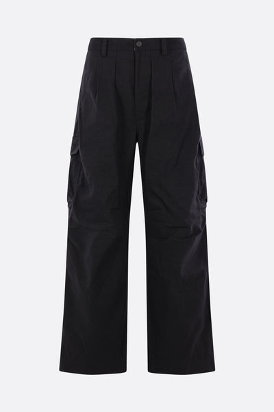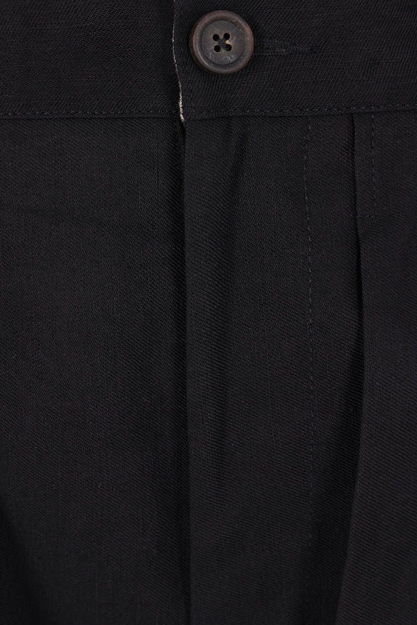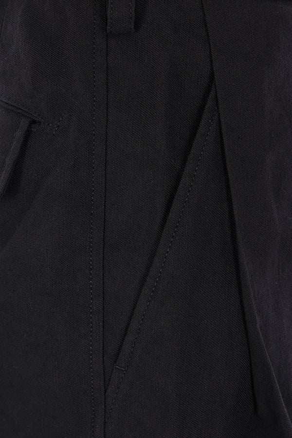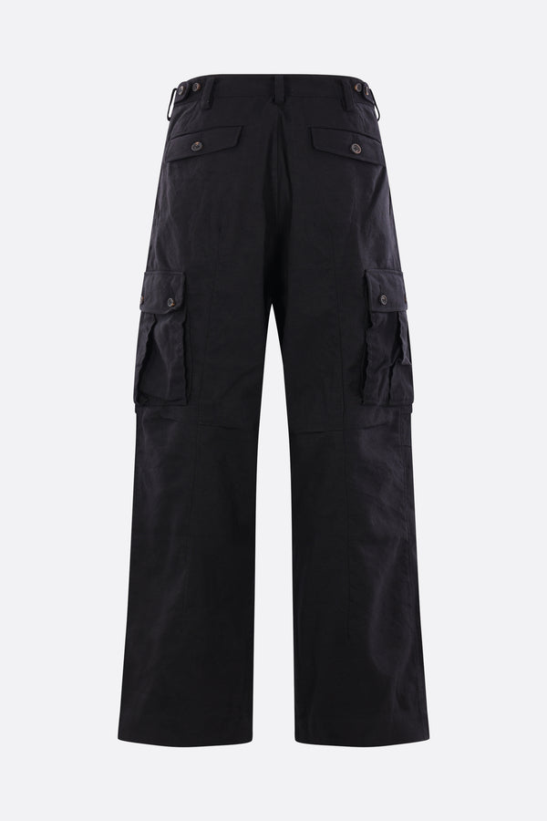 Ziggy Chen cargo trousers crafted from black wool-linen blend gabardine. Features a front button and zip closure, belt loops, adjustable waist tabs, front pleats, multiple pockets, and knee pleats.