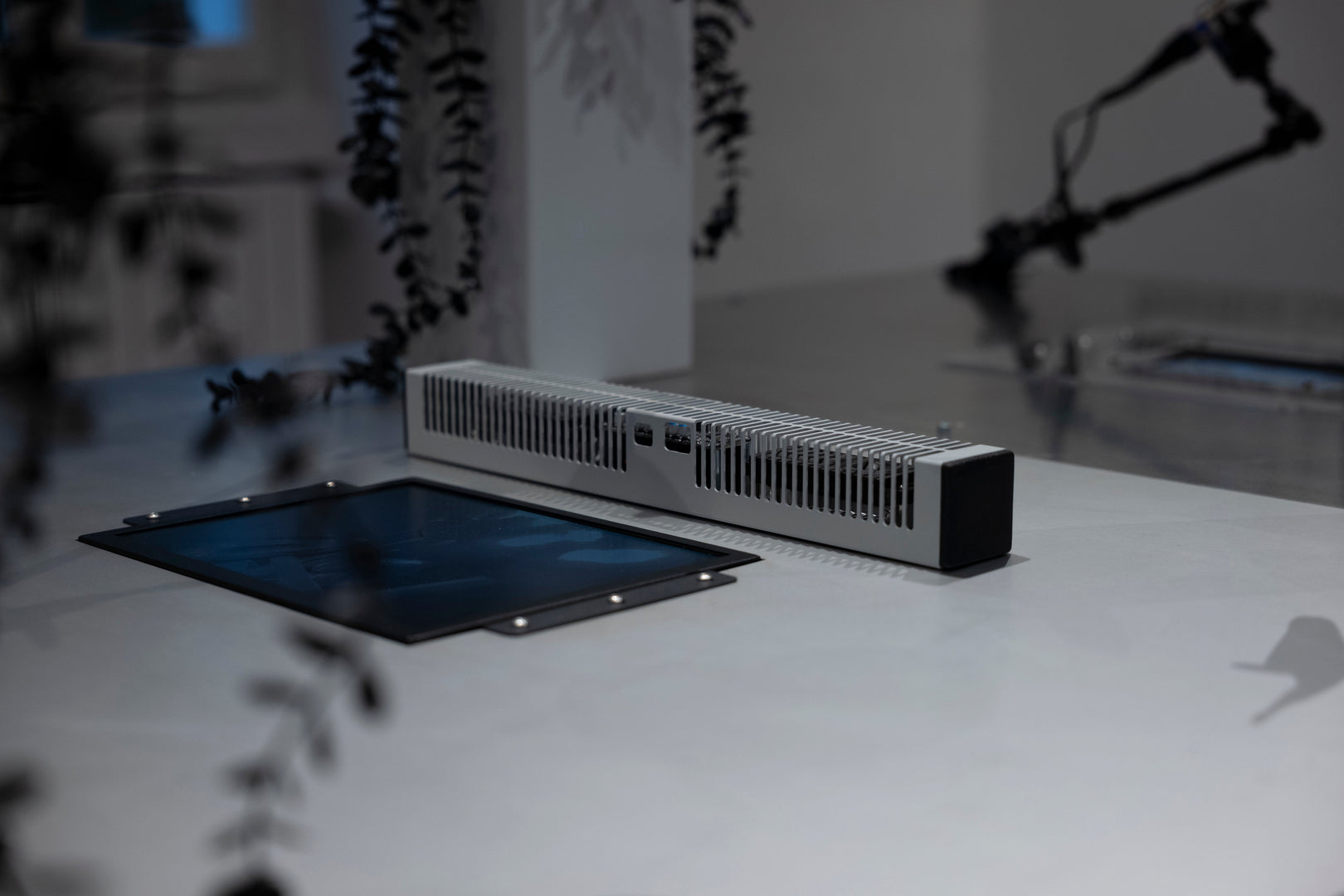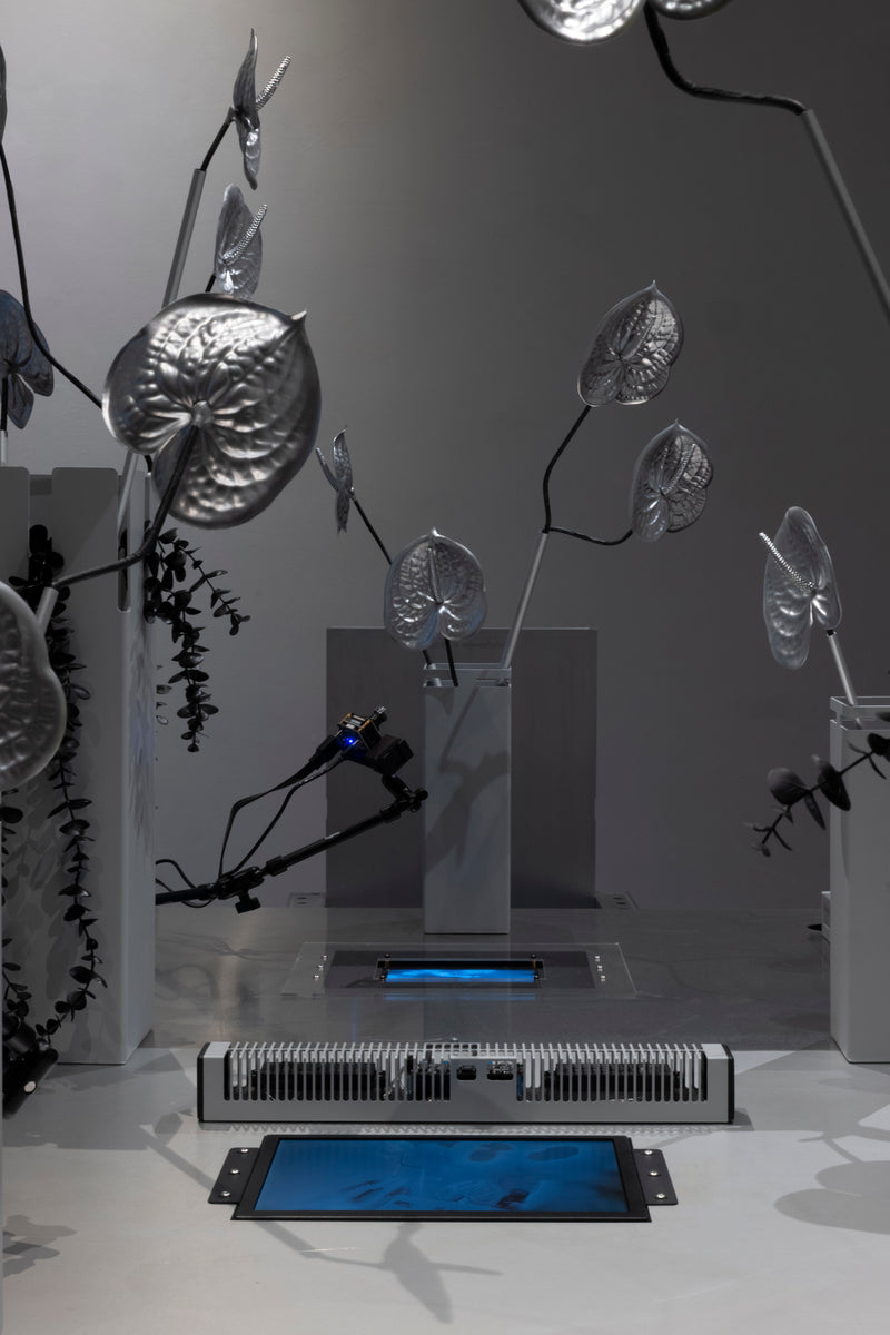 Dal 16 al 24 dicembre, il Mezzanino ospita l’installazione dove un tavolo di grandi dimensioni integra tre monitor e ospita una costellazione di elementi sonori. Gli speaker cilindrici Bluetooth sono disegnati con la stessa grammatica formale dei vasi che accolgono composizioni di fiori sintetici realizzate da Dimitra Louana Marlanti.