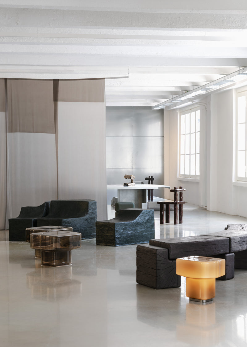In “Fluid Re-Collection”, la prima mostra personale in Italia della designer basata in Belgio, vetro soffiato, legno scuro intagliato ed elementi laccati, realizzati nel suo studio ad Asse, dialogano con i mobili e i modelli d’illuminazione sviluppati in collaborazione con Cassina.