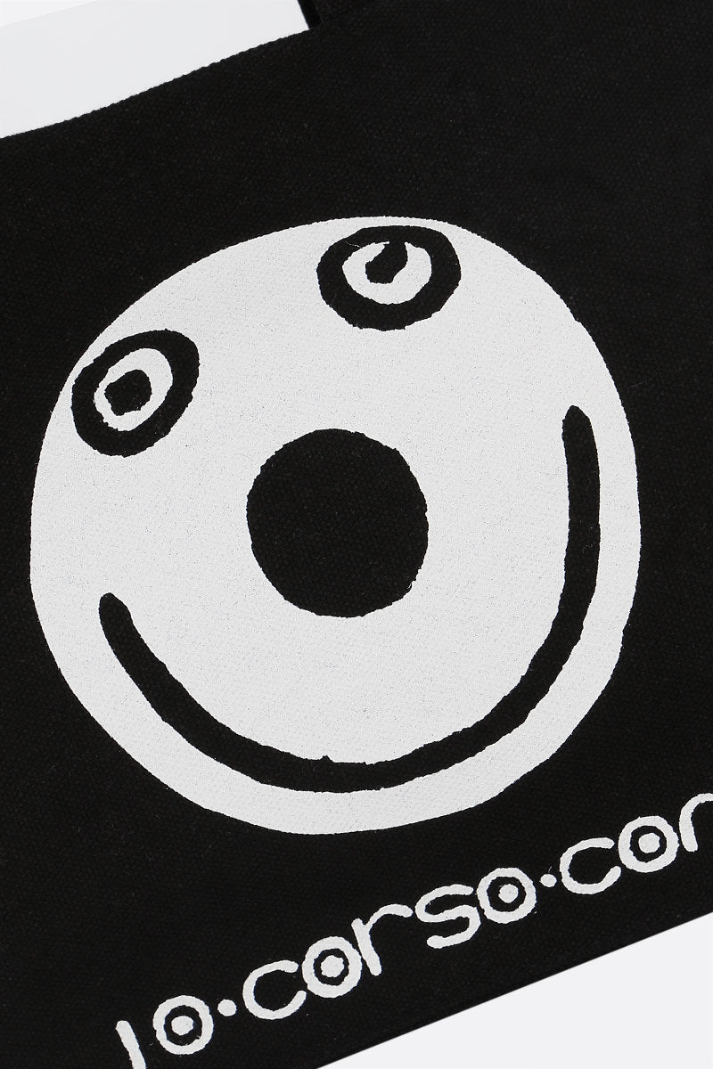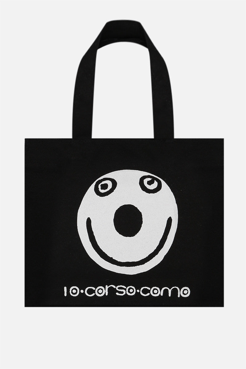 Divertente borsa shopping di 10 Corso Como realizzata in canvas di cotone color nero con stampa smile e logo a contrasto. Il modello è caratterizzato da doppio manico e interno sfoderato.