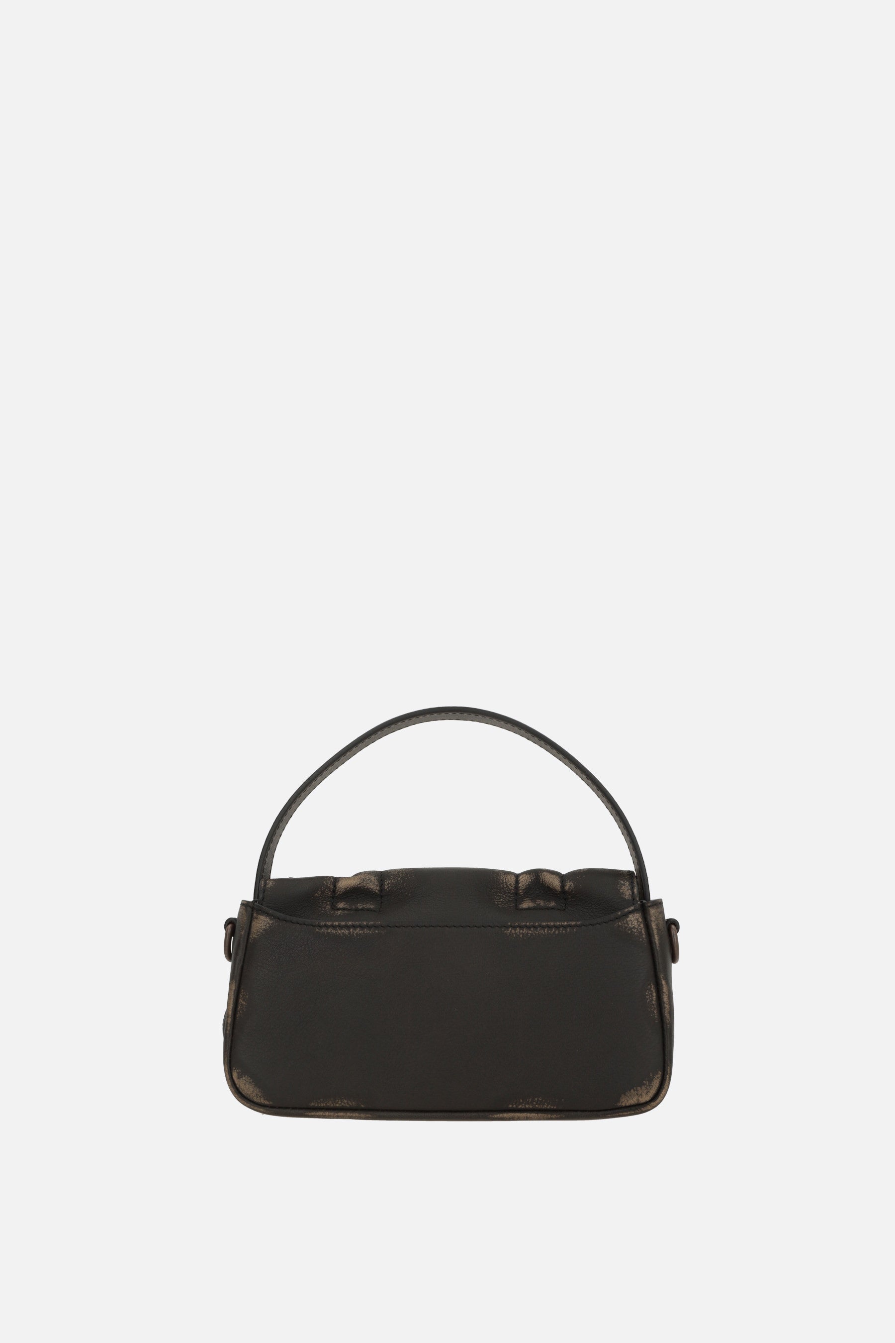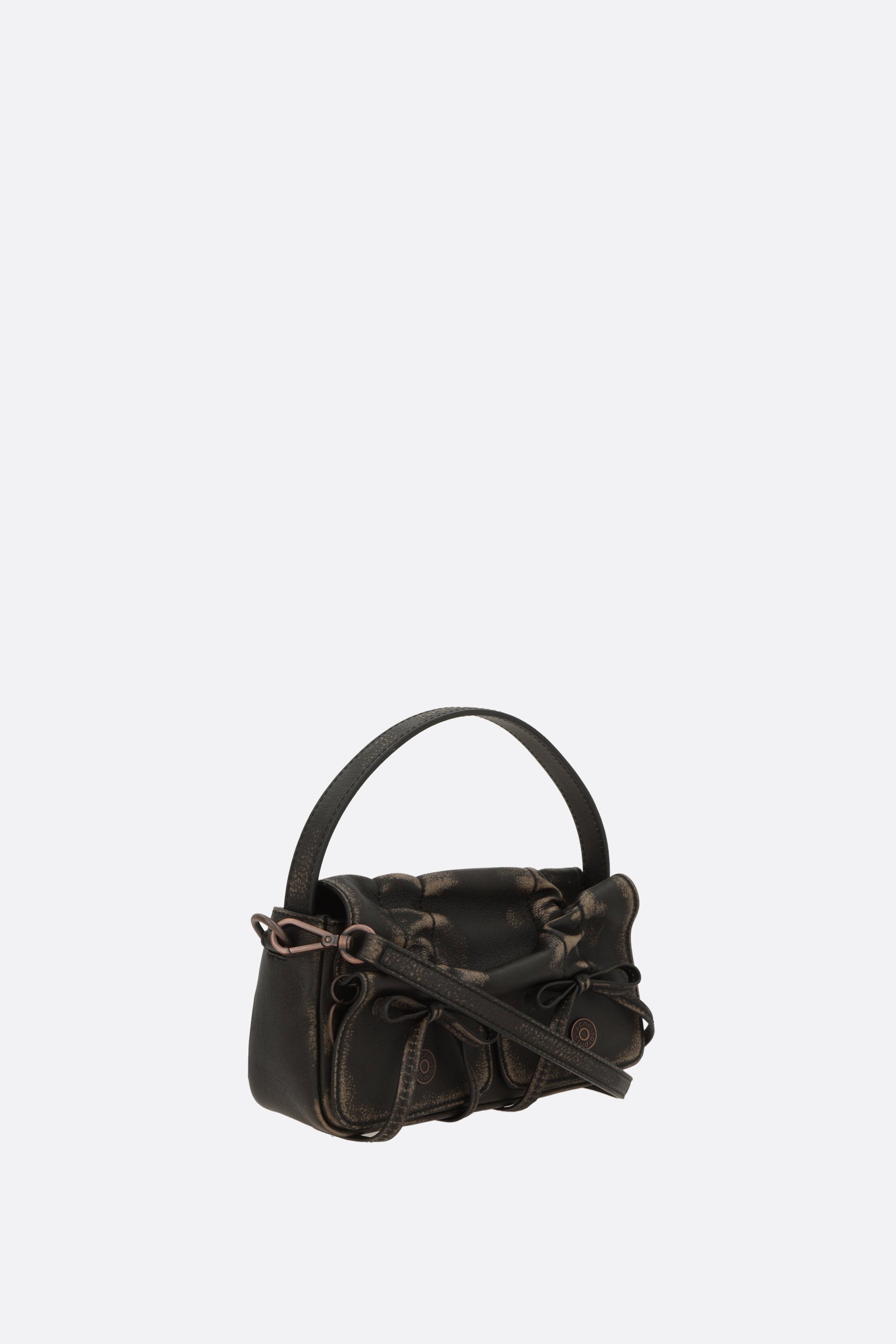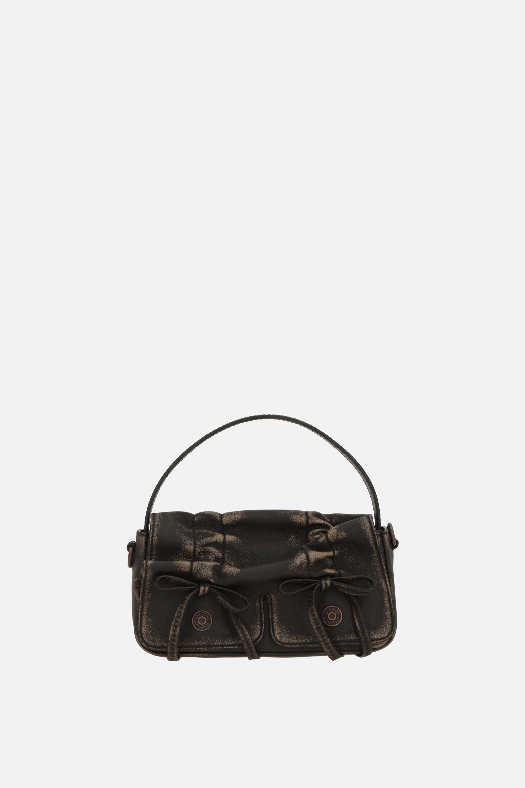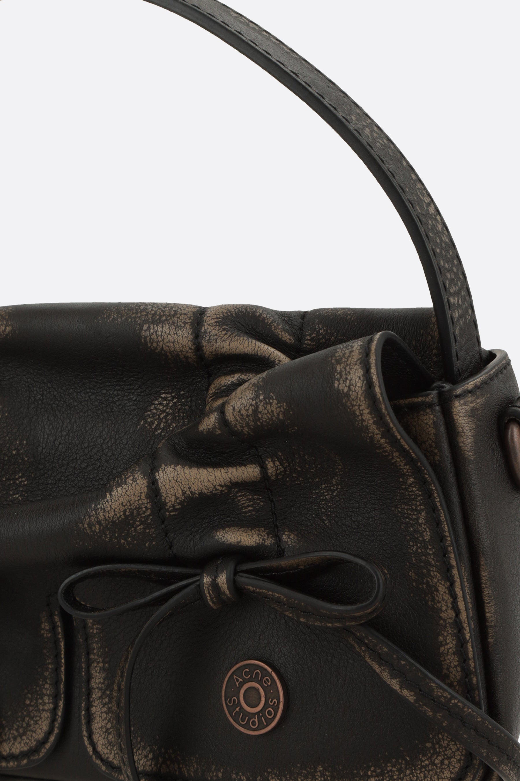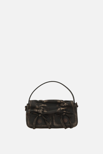 Borsa a mano di Acne Studios realizzata in pelle martellata color marrone scuro con effetto vintage. Caratterizzata da metalleria color bronzo, chiusura con bottoni magnetici su patta, manico piatto con logo lettering a rilievo e spallaccio removibile. L'interno foderato in ecopelle color nero è dotato di due fessure per carte. Completano il design la tasca piatta sul retro e i fiocchi decorativi su patta.