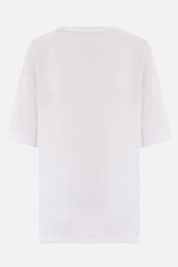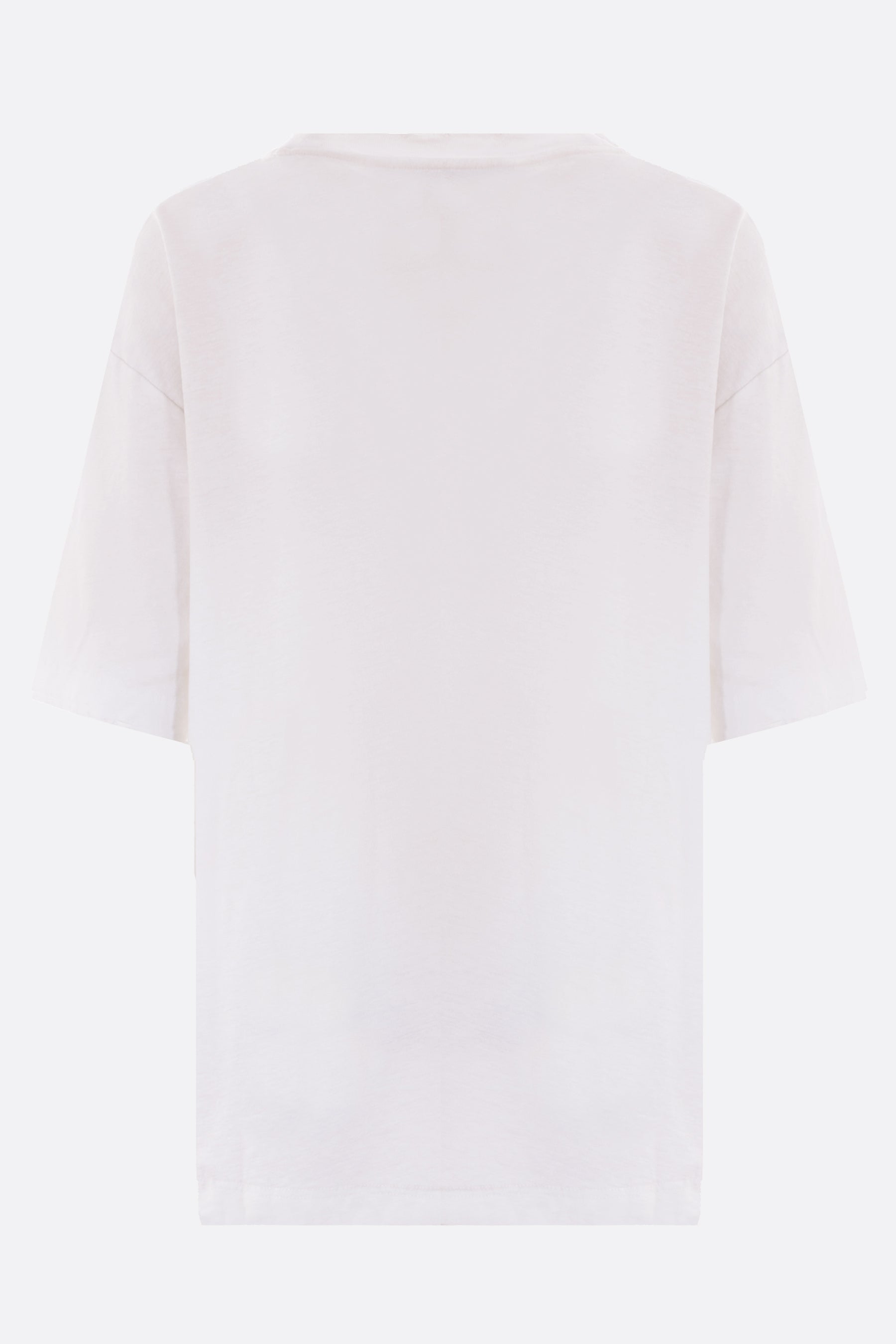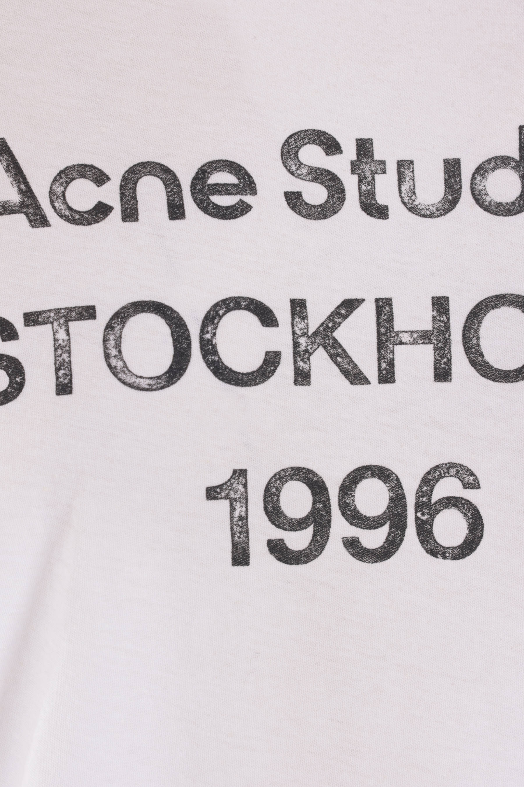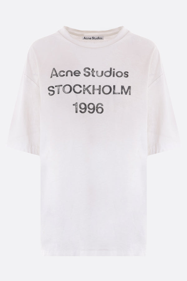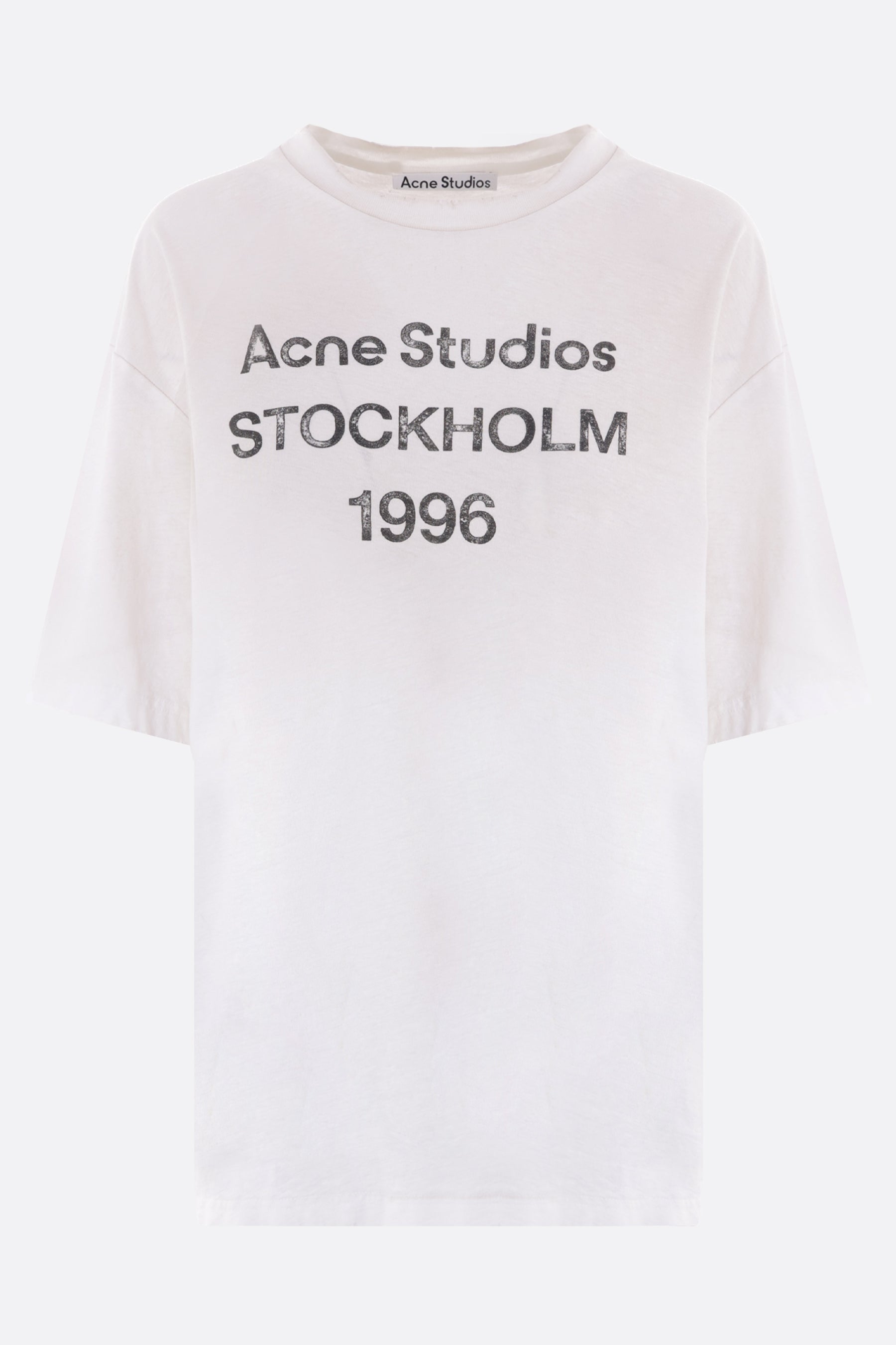 T-shirt di Acne Studios realizzata in jersey di cotone e canapa color bianco polvere con effetto sdrucito e stampa "Acne Studios 1996" frontale. Caratterizzata da scollatura a giro, maniche corte e fondo dritto.