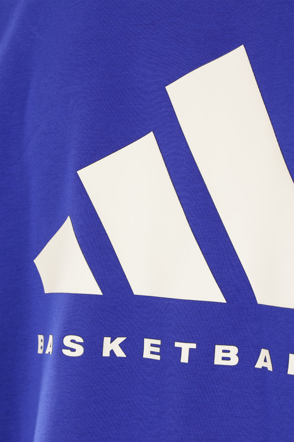 Felpa di adidas realizzata in pile riciclato color blu elettrico con stampa logo al petto e stampa logo Basketball sul retro. Caratterizzata da colletto rialzato, maniche lunghe, tasche laterali e bordi a costine.