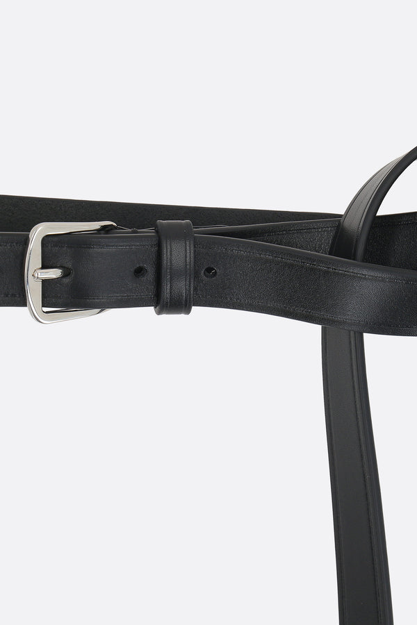 Cintura sottile di Ann Demeulemeester realizzata in pelle liscia color nero con estremità da annodare. Caratterizzata da chiusura regolabile con fibbia in metallo color argento.