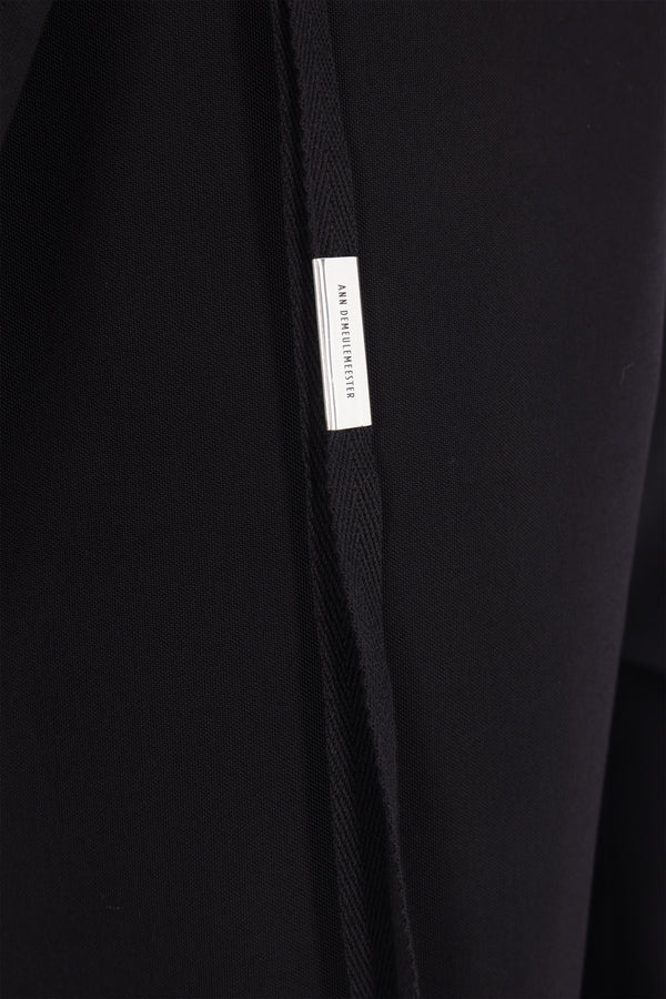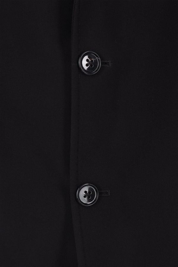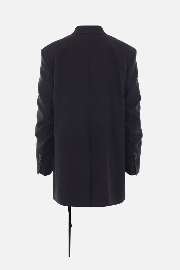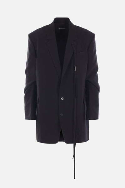 Giacca monopetto di Ann Demeulemeester realizzata in viscosa color nero. Caratterizzata da rever classico, chiusura frontale con bottoni, spalline imbottite, tasche frontali, maniche lunghe con polsini abbottonati, spacco centrale sul retro e interno foderato. Completa il design il laccio decorativo frontale con placca logo in metallo.