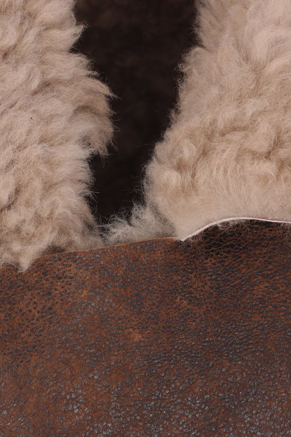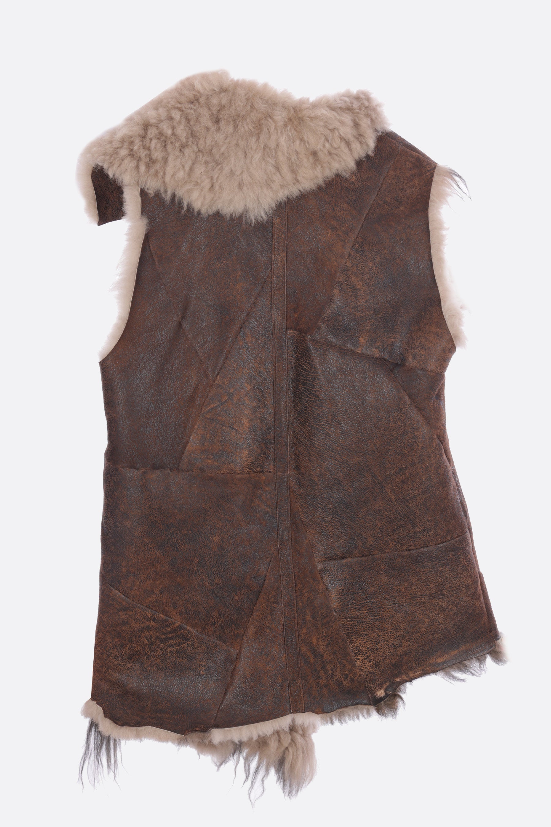 Gilet asimmetrico di Ann Demeulemeester realizzato in shearling color marrone. Caratterizzato da collo asimmetrico, chiusura decentrata con lacci, bordi tagliati a vivo e fondo asimmetrico.