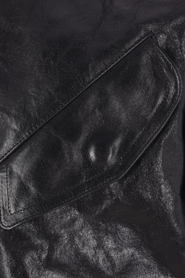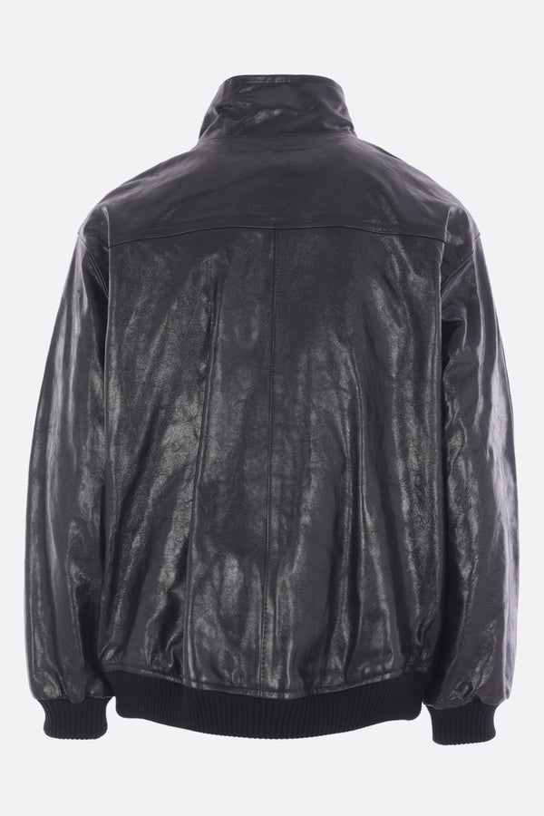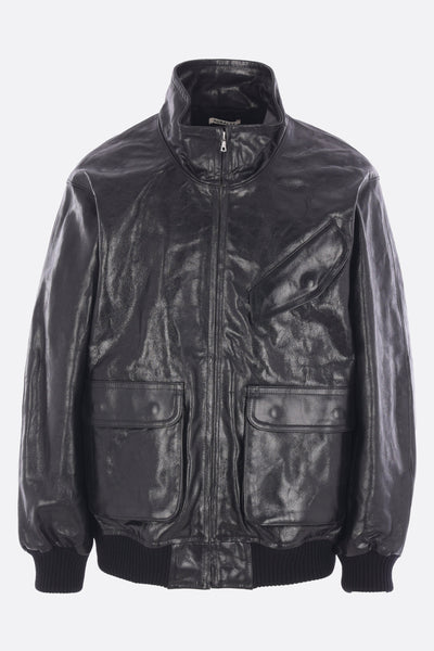 Bomber di Auralee realizzato in pelle lucida color nero. Caratterizzato da collo alto, chiusura frontale con zip, tasche frontali con patta, maniche lunghe e bordi in maglia a costine. Interno foderato.