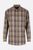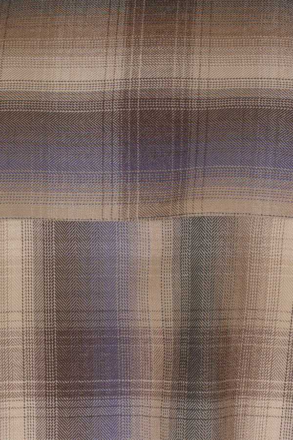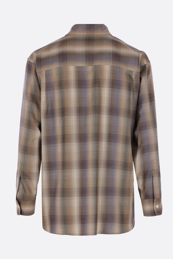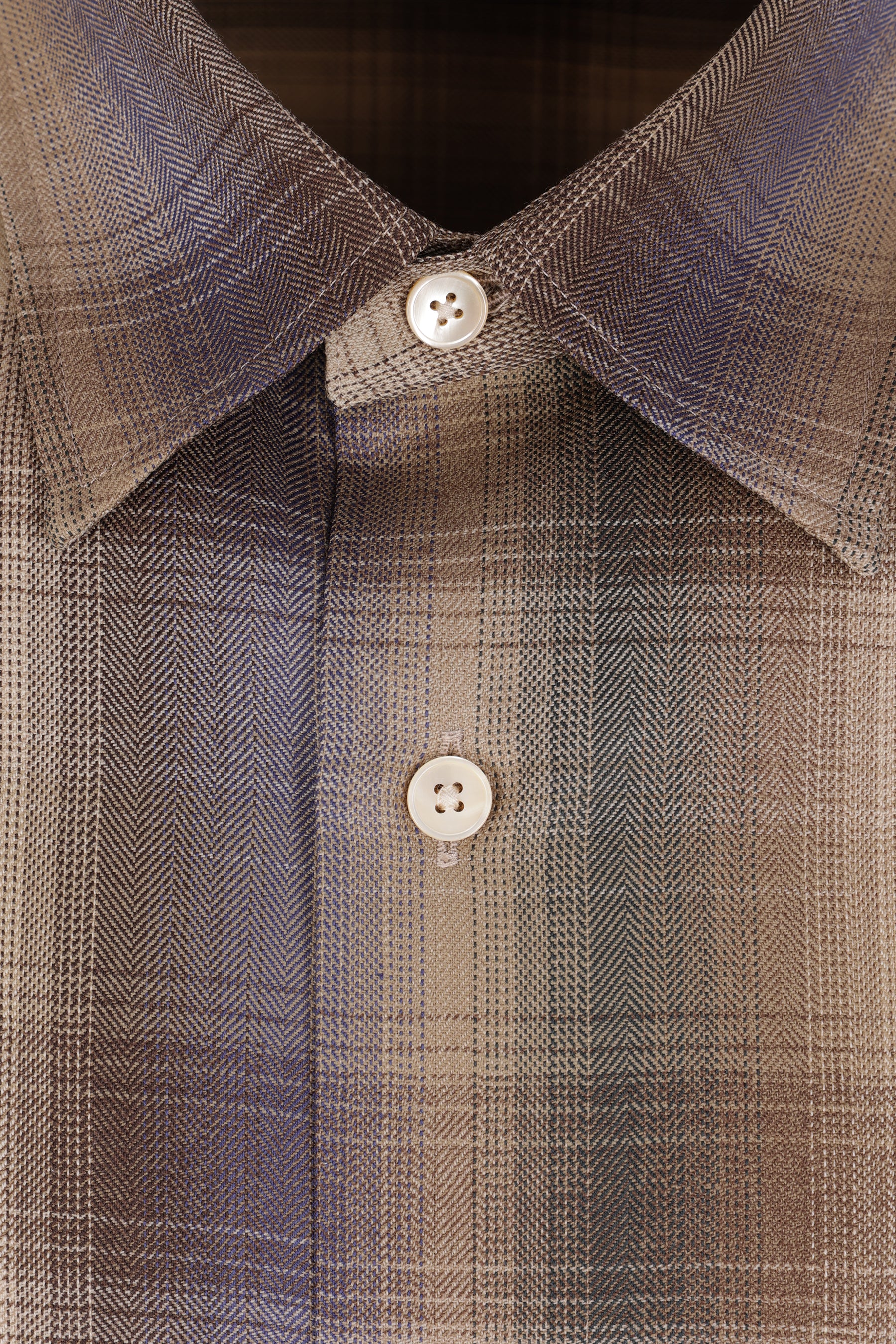 Camicia di Auralee realizzata in lana leggera con motivo check nei toni del marrone e azzurro. Caratterizzata da colletto a punta, chiusura frontale con bottoni, tasca applicata sul petto, maniche lunghe con polsini abbottonati e fondo arrotondato.