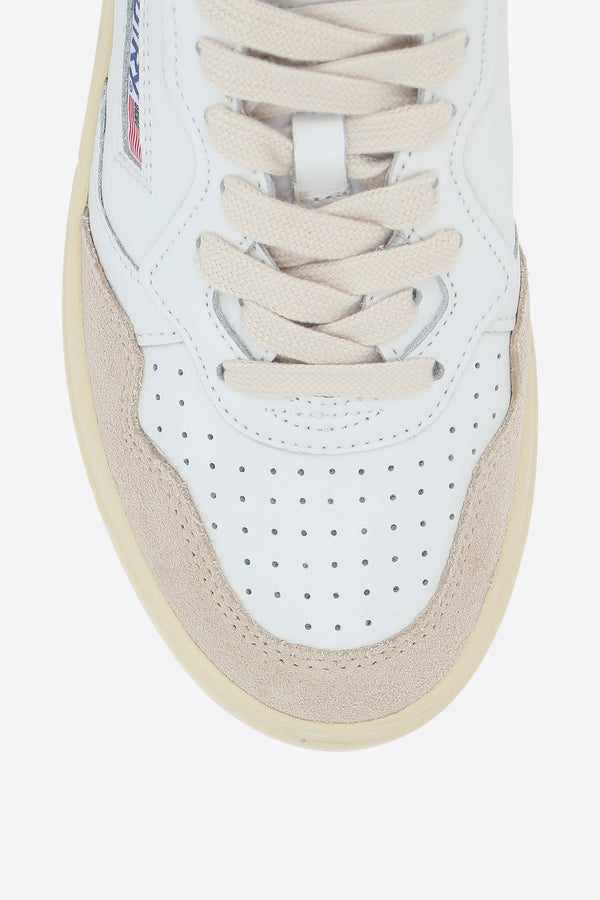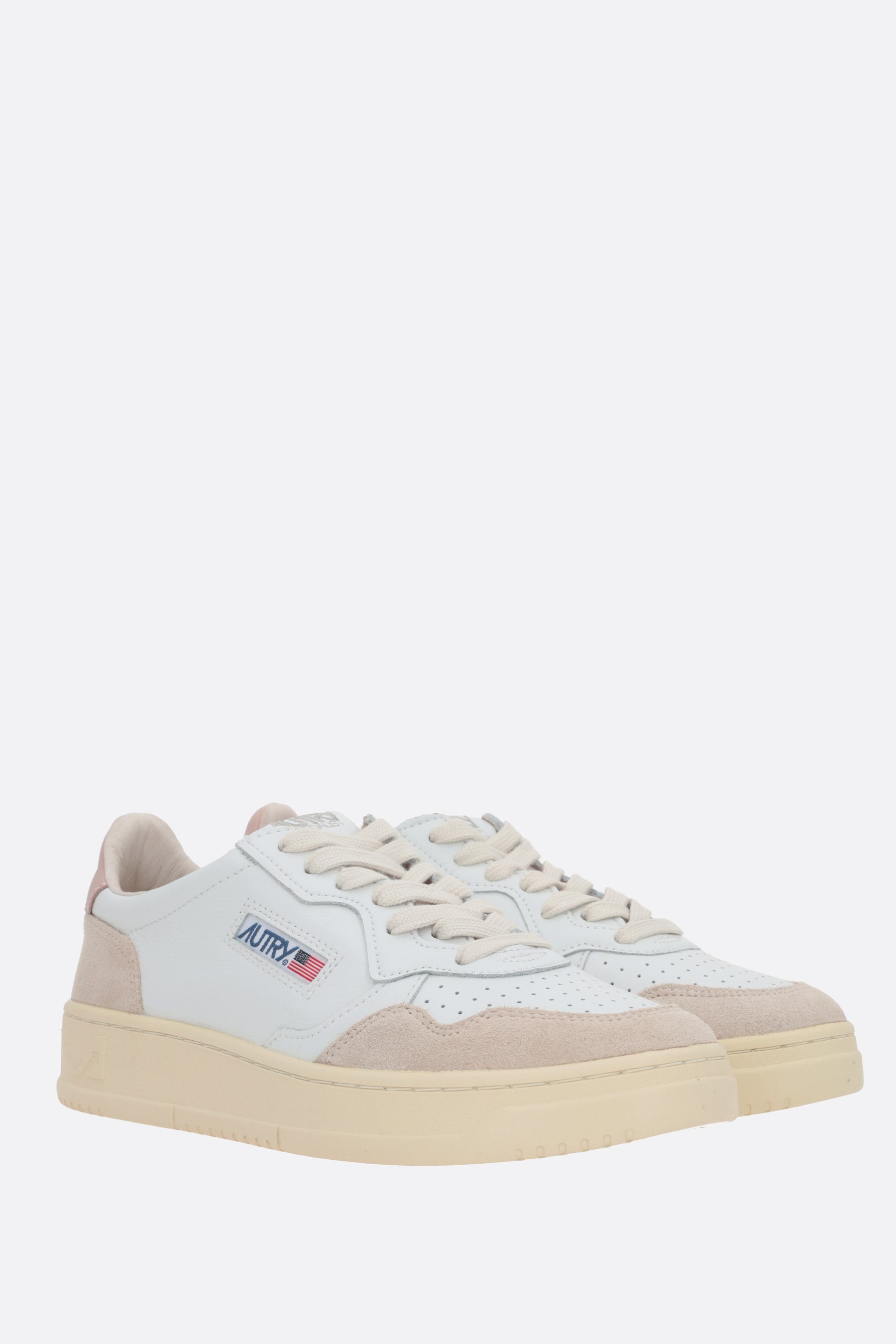 Sneaker low-top di Autry realizzata in pelle liscia color bianco e suede color grigio chiaro con dettaglio traforato sulla punta. Caratterizzata da chiusura con lacci, punta tonda, fodere in pelle / tessuto e suola in gomma. Completano il design l'inconfondibile etichetta logo sulla linguetta, l'etichetta logo laterale e la tallonetta in pelle color rosa con logo impresso.