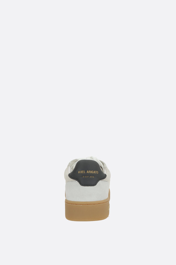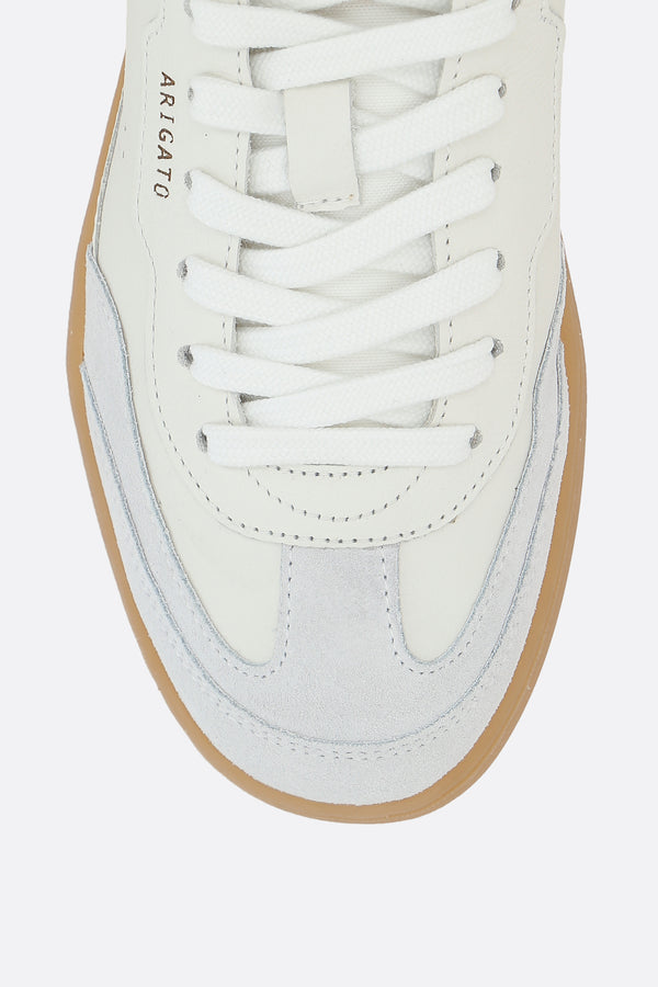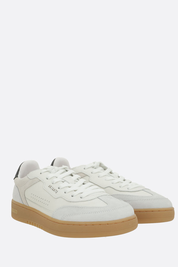 Sneaker low-top di Axel Arigato realizzata in pelle liscia color bianco e suede color ghiaccio con dettagli traforati. Caratterizzata da chiusura con lacci, punta tonda, fodere in tessuto e suola in gomma riciclata. Completano il design la tallonetta a contrasto con logo impresso e l'etichetta logo applicata sulla linguetta in nylon.