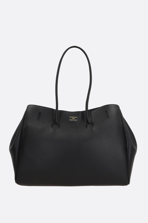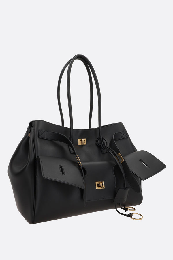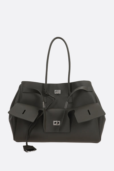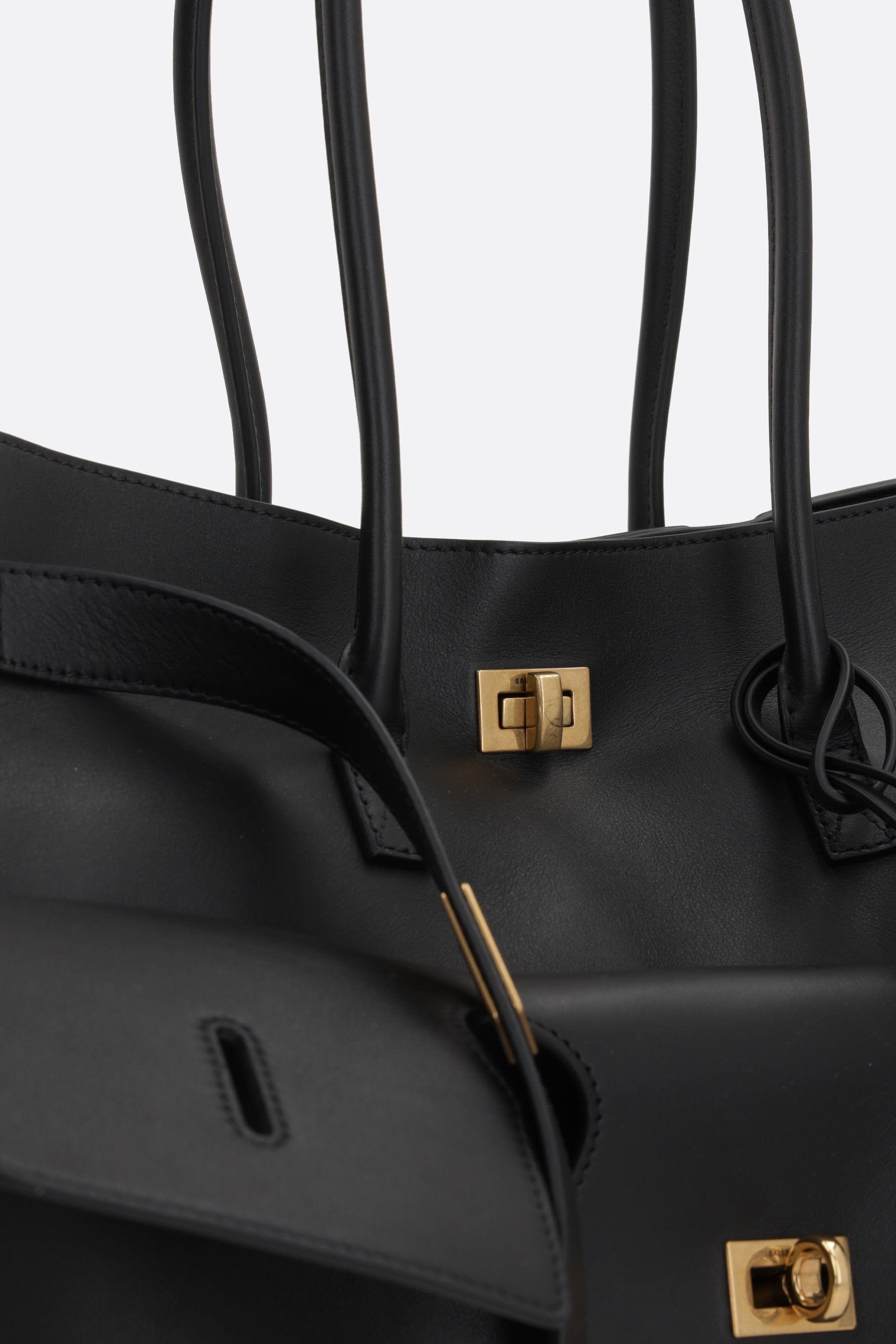 Borsa a mano di Balenciaga realizzata in pelle liscia color nero con logo lettering impresso sul retro. Caratterizzata da metalleria color oro anticato, doppio manico, piedini protettivi in metallo, bottoni automatici laterali per regolare l'ampiezza e interno foderato in pelle color nero con tasca con zip. Completano il design l'ampia tasca frontale con patte decorative, due anelli portachiavi con custodia in pelle e il cinturino frontale con chiusura a girello.
