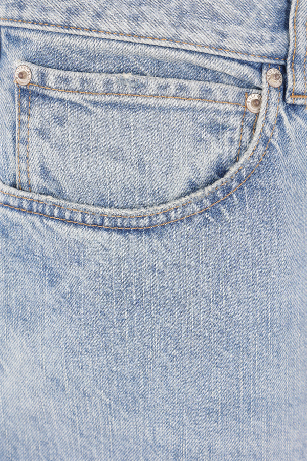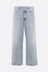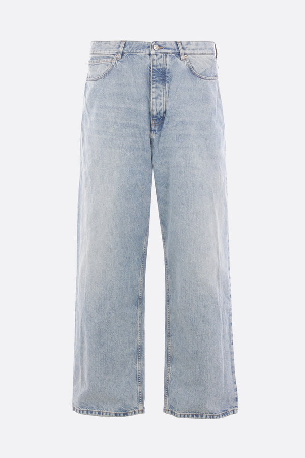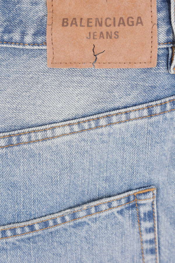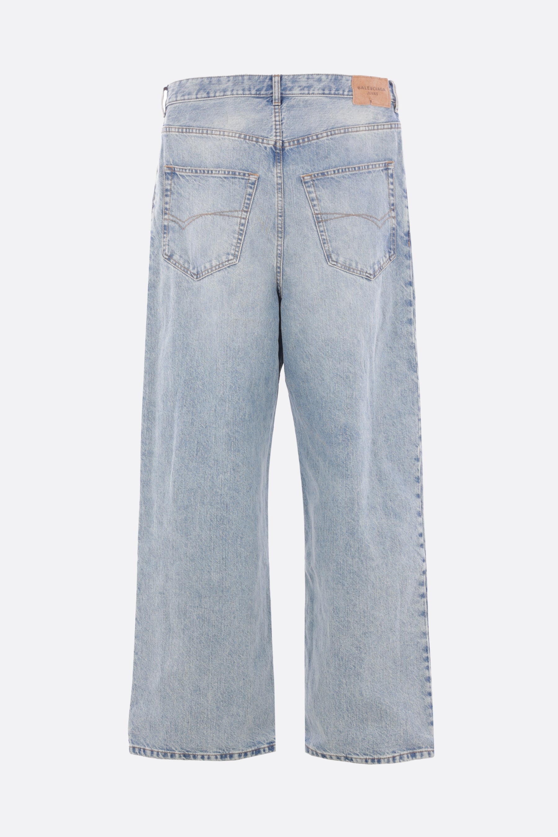 Jeans baggy oversize di Balenciaga realizzato in denim di cotone color azzurro. Caratterizzato da chiusura frontale con bottoni metallici, passanti per cintura, cinque tasche classiche e patch logo sul retro.