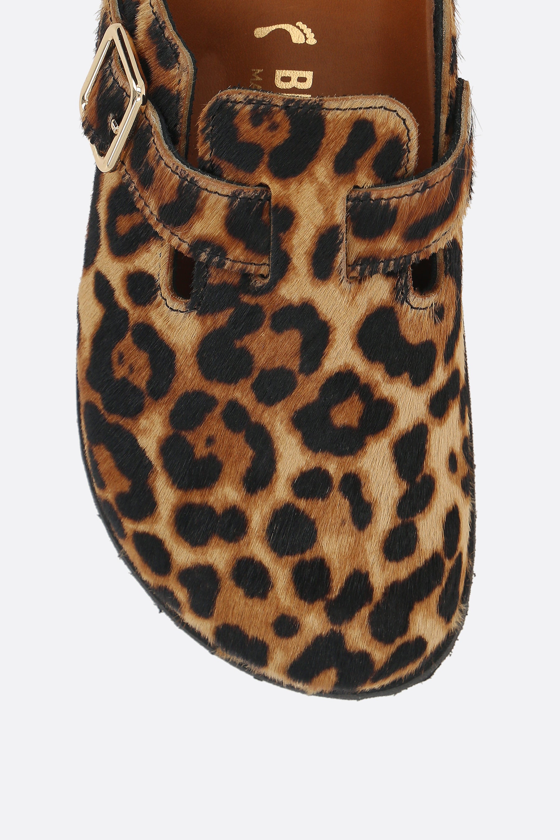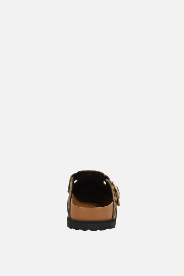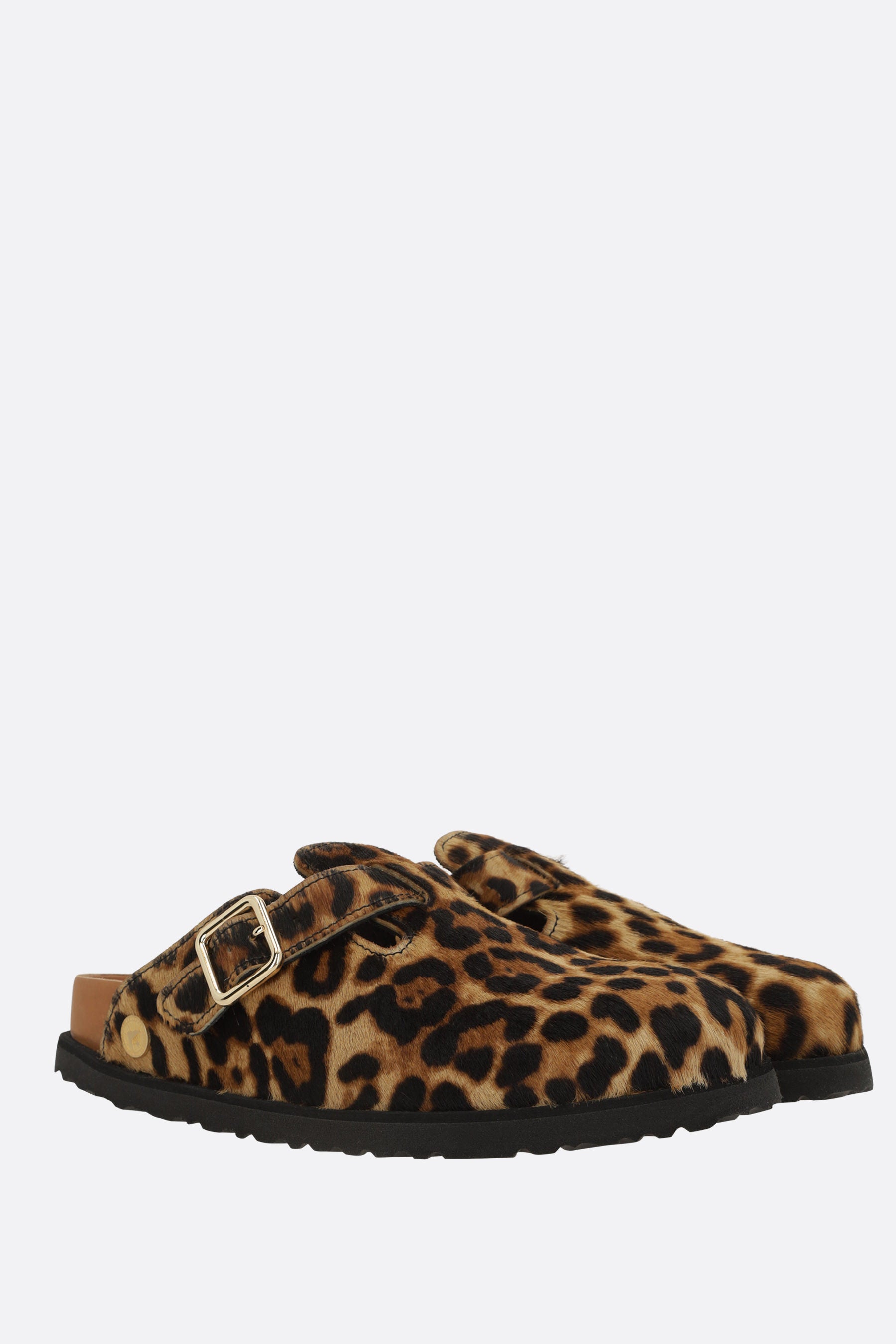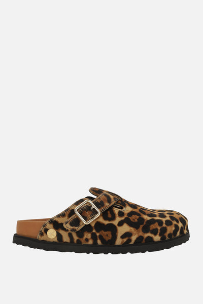 Mule flat di Birkenstock 1774 realizzata in cavallino stampa leopardo. Caratterizzata da punta tonda, cinturino regolabile con fibbia metallica, fodere in pelle e suola leggera in gomma EVA. Completa il design l'iconico logo metallico applicato lateralmente.