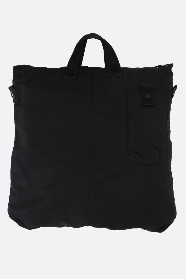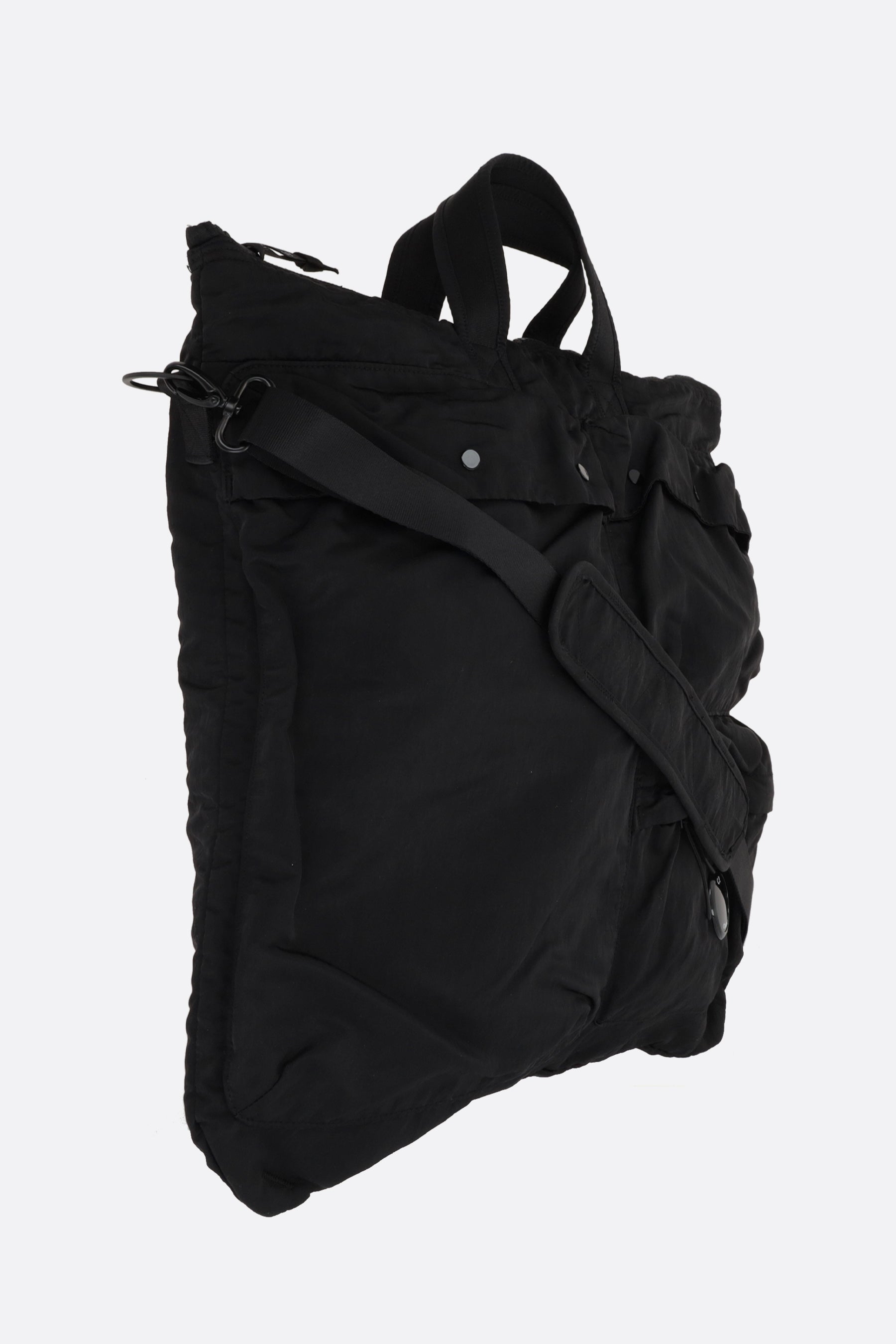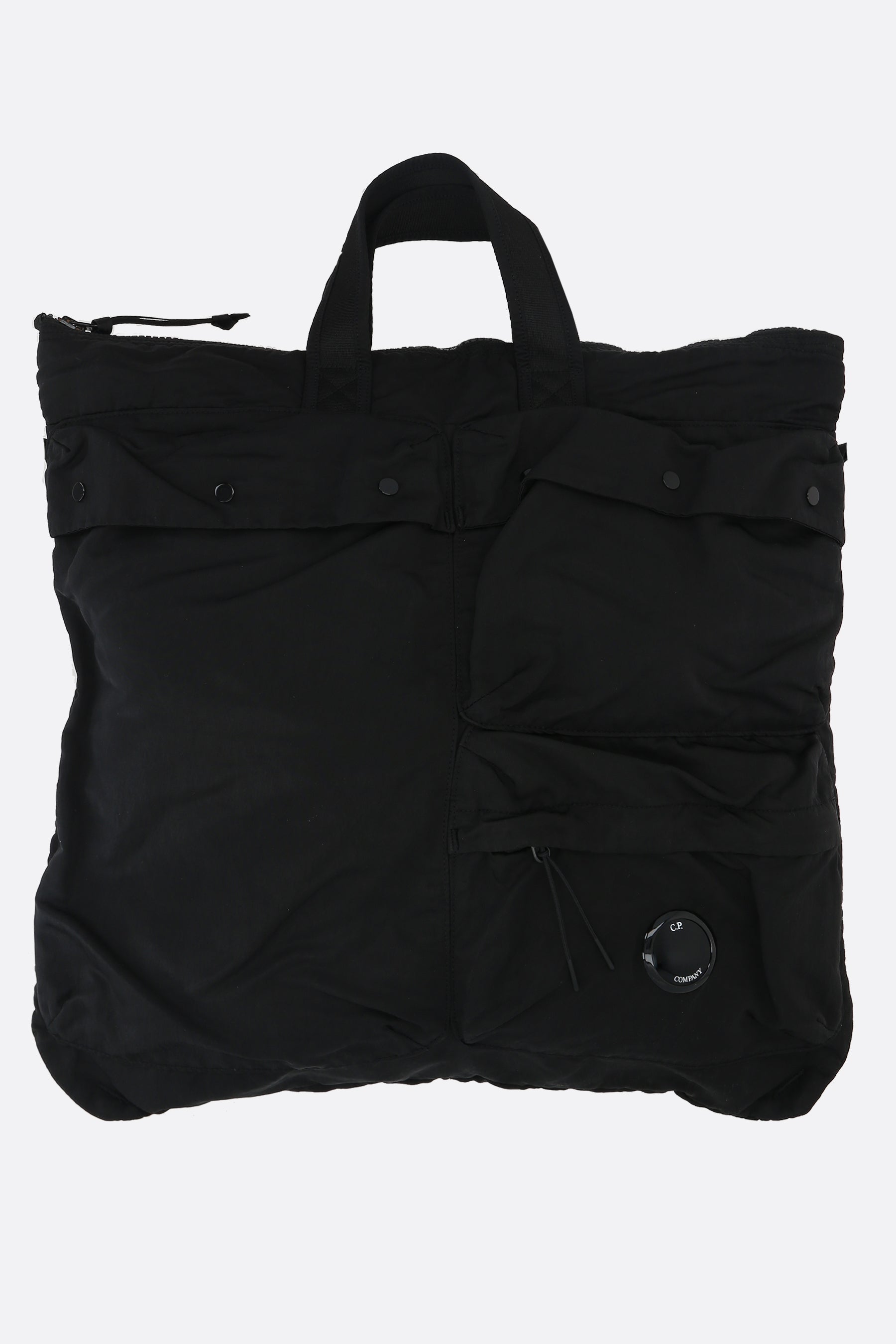 Borsa tote di C.P. Company realizzata in Nylon B color nero con dettaglio C.P. Company Lens. Caratterizzata da metalleria nera, chiusura con zip, doppio manico e tracolla regolabile / removibile. L'interno foderato in nylon tono su tono è dotato di tasca in mesh e tasca con zip. Completano il design numerose tasche esterne.
