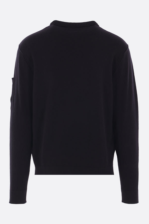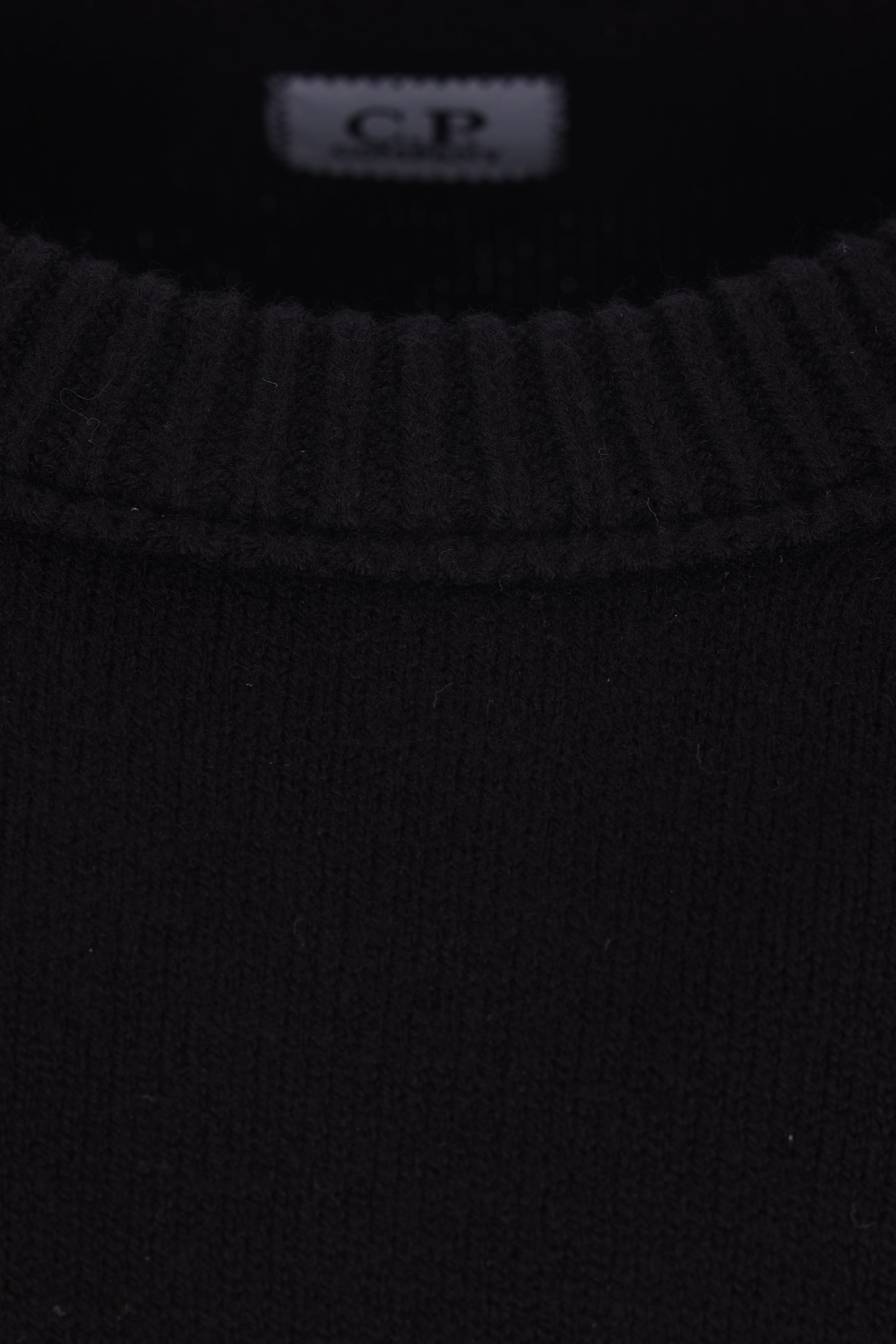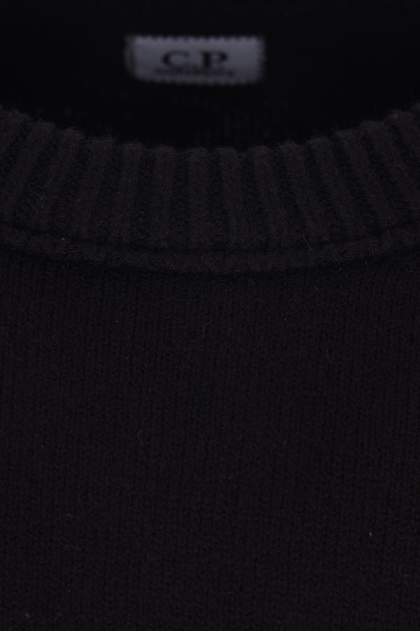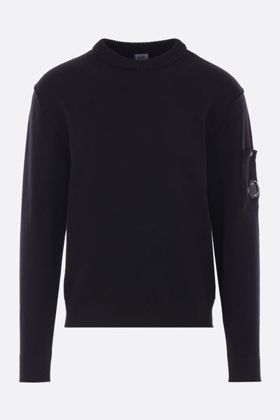 Pullover di C.P. Company realizzato in maglia di misto cotone color nero con tasca sulla manica sinistra arricchita dal dettaglio C.P. Company Lens. Caratterizzata da scollatura a giro, maniche lunghe, bordi a costine e fondo dritto.