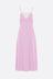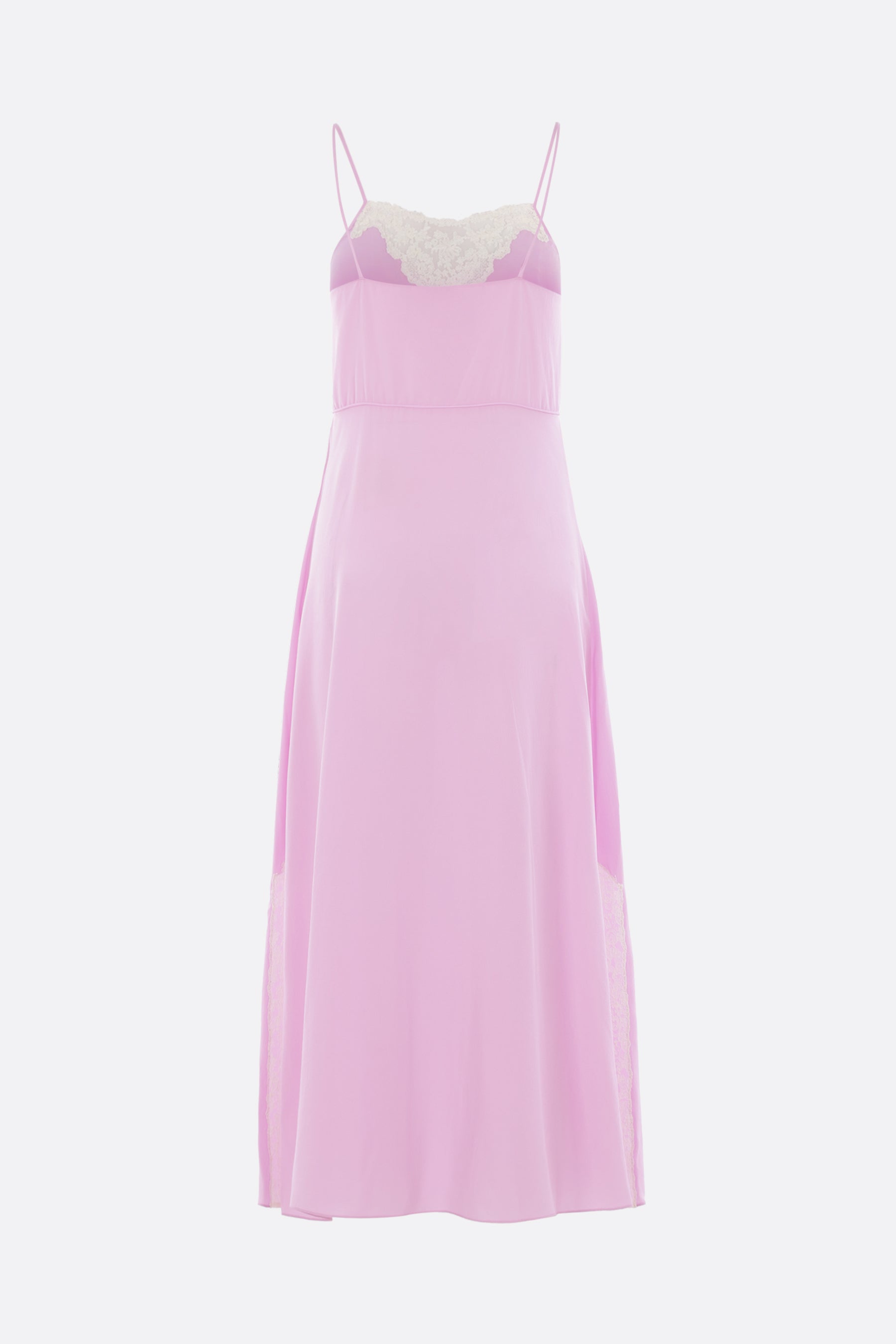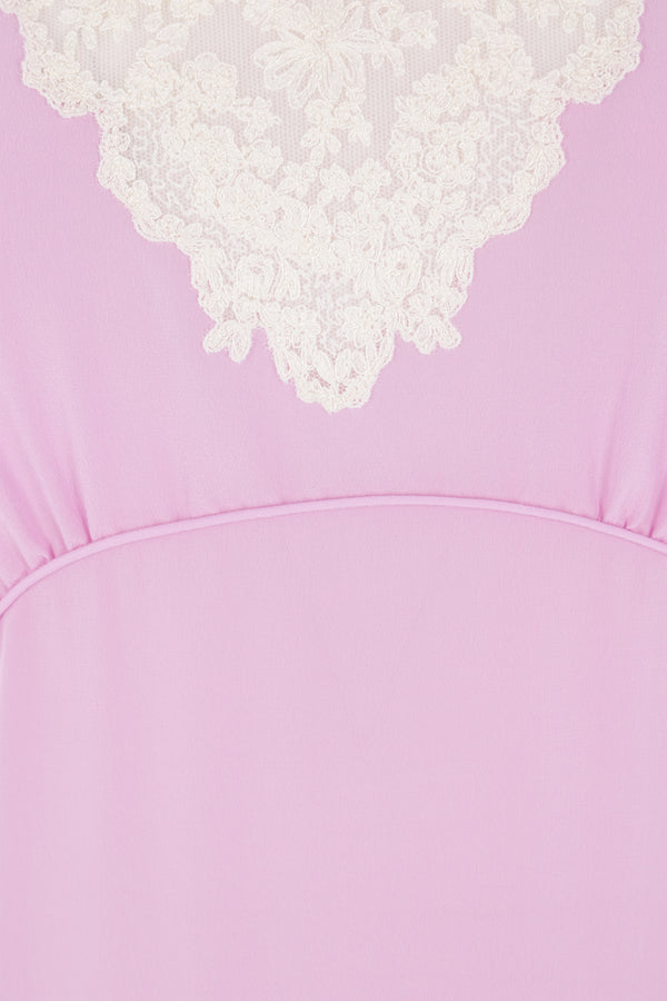 Abito midi di Chloé realizzato in crêpe de chine di seta color lilla con inserti in pizzo floreale color crema. Caratterizzato da scollatura a cuore, spalline sottili e spacchi laterali.